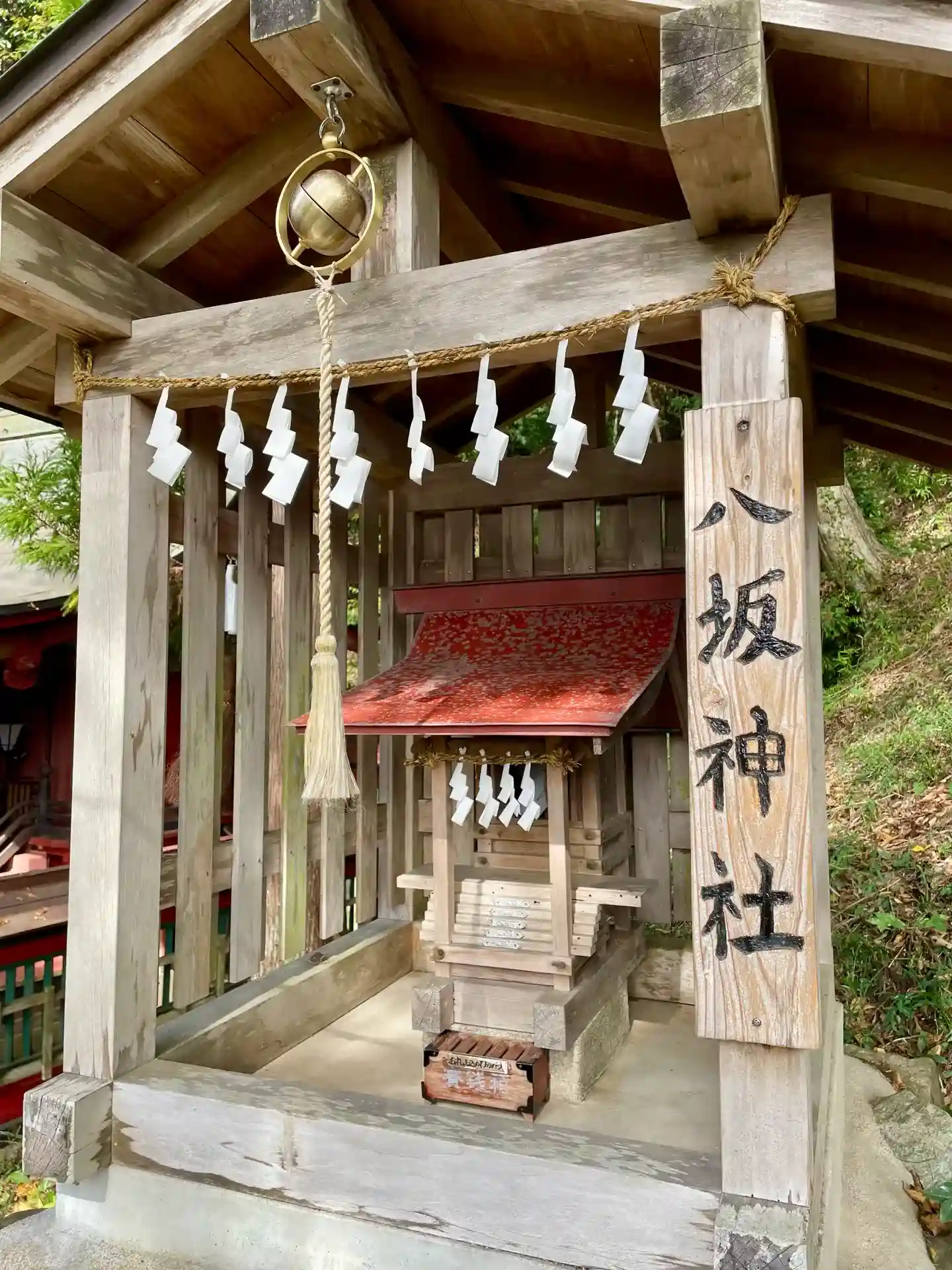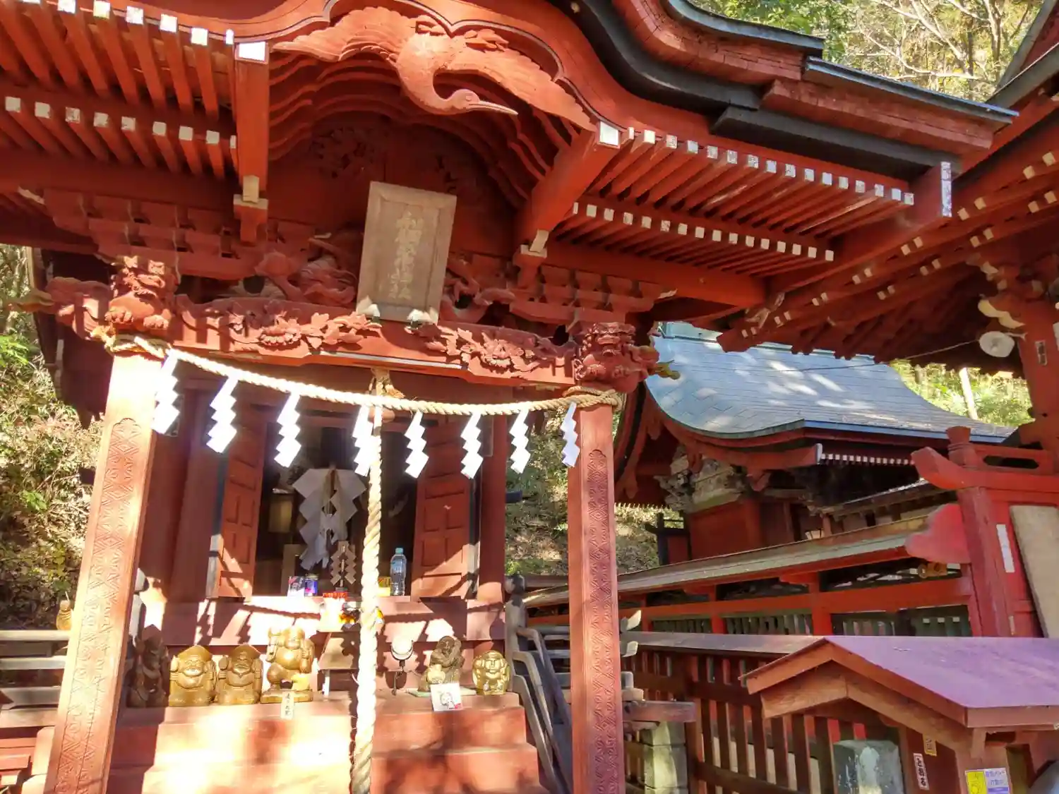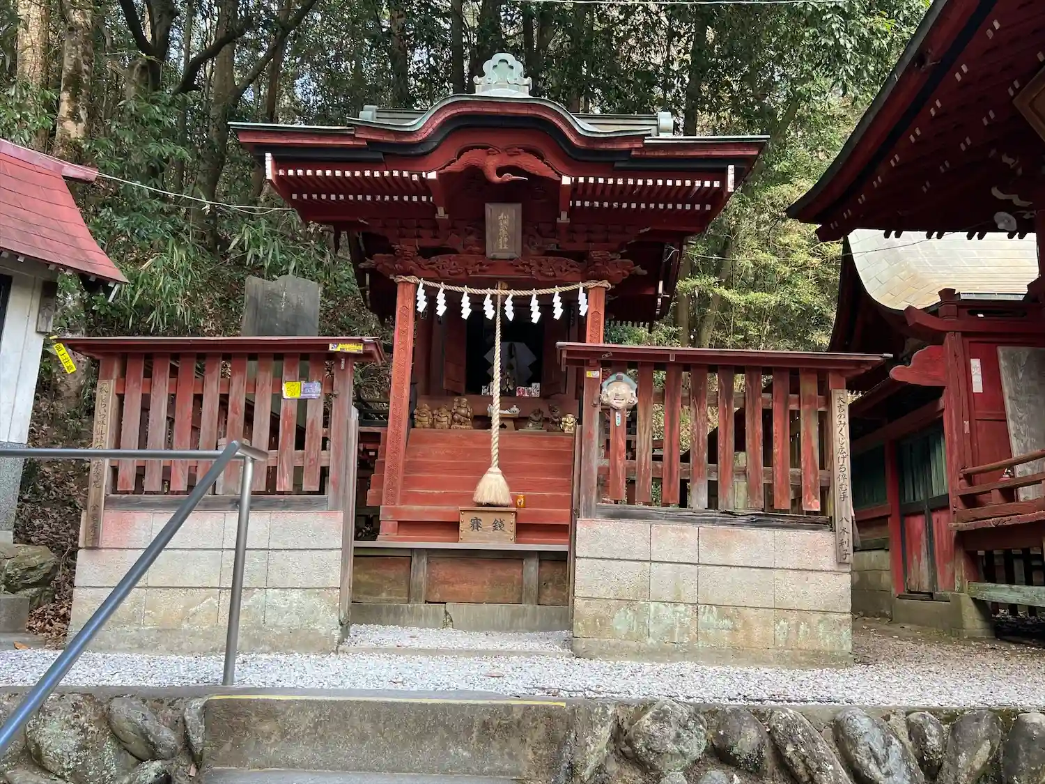 拝殿の右側。<和銅鉱物館>と書かれた建物と境内社が見える。