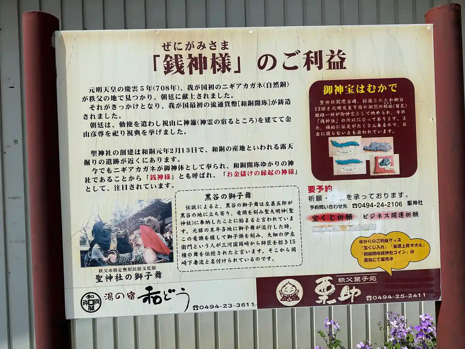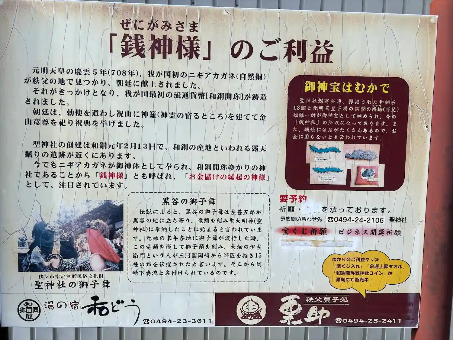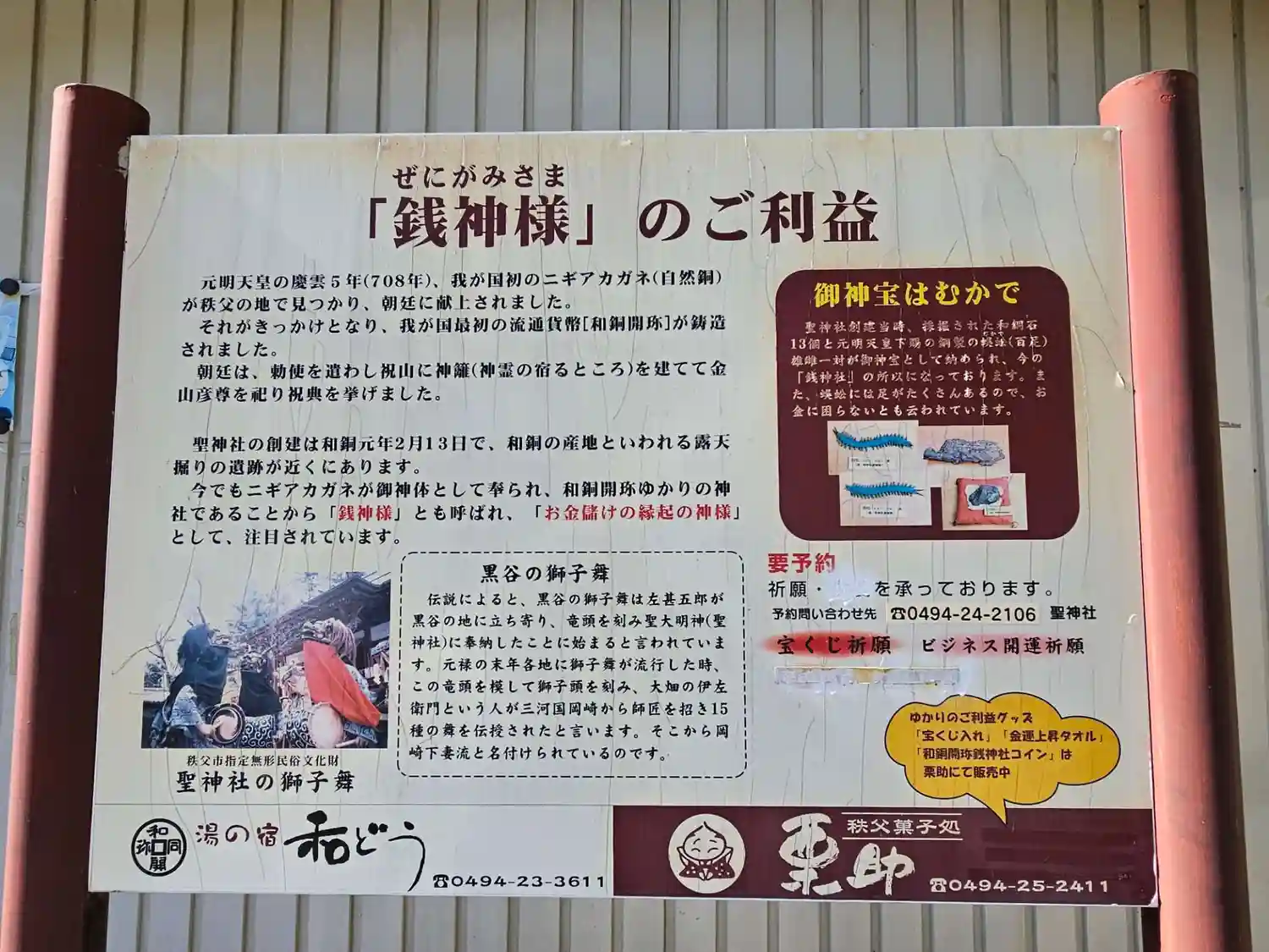 秩父の社を巡りました。こちらの地域で発見された銅塊が和同開珎の起源とのことです。元明天皇御下賜の和…