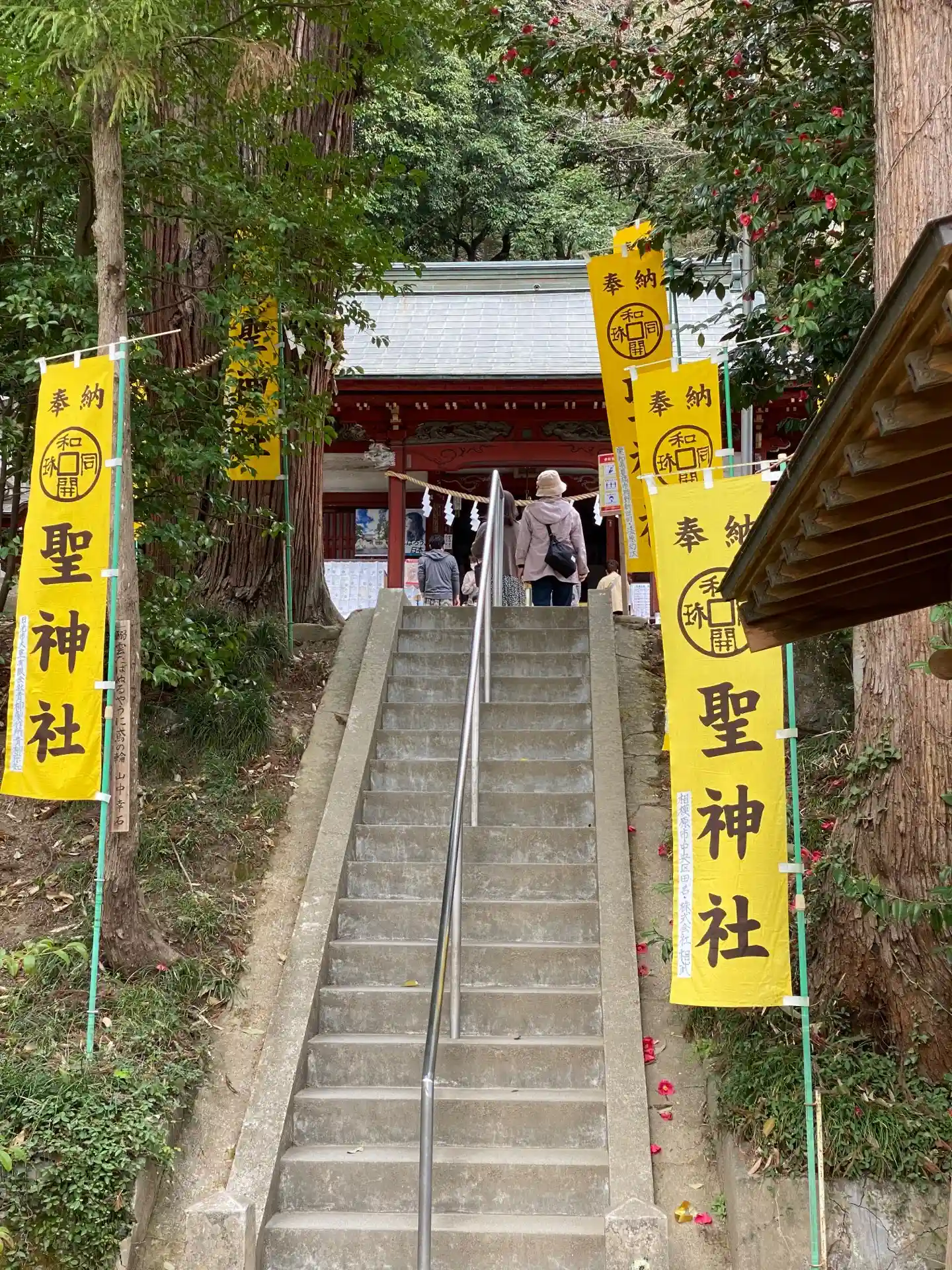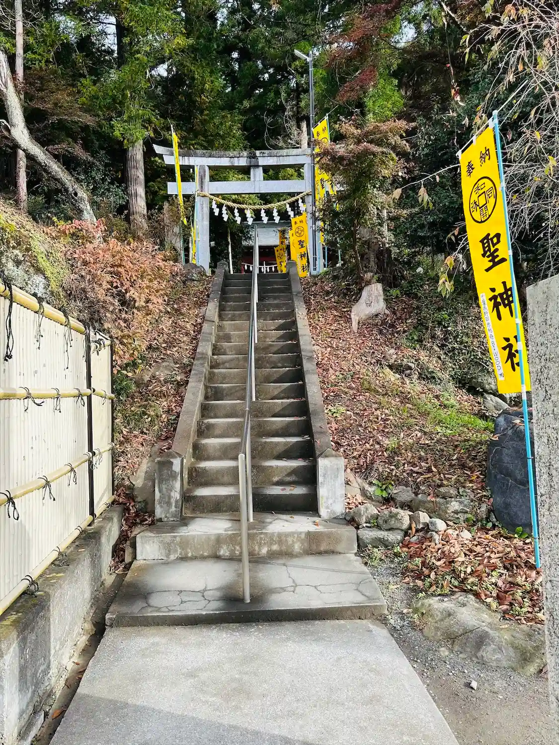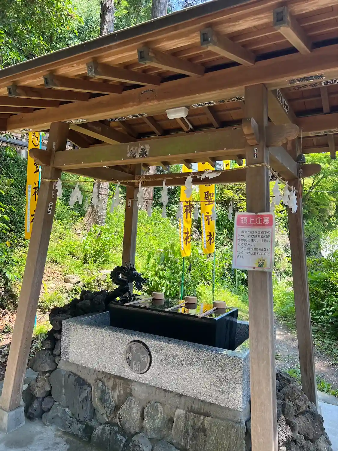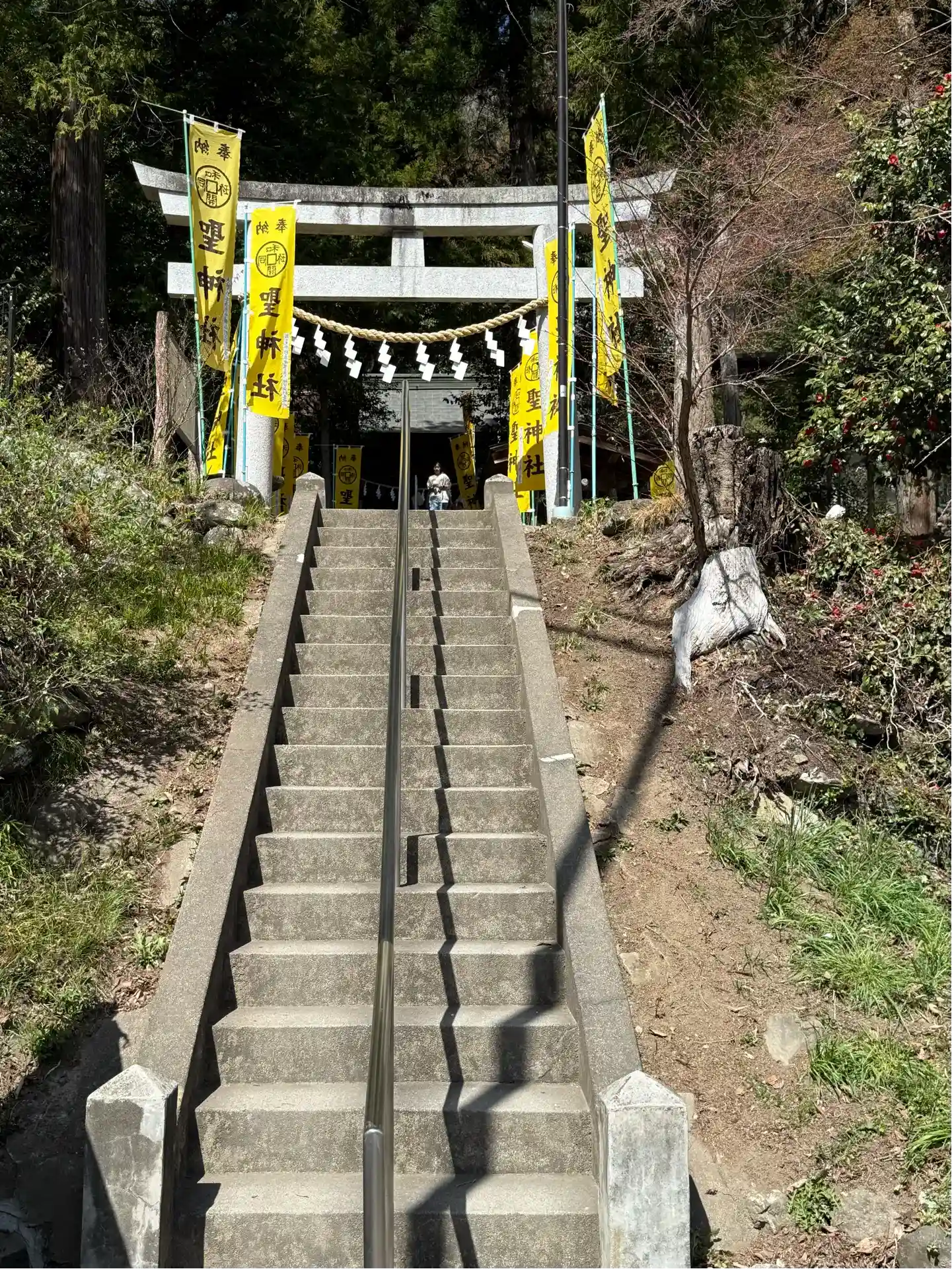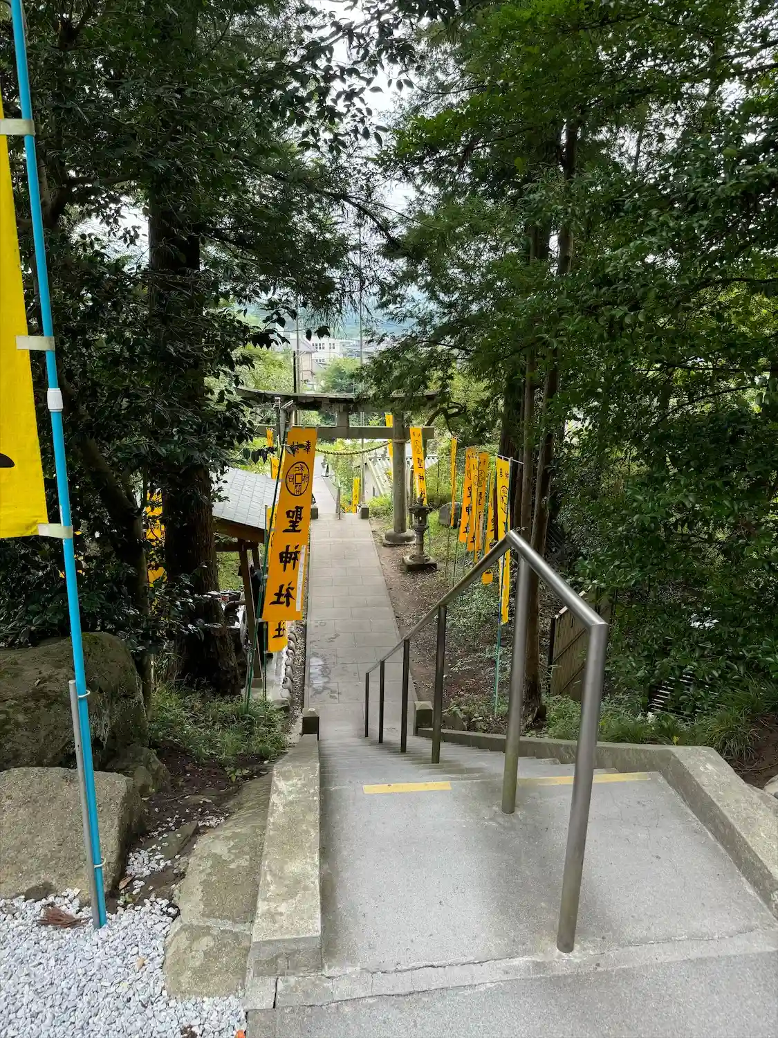 手水舎と階段 黄色い幟がぱっと明るくて元気が出る気がします。