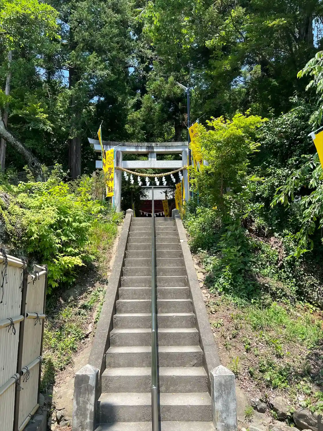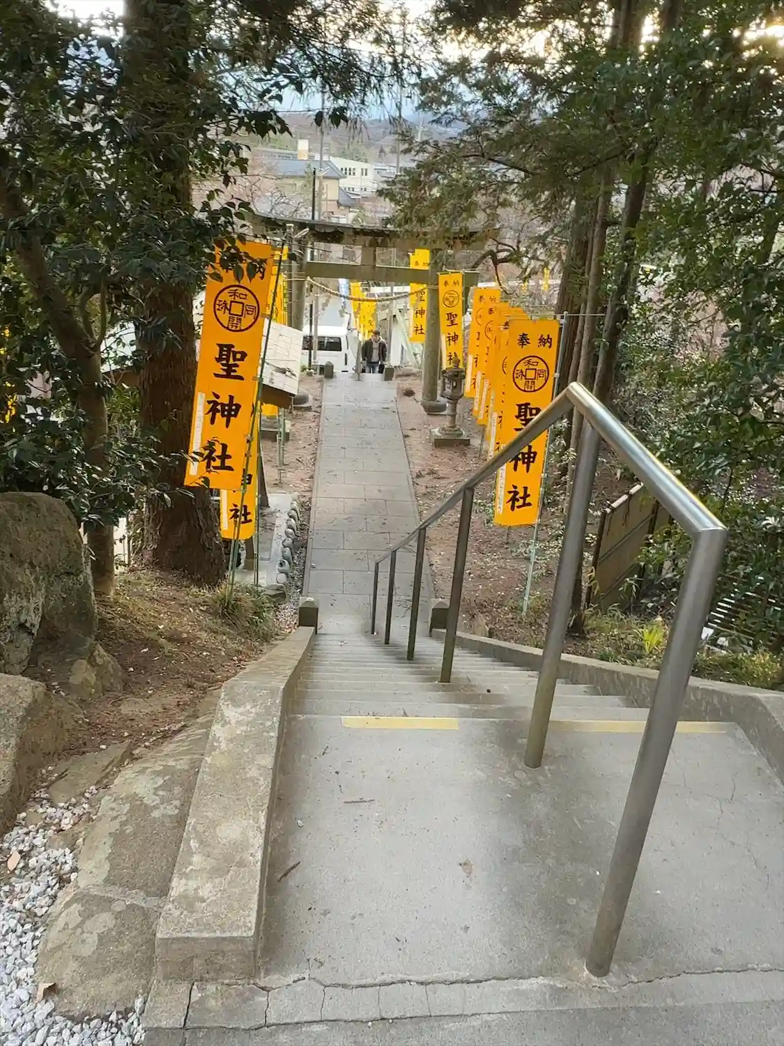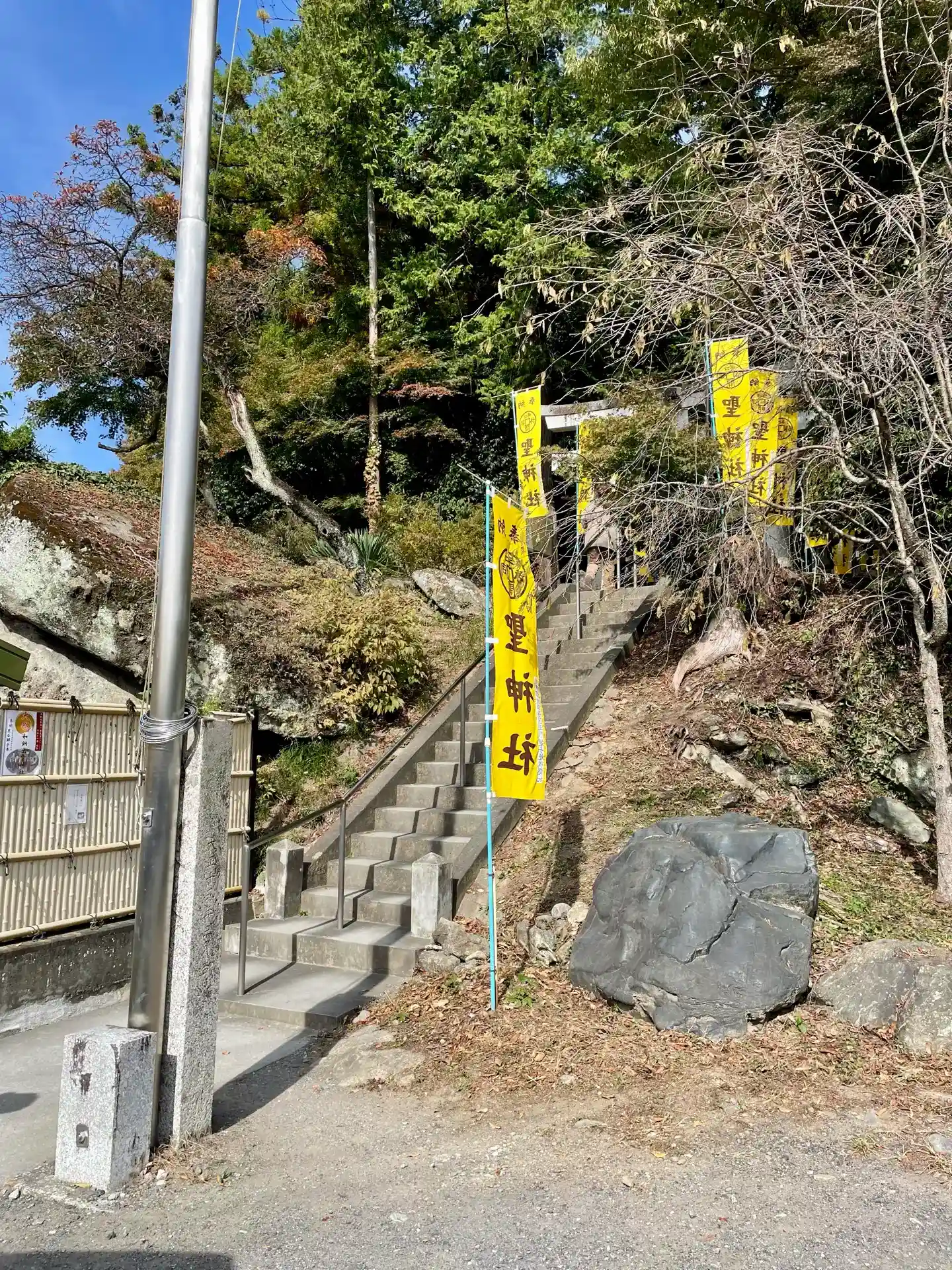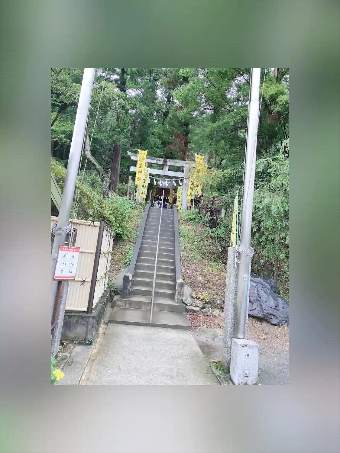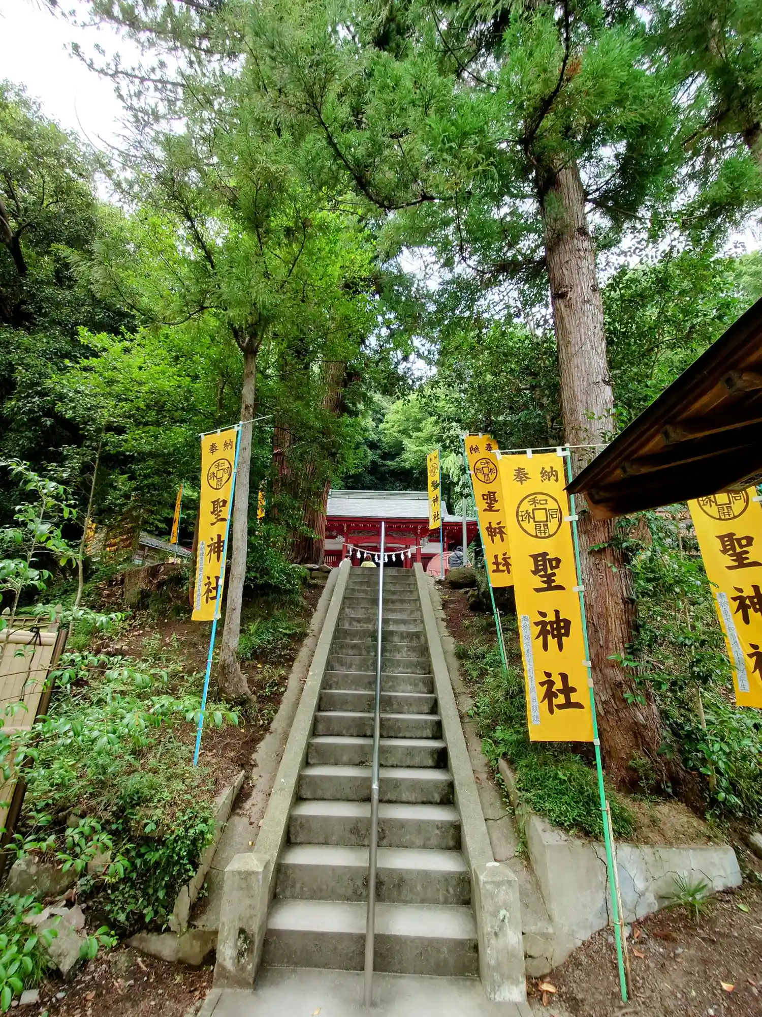 手水舎と階段 黄色い幟がぱっと明るくて元気が出る気がします。