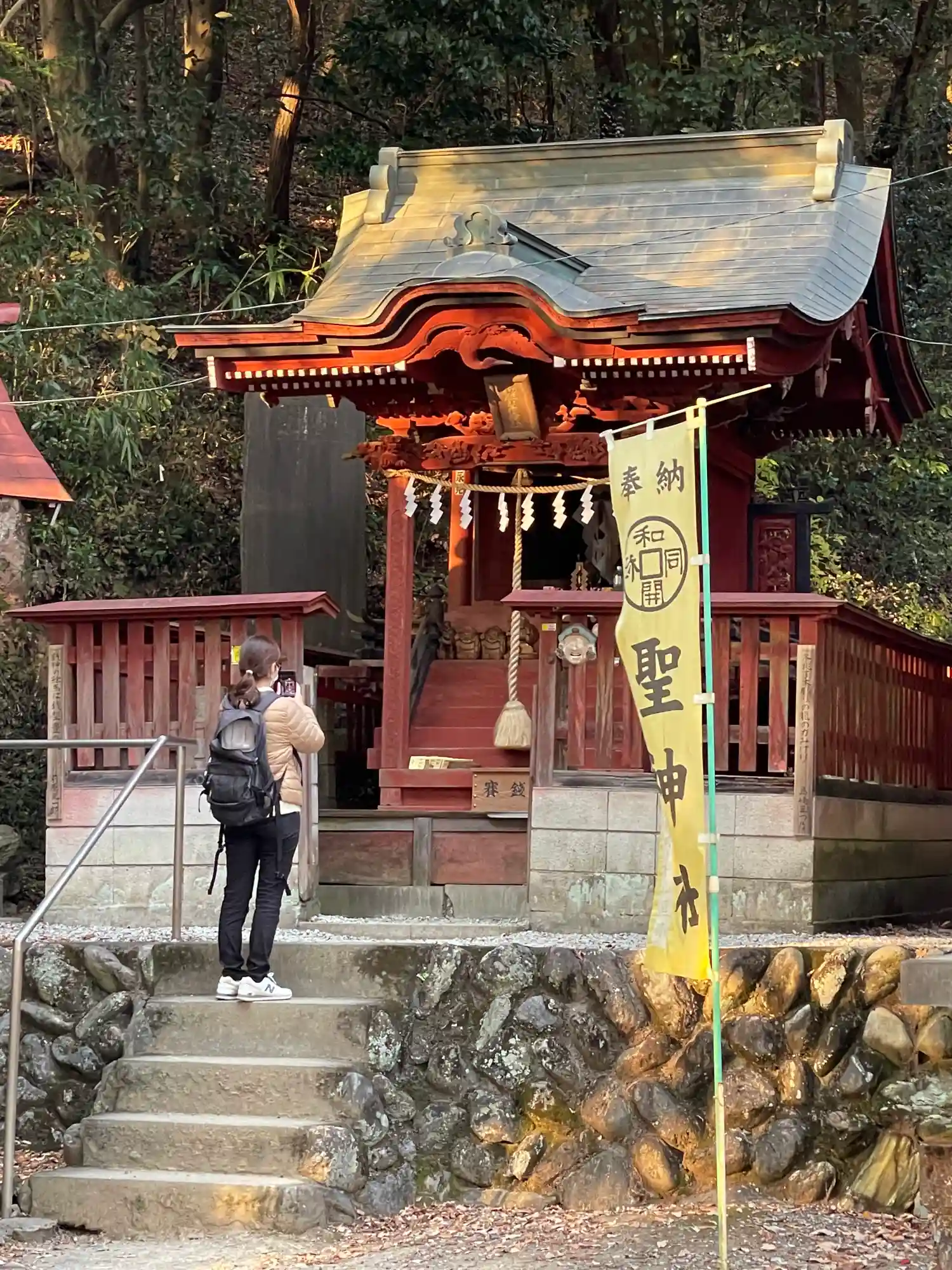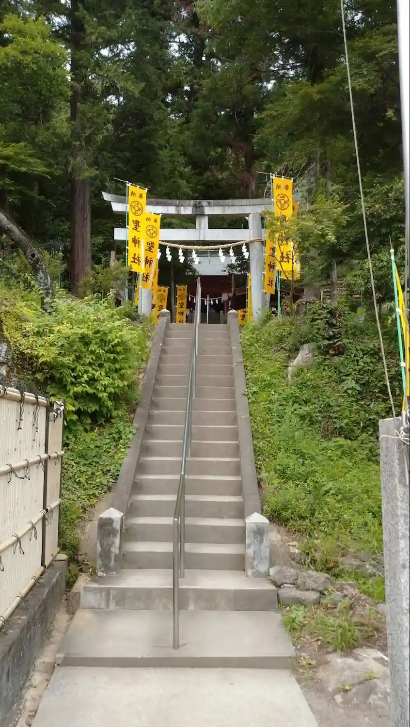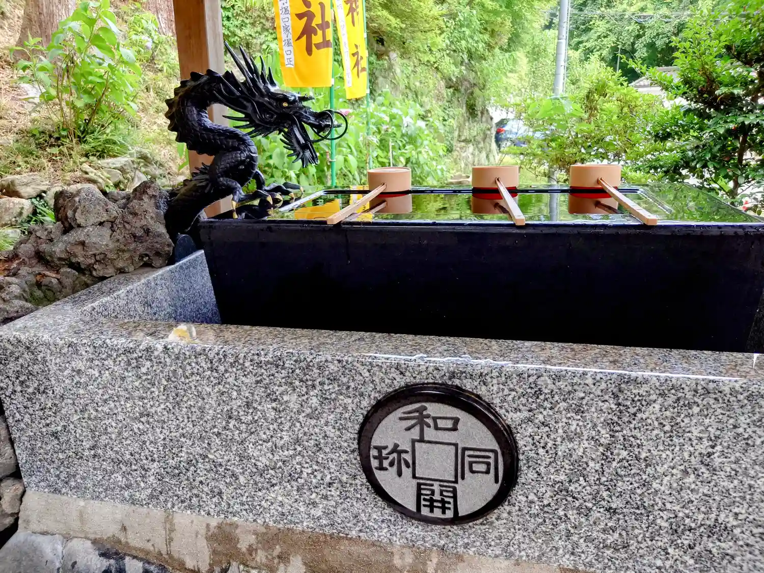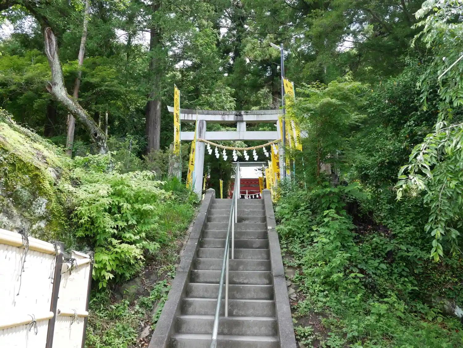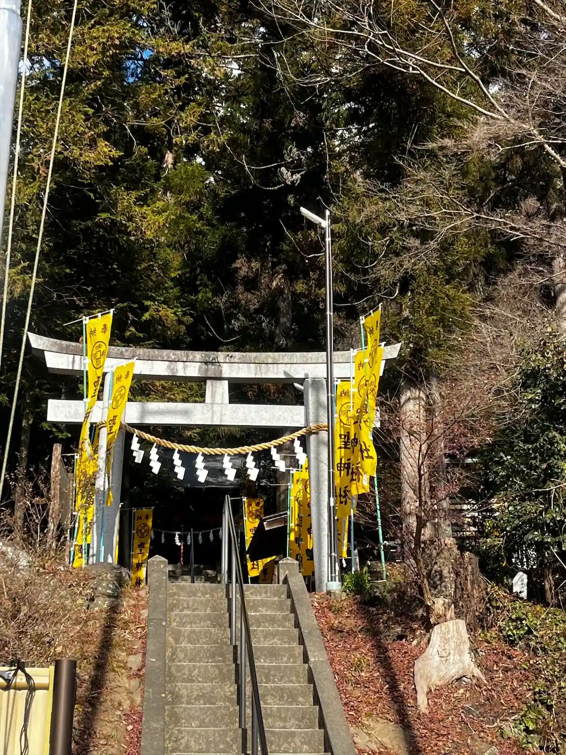 手水舎と階段 黄色い幟がぱっと明るくて元気が出る気がします。