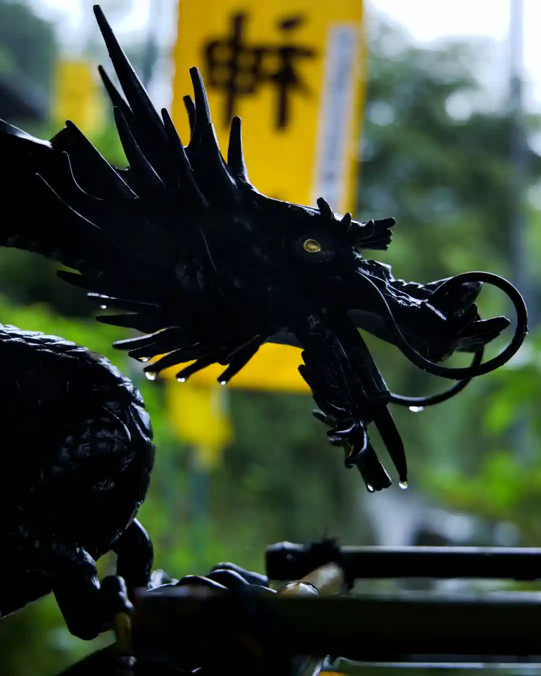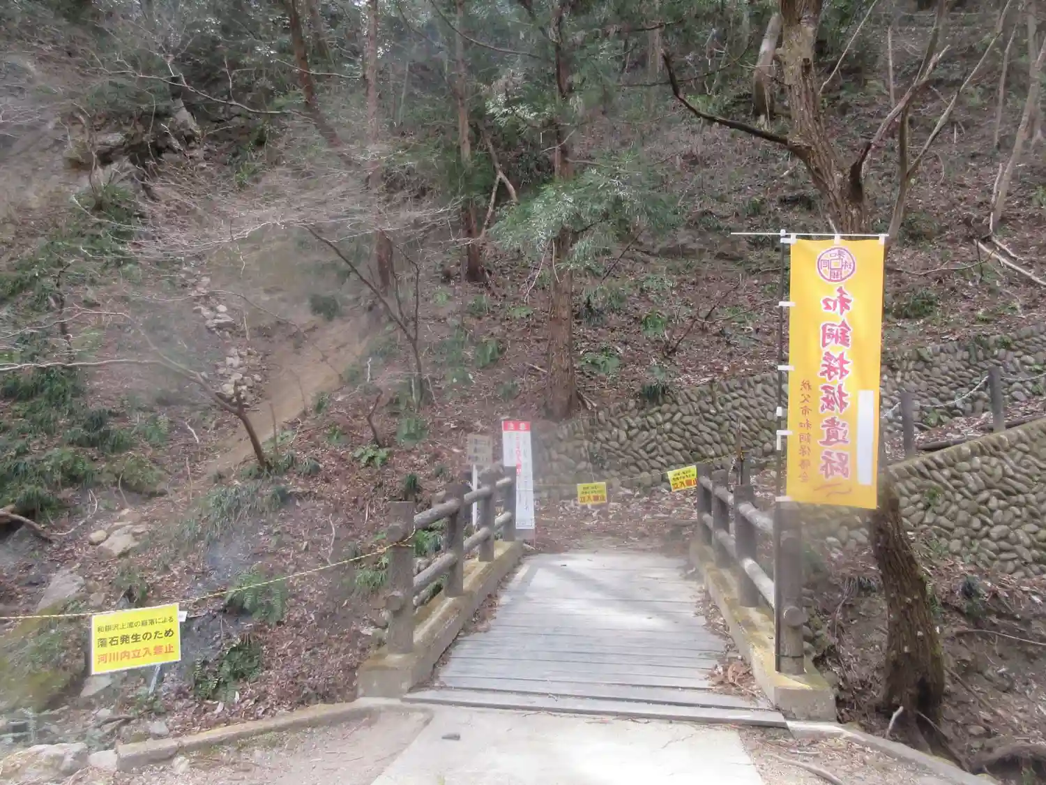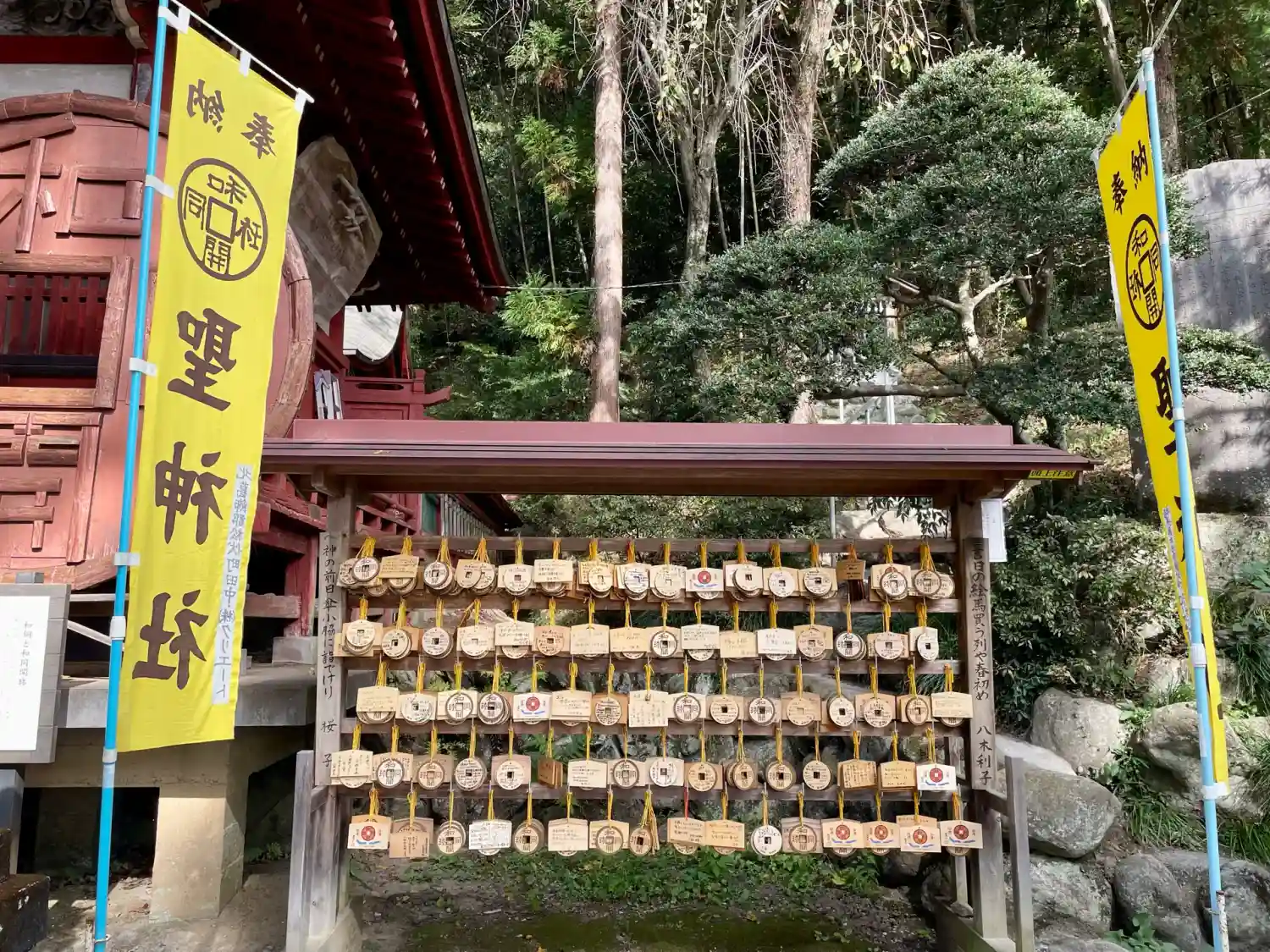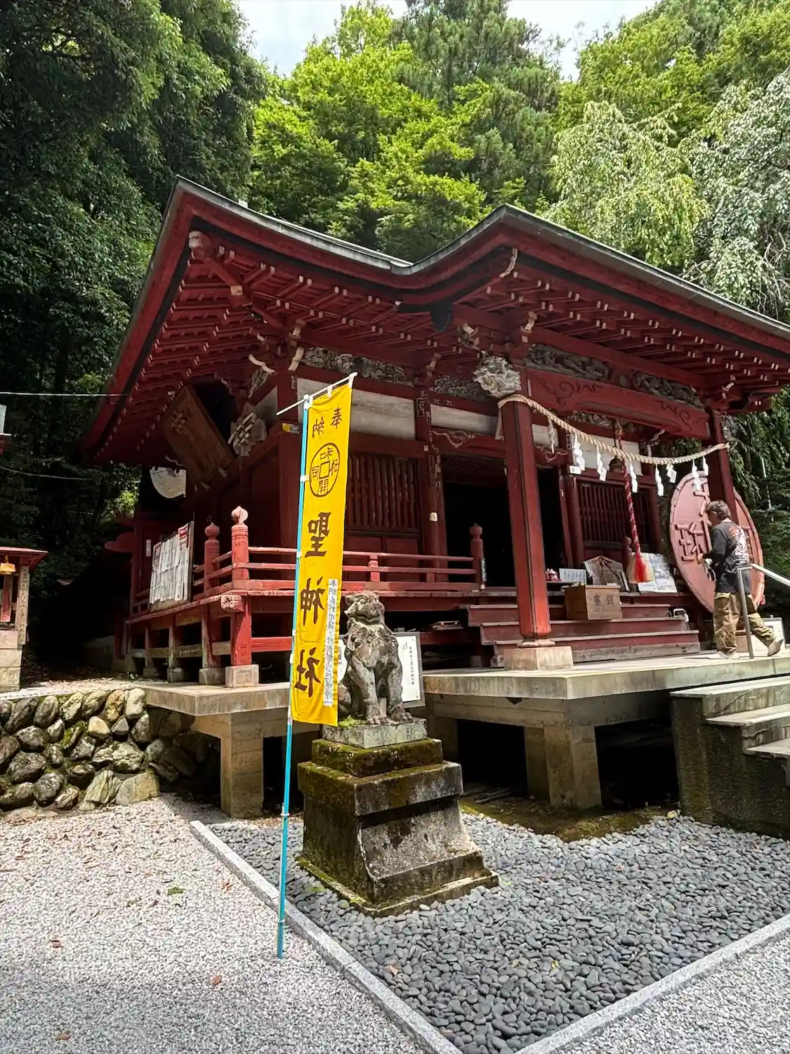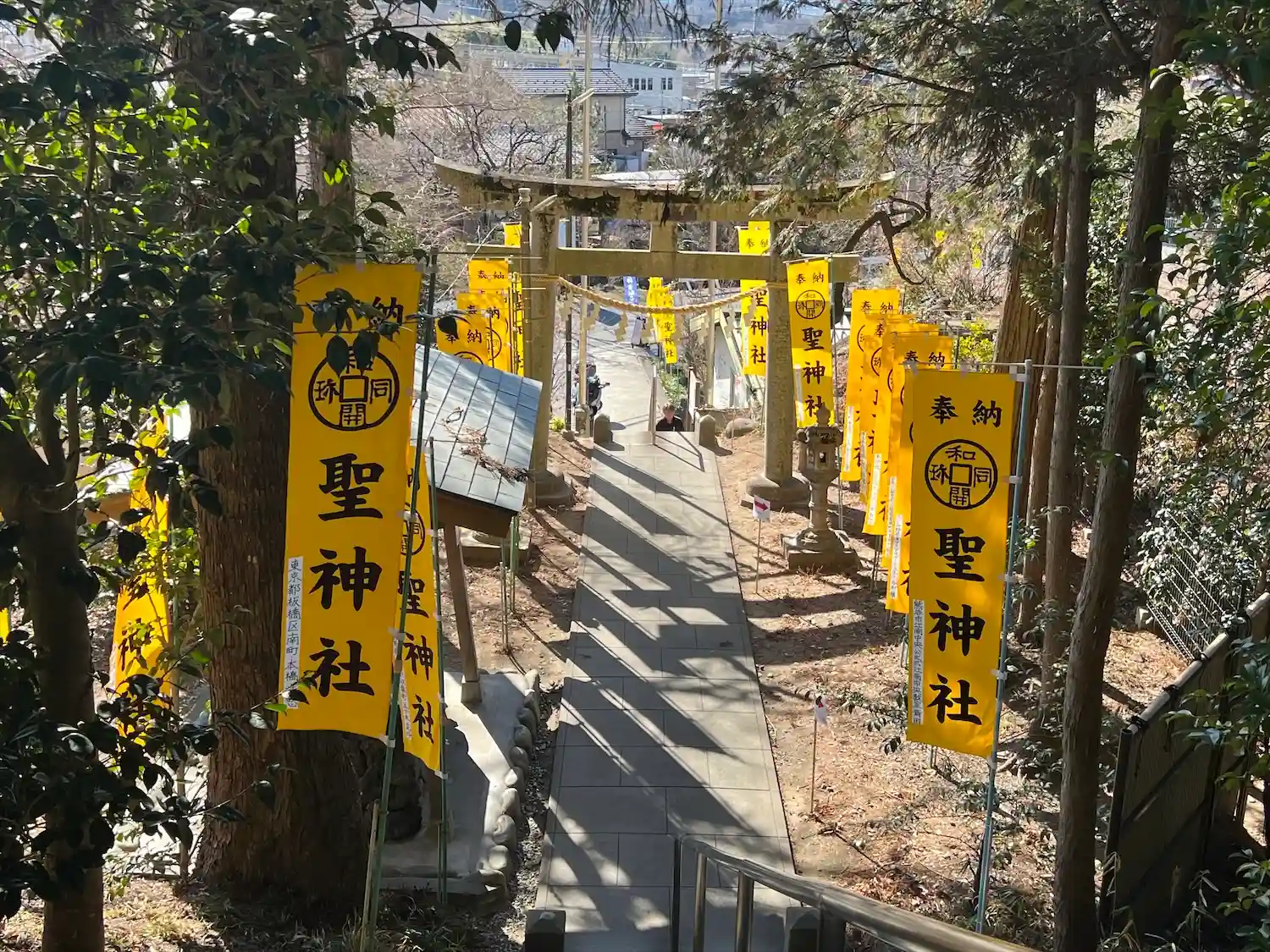 手水舎と階段 黄色い幟がぱっと明るくて元気が出る気がします。