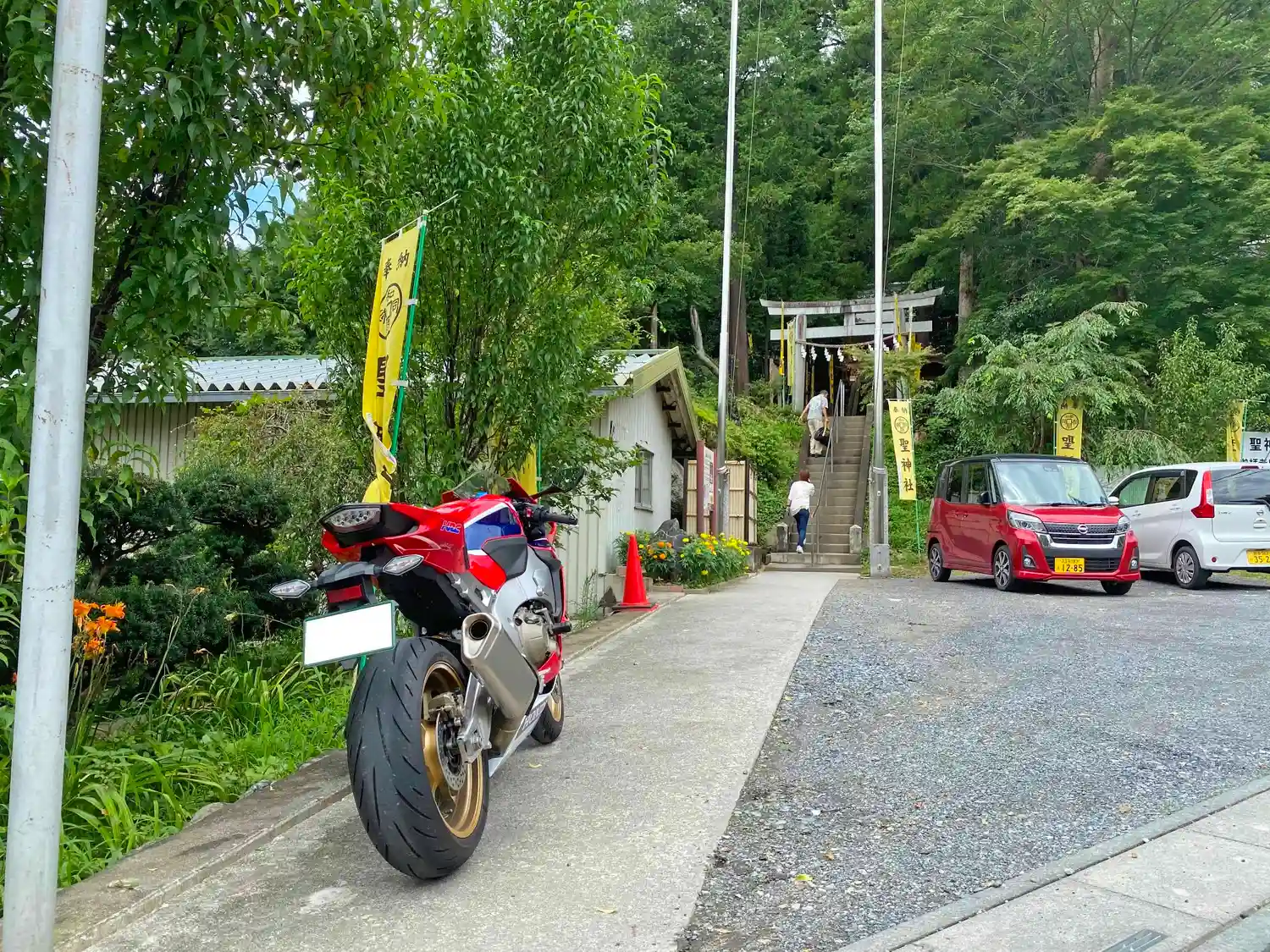 当社駐車場には案内のおじさんがいて、バイクを停めるよう促されたのがこちら。もしや参道上では...?