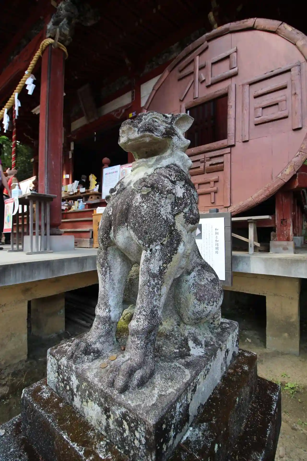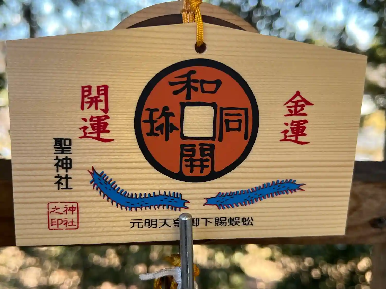 裏の模様は蜈蚣(ムカデ)の雌雄。足(お銭)が多いから縁起がいいそうです。そんなの江戸時代のダジャレかと思ったら、元明帝から和銅の産地への下賜品が銅製のムカデで社の宝物であるとのこと。なお、本物の和同開珎の裏面は無地