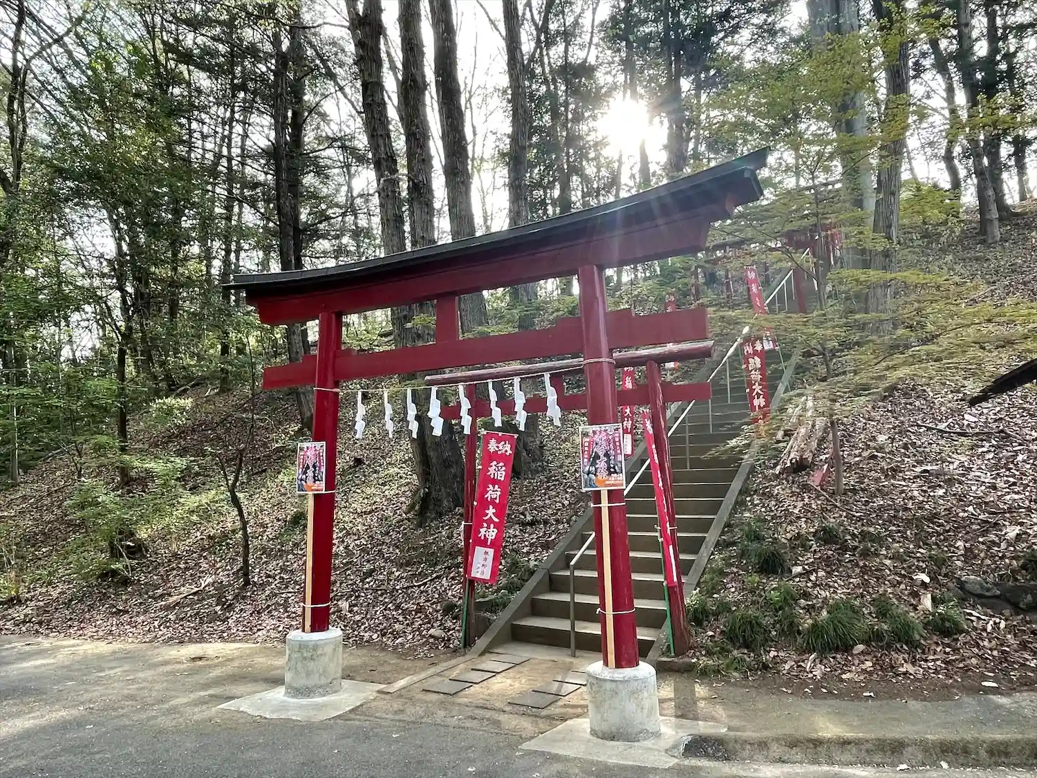 芝桜の丘へ向かう途中にそこそこ勾配のある階段と朱塗りの鳥居。