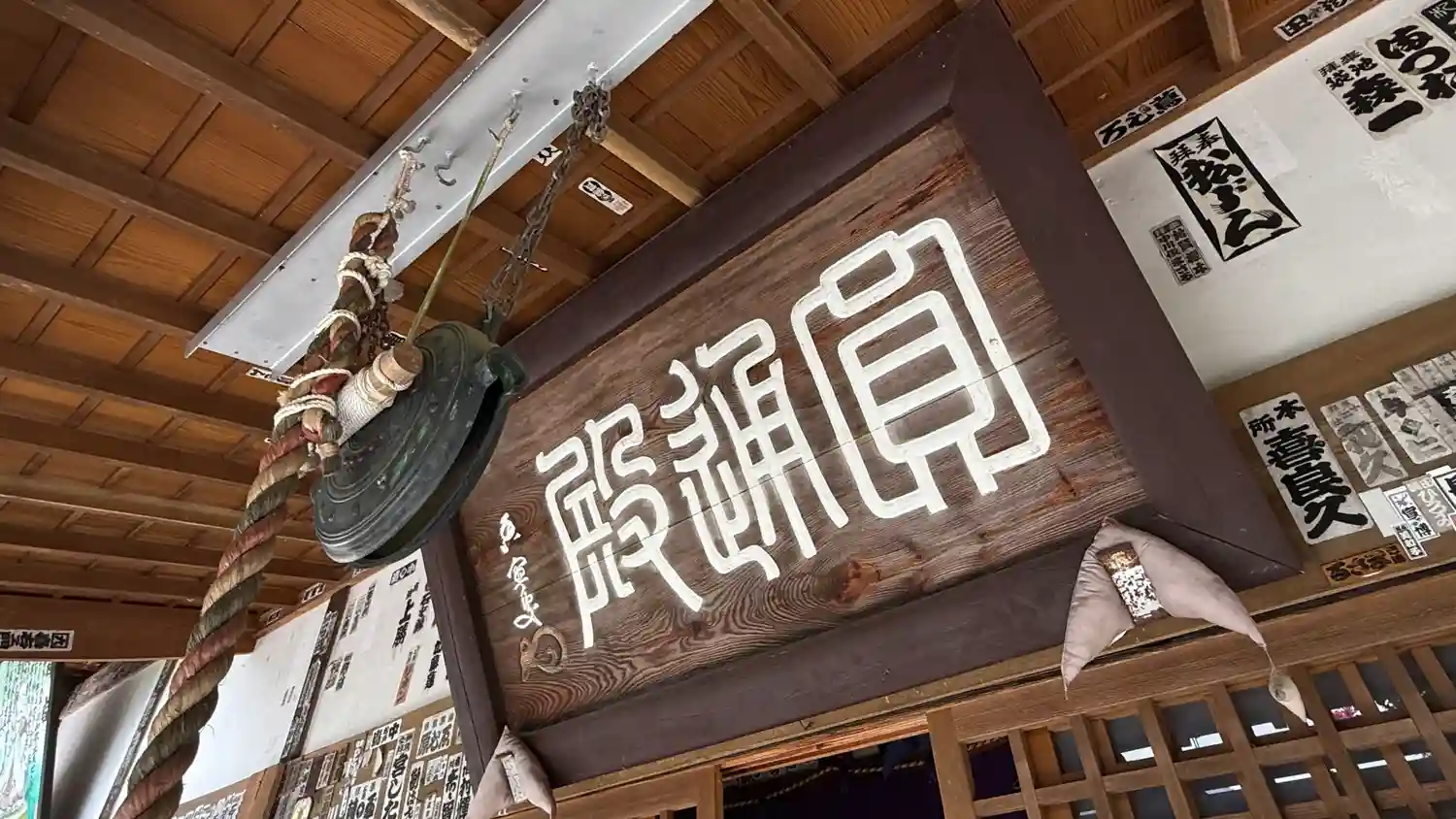 <語歌堂>正面内側上部。五番札所のお詠み歌の扁額。目立つ無数の千社札。