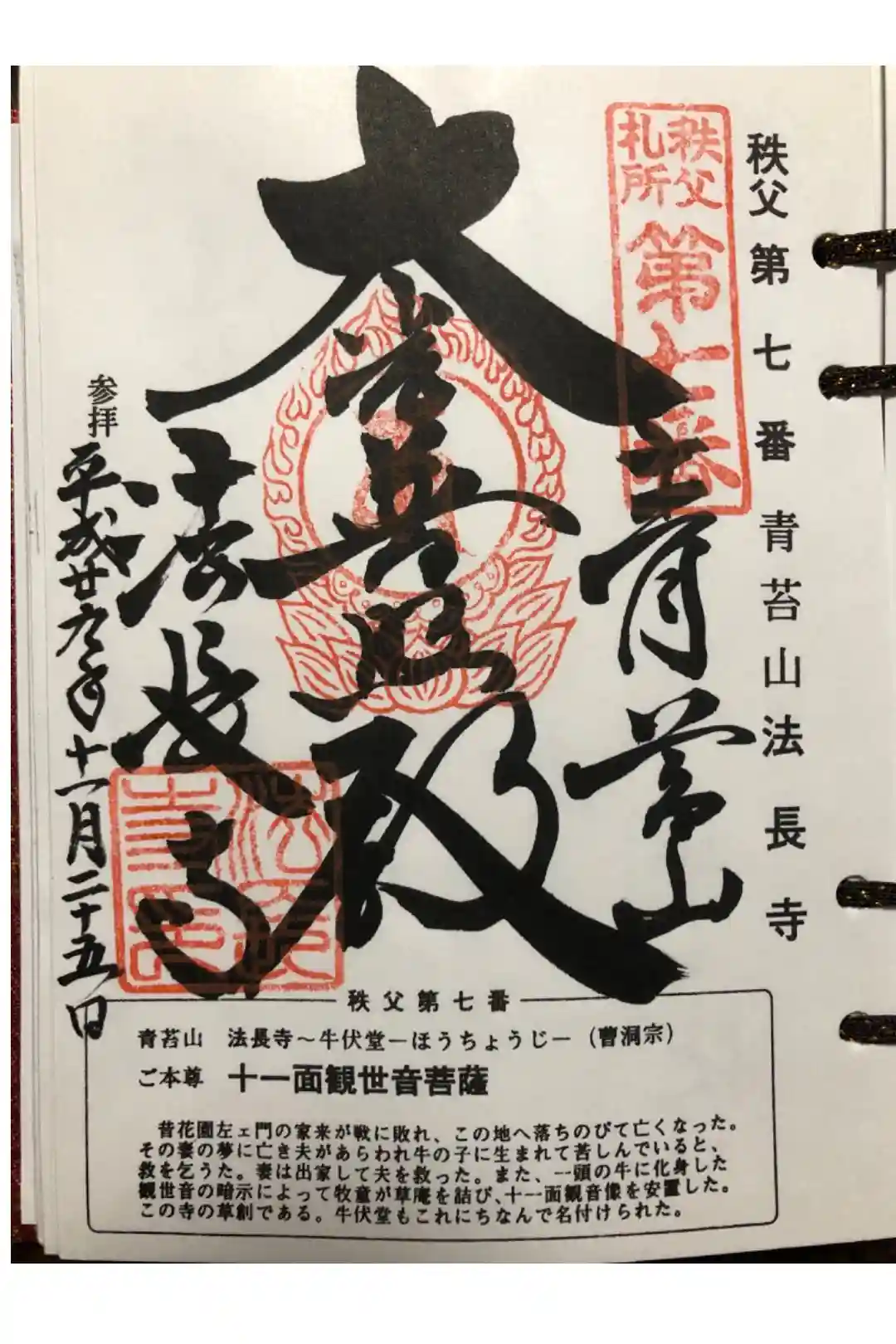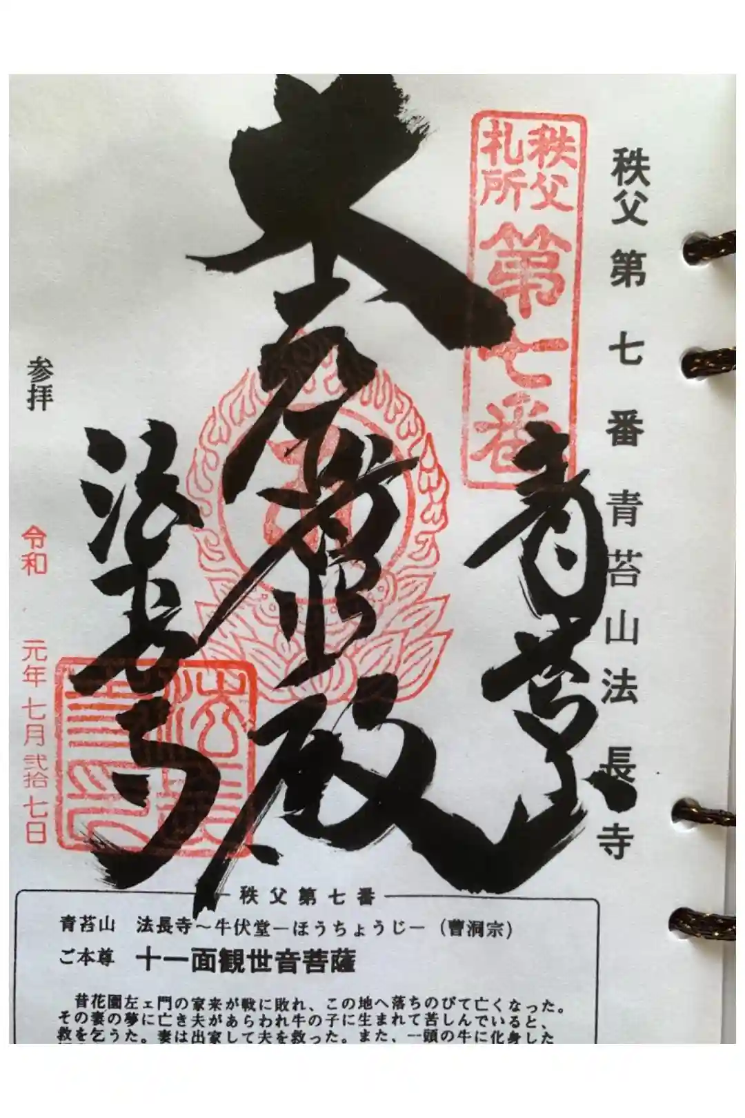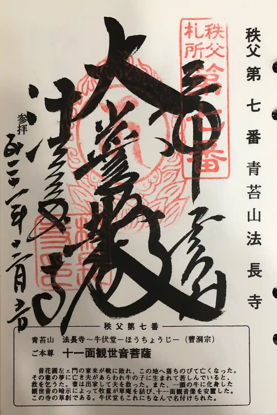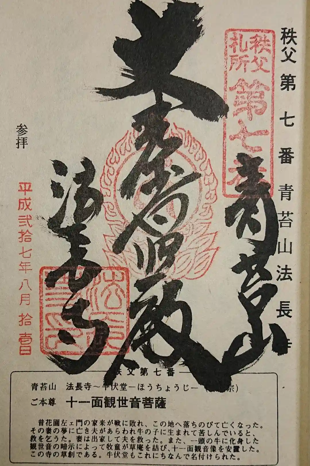 秩父札所三十四観音霊場 第七番札所、札所ご本尊は十一面観世音菩薩 日本百観音 の一つ