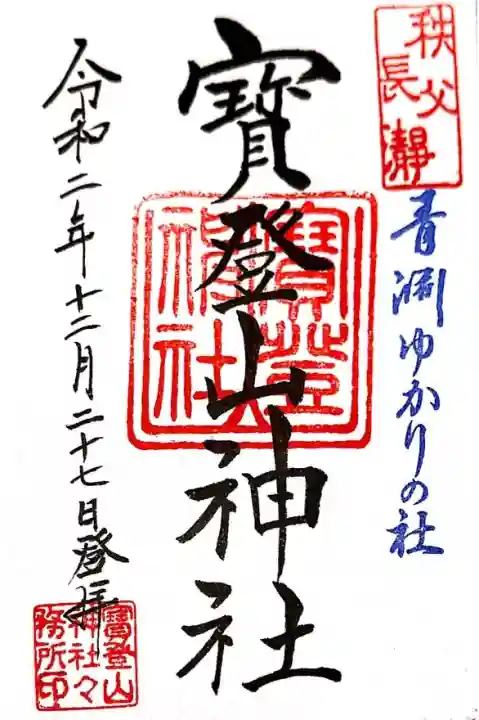 | 御朱印 | あり 右上には『秩父長瀞』、真ん中には『寳登神社』の印が押されています。春夏秋冬それぞれの季節を味わうことができる御朱印帳があります。 |