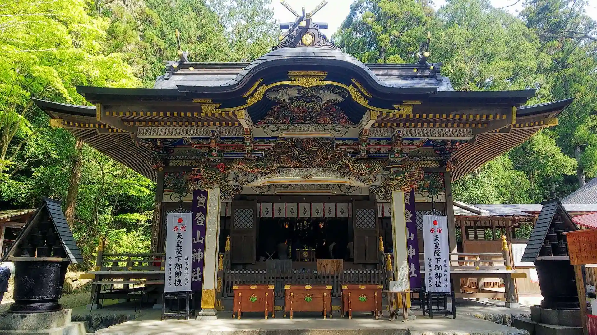 秩父神社、三峯神社と共に秩父三社の一つです。西暦111年(景行天皇41年)、日本武尊が神日本磐余彦尊(神武天皇)を祀ったのが始まりと云われています。御祭神は、神日本磐余彦尊(かんやまといわれひこのみこと)、大山祗神(おおやまづみのかみ)、火産霊神(ほむすびのかみ)の3柱です。ロープウェイで山頂付近まで行くと、宝登山神社奥宮があります。歩いて上る事も出来ますが、1時間ほどかかりそうです。長瀞駅から徒歩で約10分、駐車場もあります。