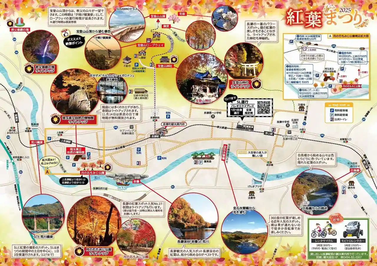 宝登山ロープウエイ駐車場⇔長瀞駅の無料シャトルバスを利用して“岩畳”と“SL”を見に行きます。長瀞駅まで片道約3〜5分、2回利用させて頂きました。