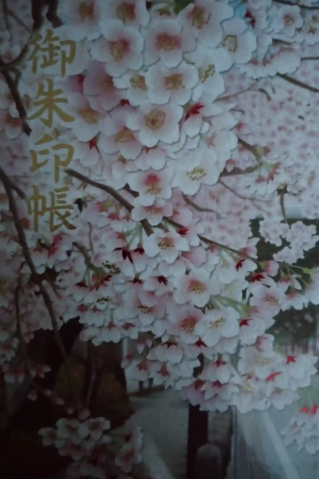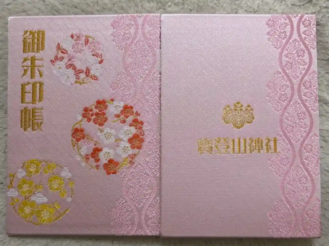 淡いピンク地に桜の模様と、紅白の梅、黄色の蝋梅、桜の花の刺繍が美しい御朱印帳です。表紙に「御朱印帳」の文字があります。