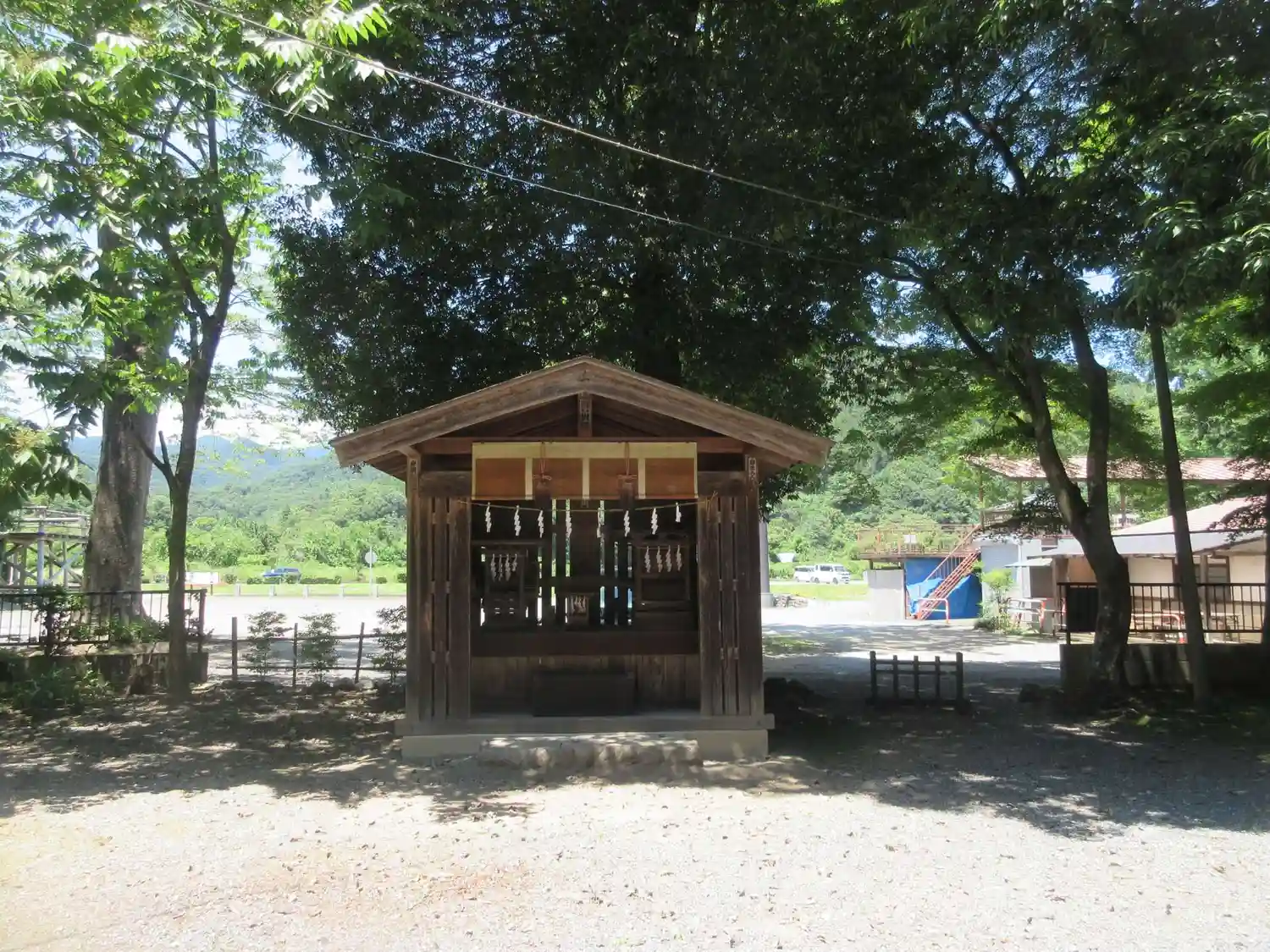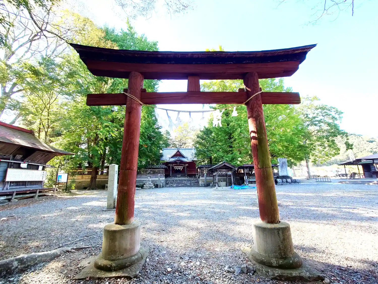 神社左手の鳥居の方から入って境内に駐車できます。こちら側は気持ちのよい風景が広がっていて、左手の山…