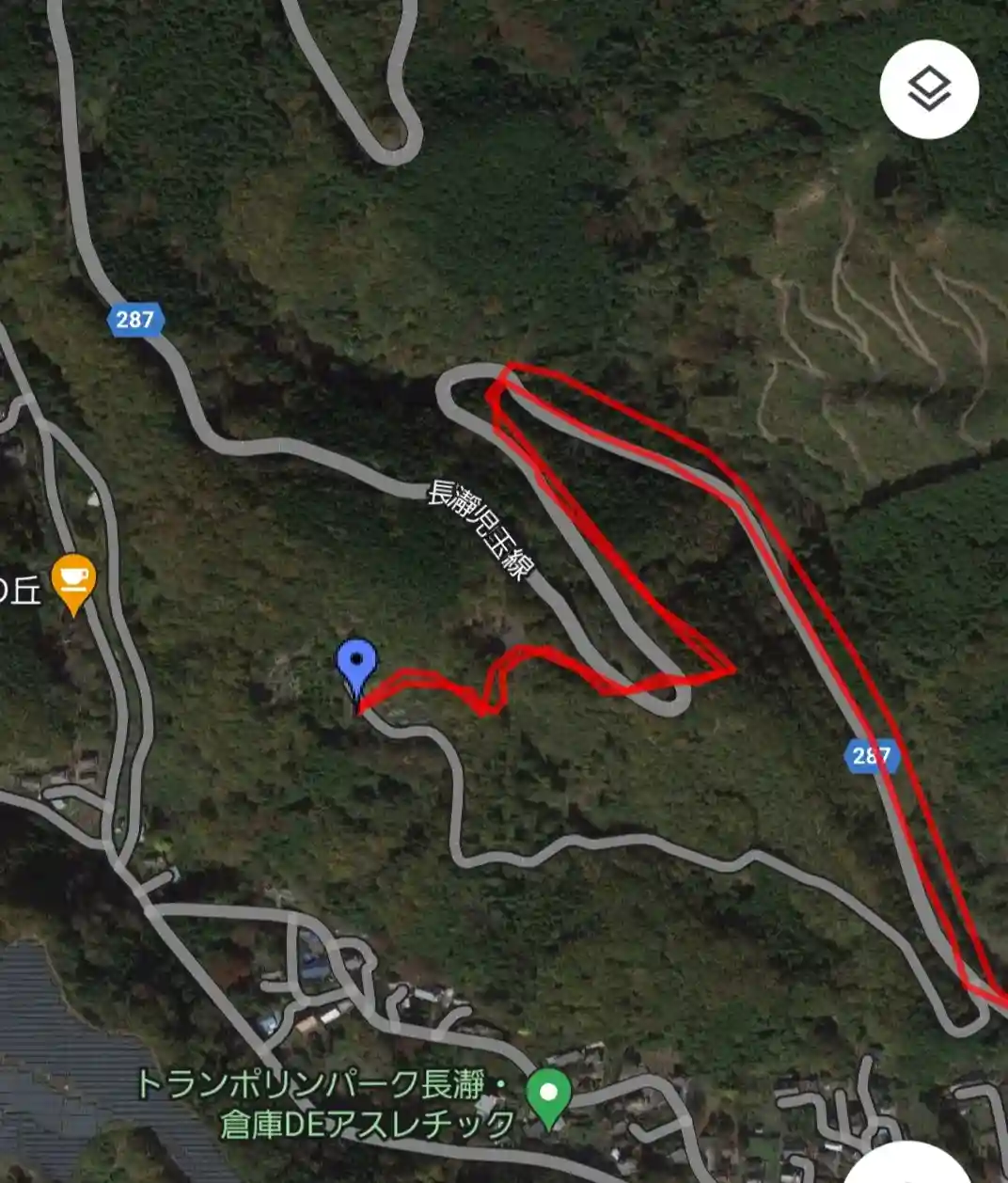 下に伸びるのが自分が凸した危険な林道