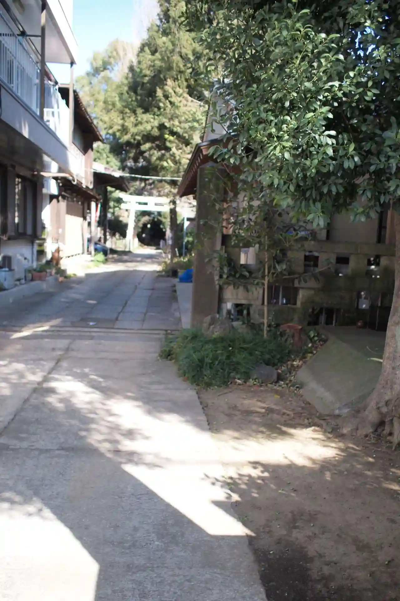 そこそこ交通量のある道路を歩いていると、案内板を発見、脇道が参道になっている神社です。参道から神社…