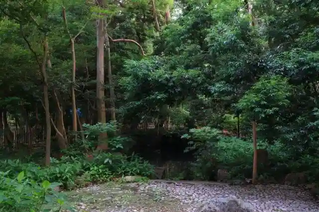 奥にある池が氷川神社発祥の地とされる蛇の池。ご祭神の須佐之男命の神話に倣い名前を蛇の池としたそうです。
