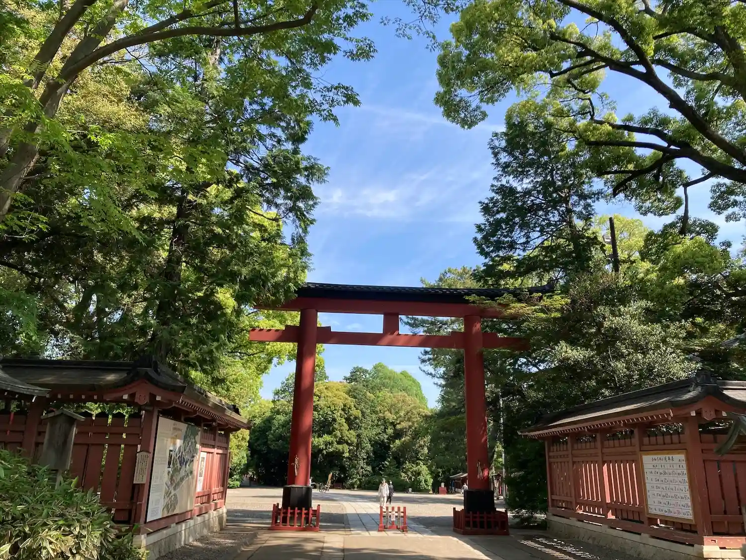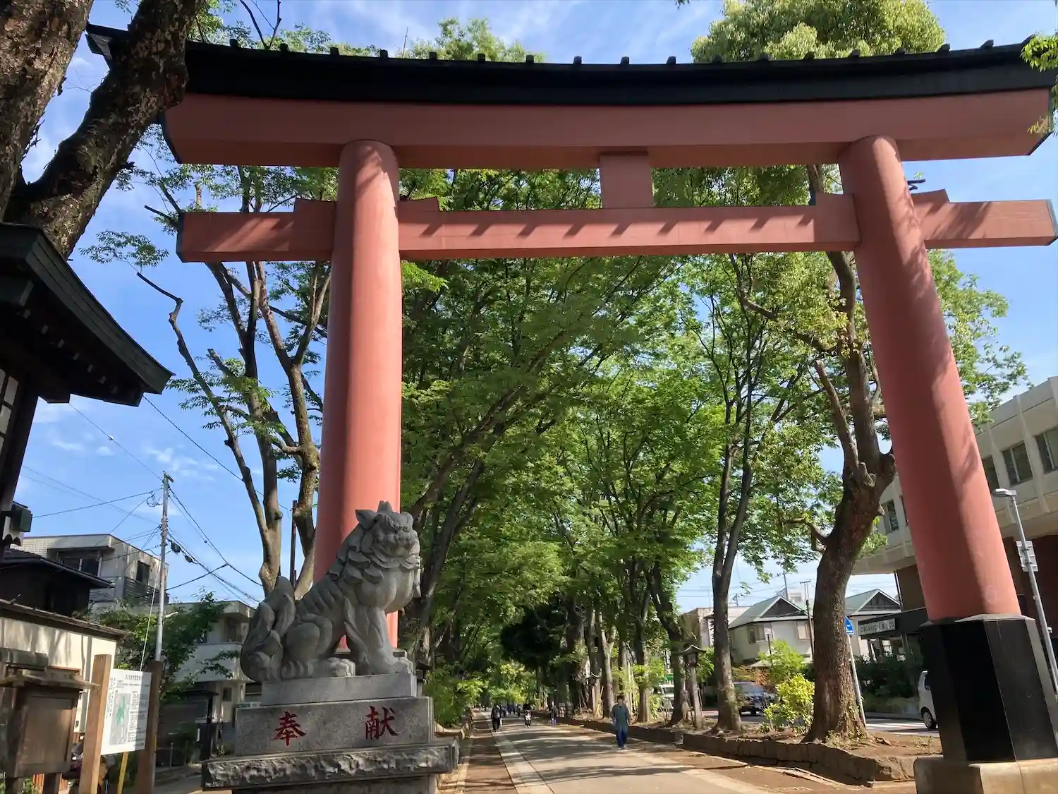 二の鳥居。立派すぎて、道路挟まないと撮れないです。右手のオーガニック&co はコエドビールの会社運営。オーガニック野菜とミックスジュース飲め、コエドビールの蔵出しお持ち帰りも。