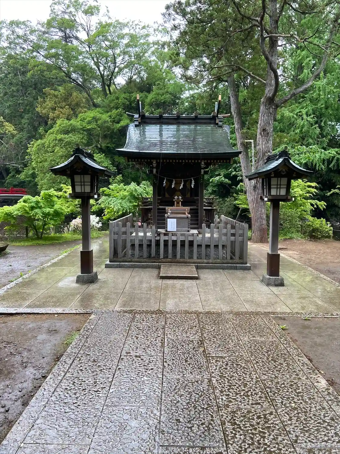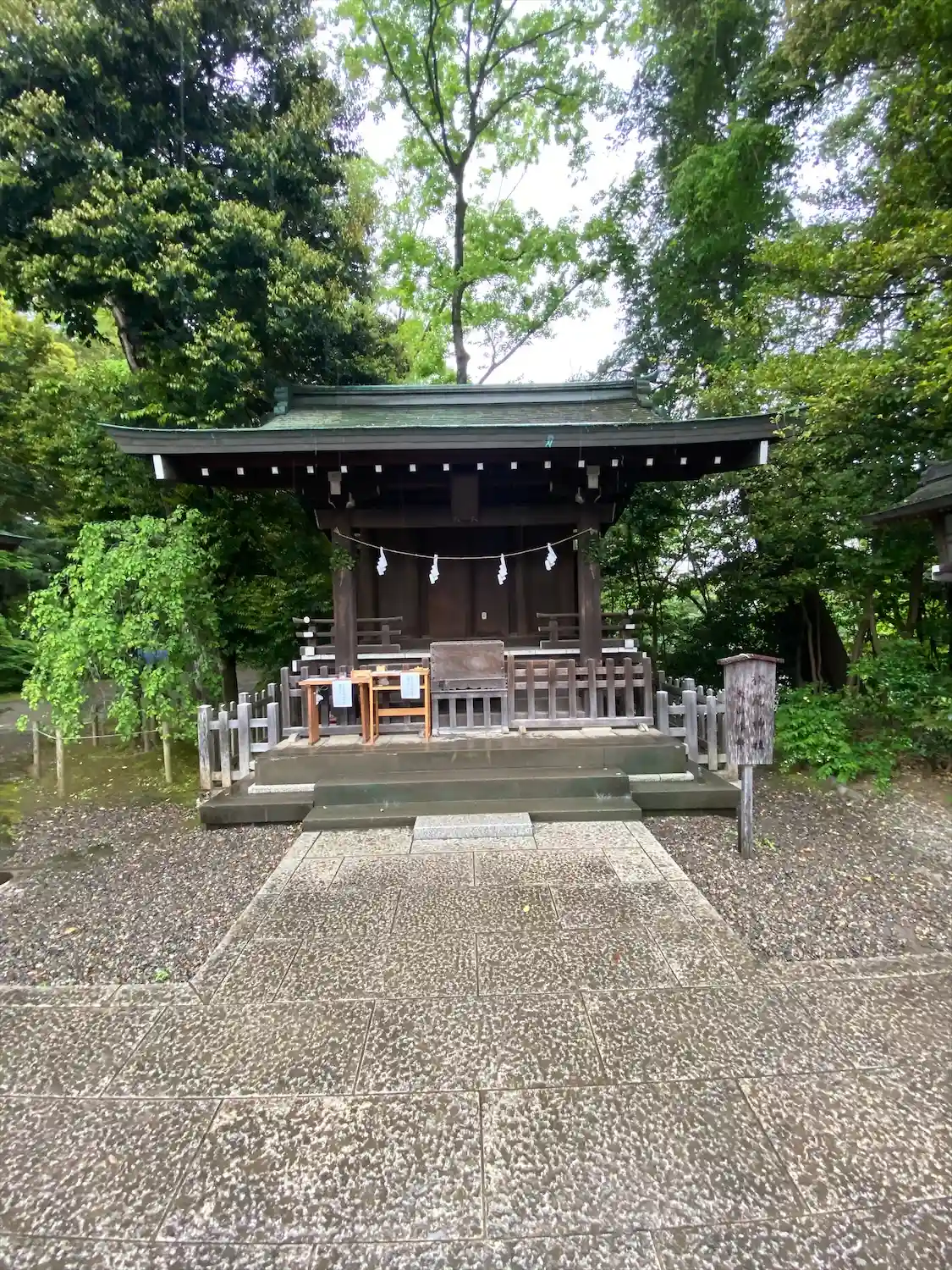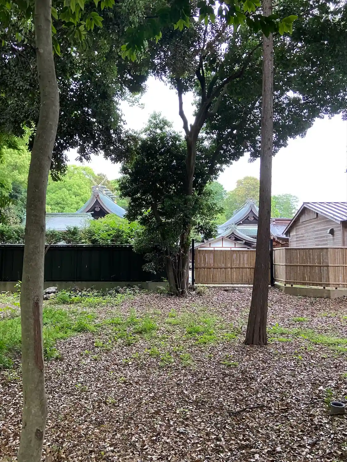 蛇の池に向かう道から、拝殿と本殿の屋根が見えます。
