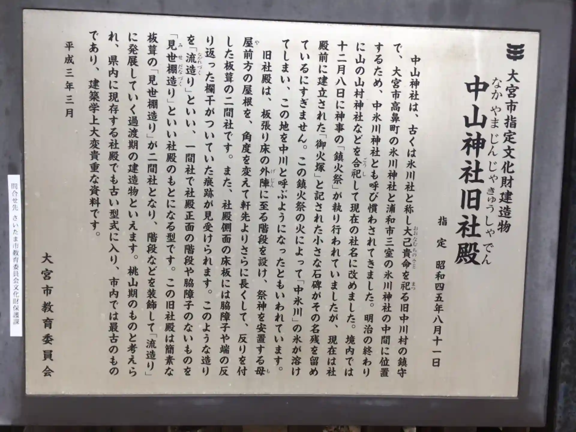 昔は氷川神社だったそうで、氷川神社と氷川女体神社の間にあるために中氷川神社と言われていたそうです。明治の終わり頃に他の神社を合祀して中山神社になったと境内の説明書きにありました。鳥居には氷川神社の名前があります。