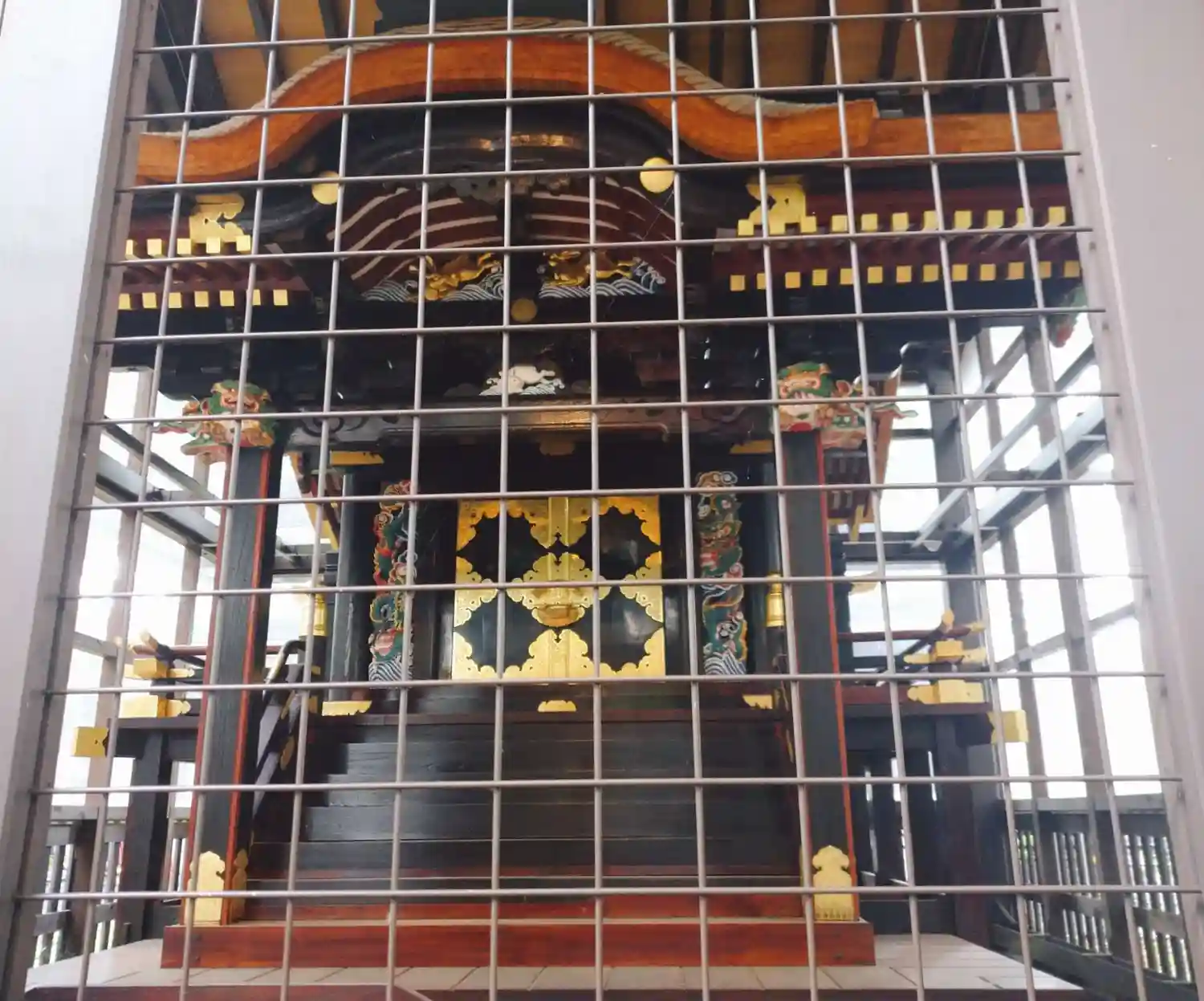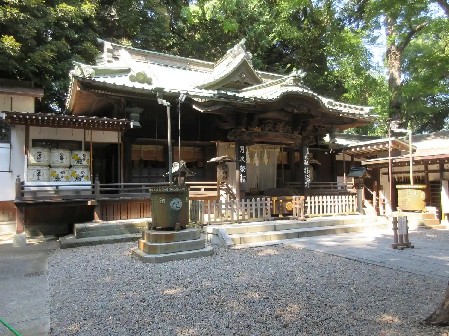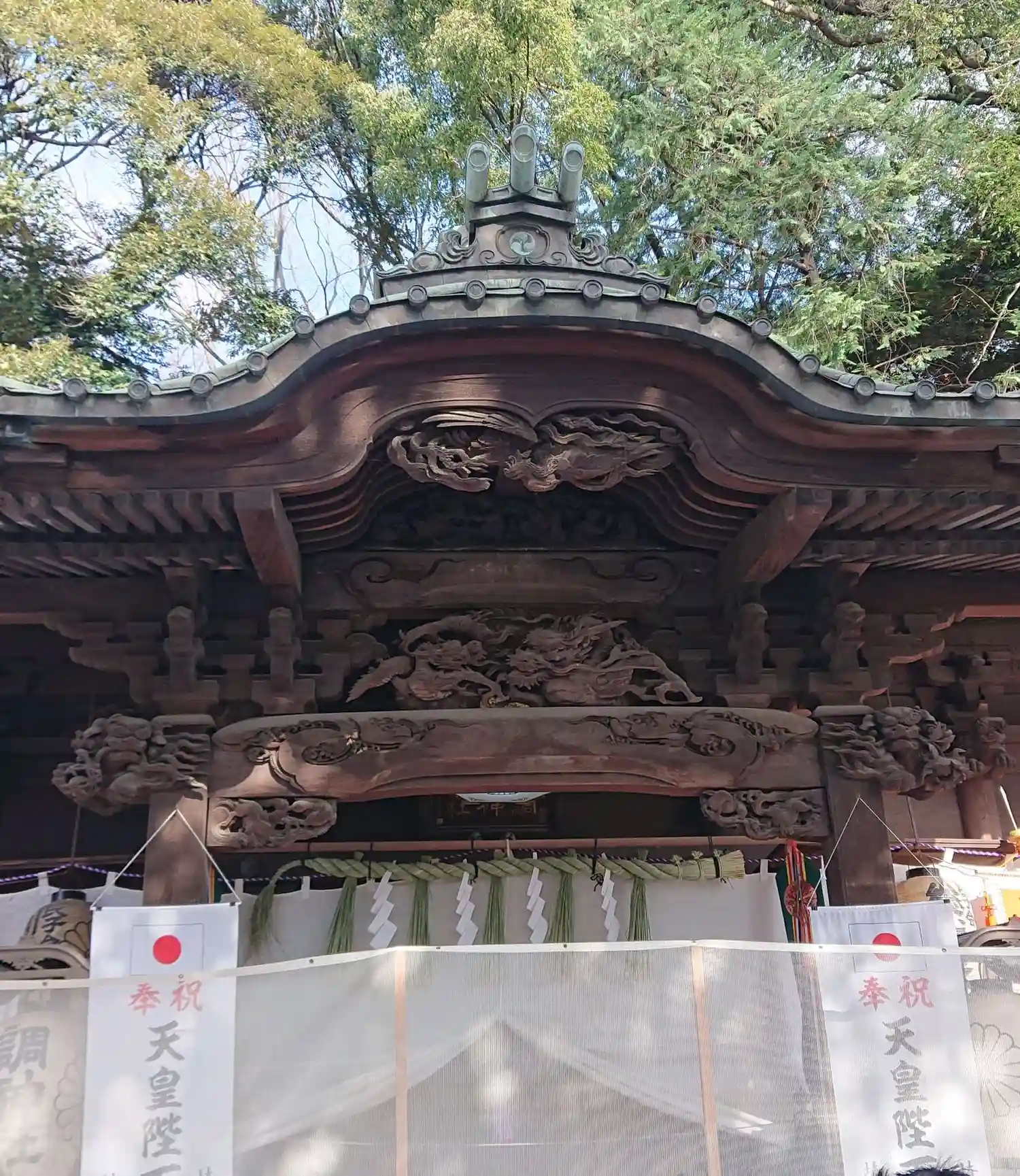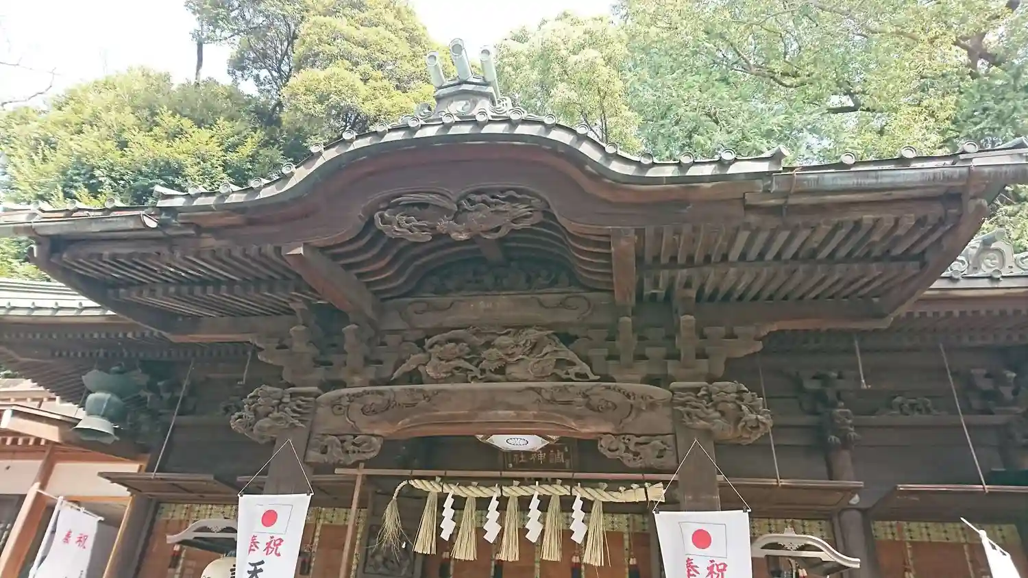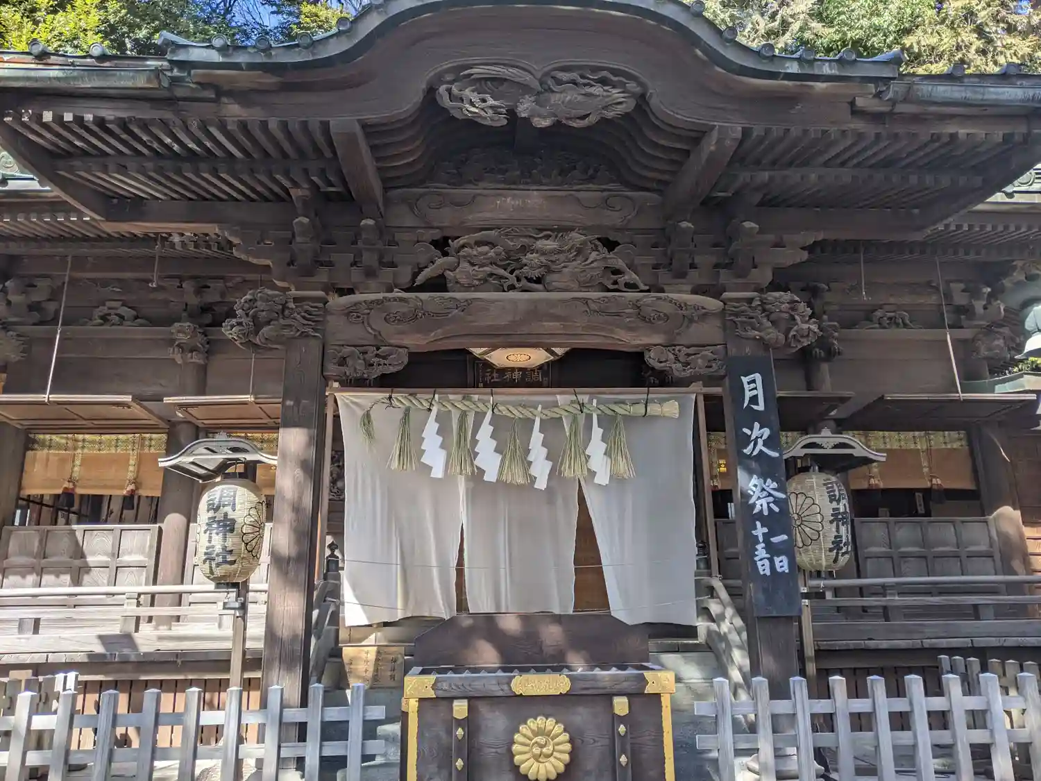 拝殿正面。彫刻はシンプルだがきれい。中が見えない簾も良い感じ。