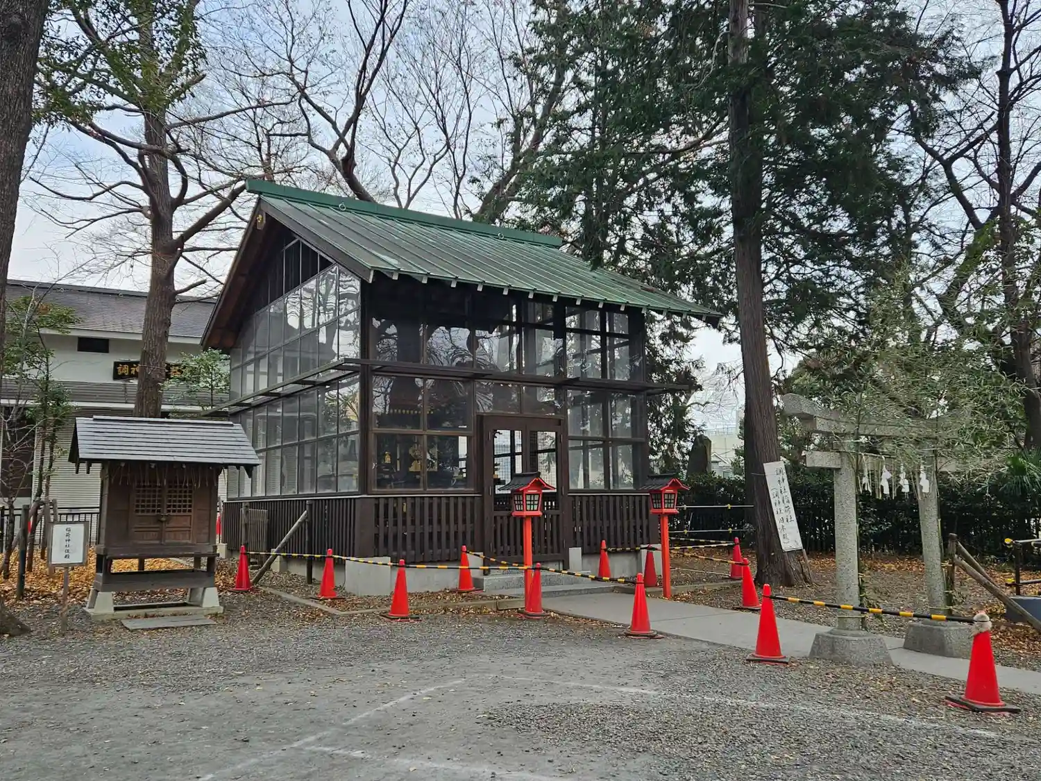 稲荷神社の社殿は調神社旧本殿。江戸中期の1733年造営で、一間社流造の杮葺き。保全のため、社全体が覆われている。