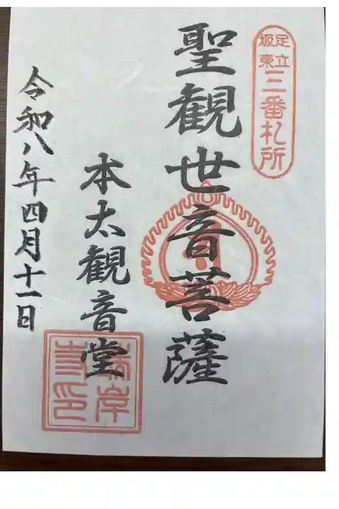 普門寺さんから徒歩で25分くらい、本太観音堂さんにお参りいたしました。こちらは足立坂東三十三観音霊場の第3番になります。こちらでもどうぞお入りくださいと声をかけられて、近くでご本尊様を拝見いたしました。その後、ご住職さんからご本尊さま、堂内に飾られている絵、柱の傷などの説明を興味深く聞くことができました。