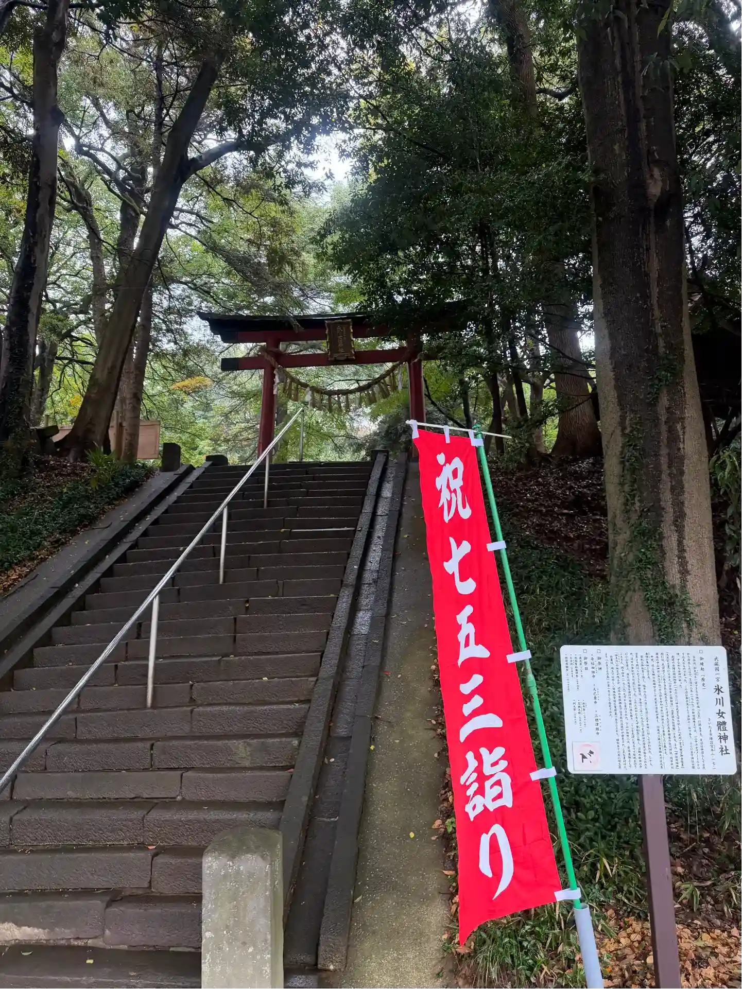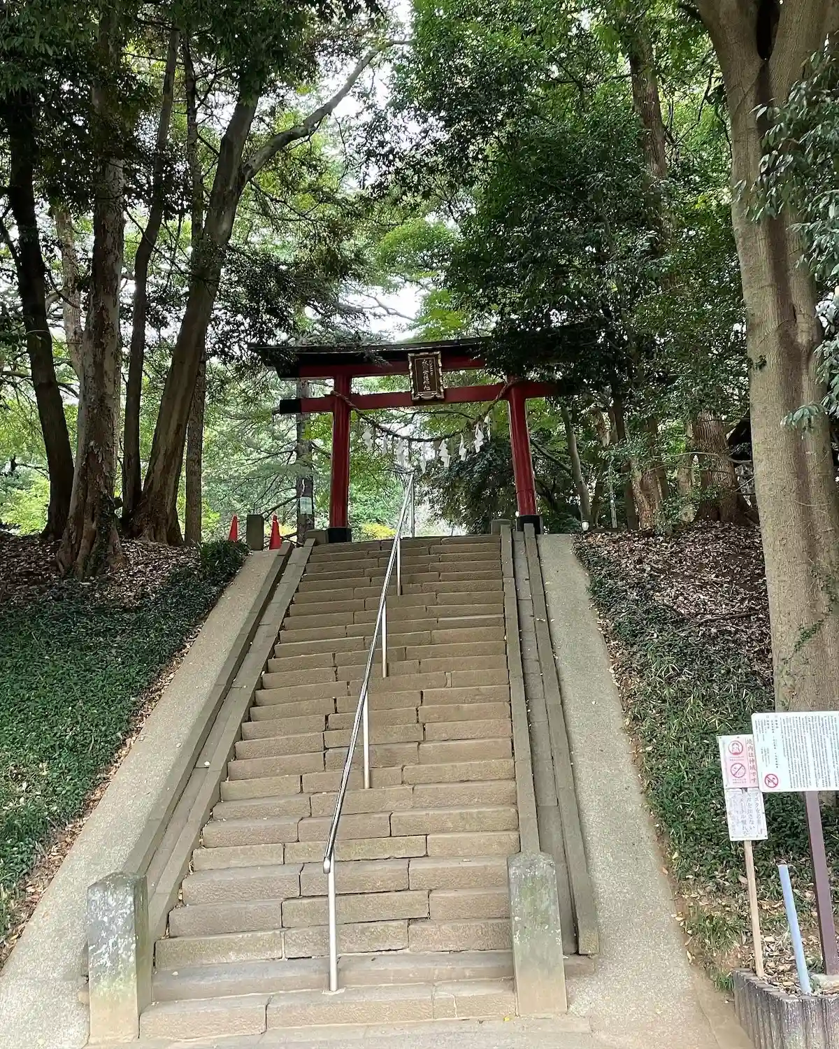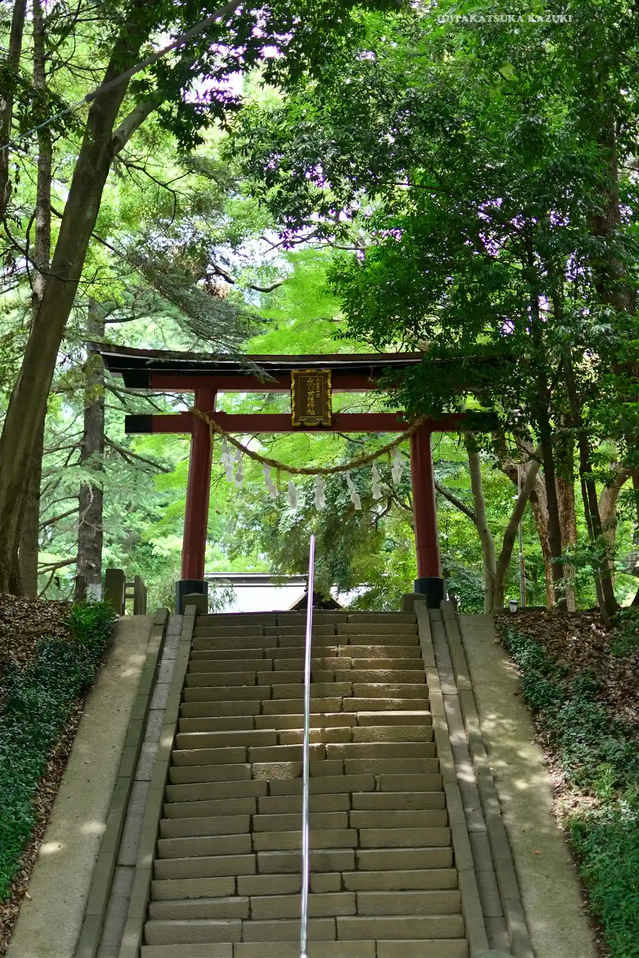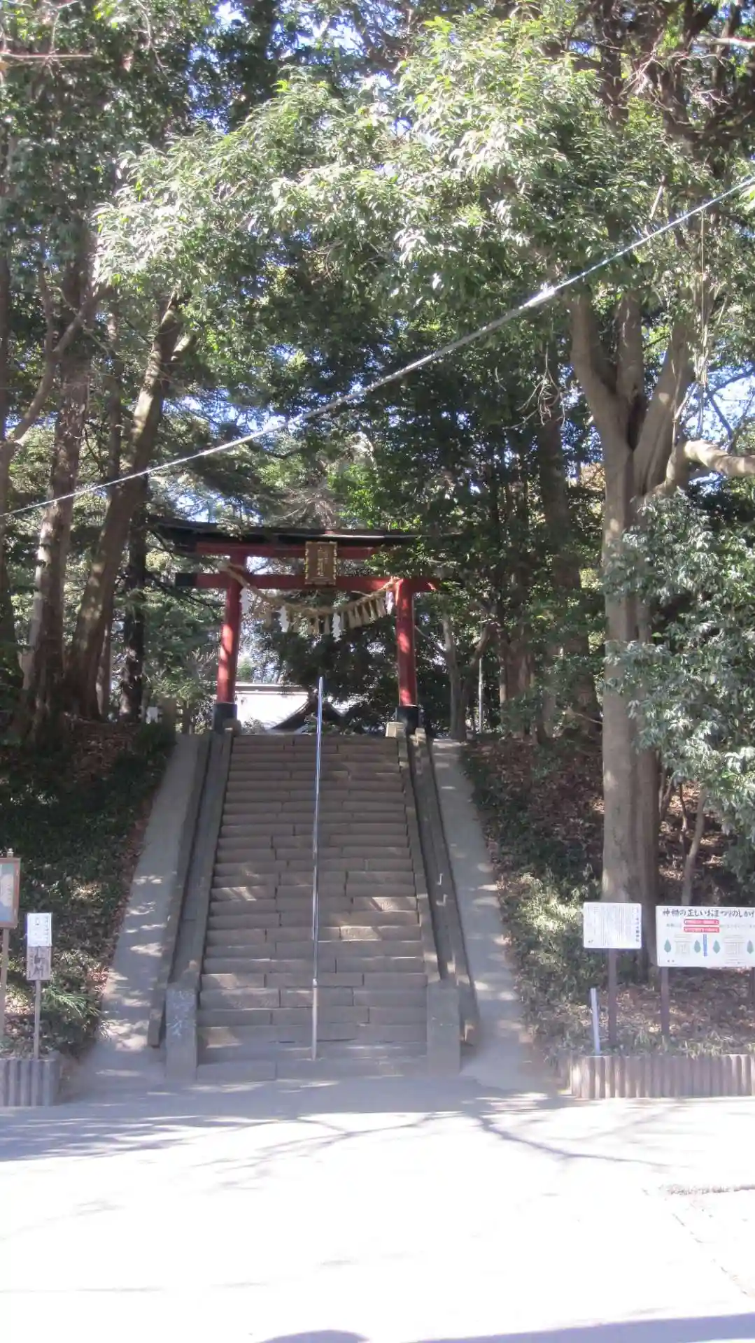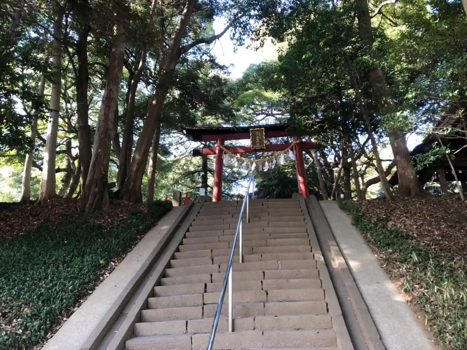 境内に続く階段と鳥居。後ろは見沼氷川公園。
