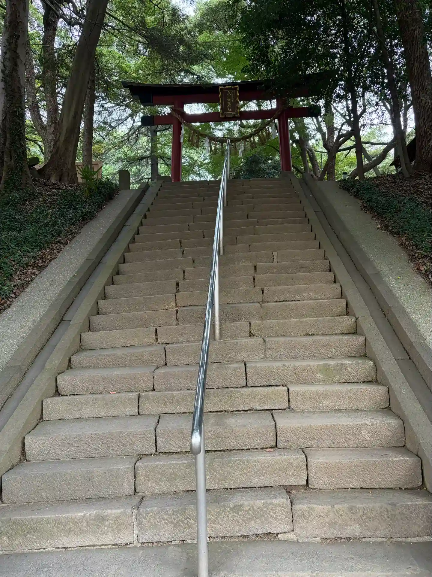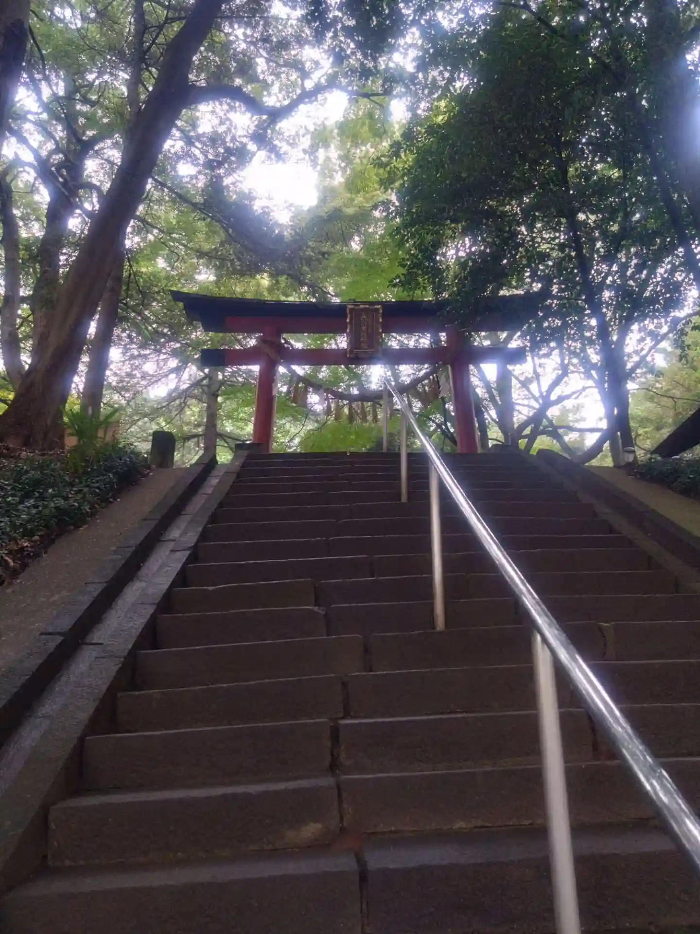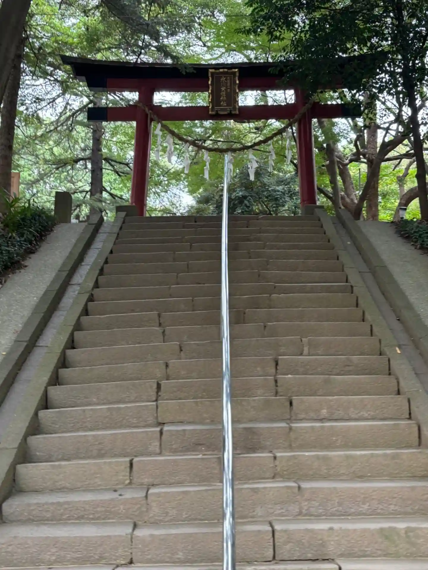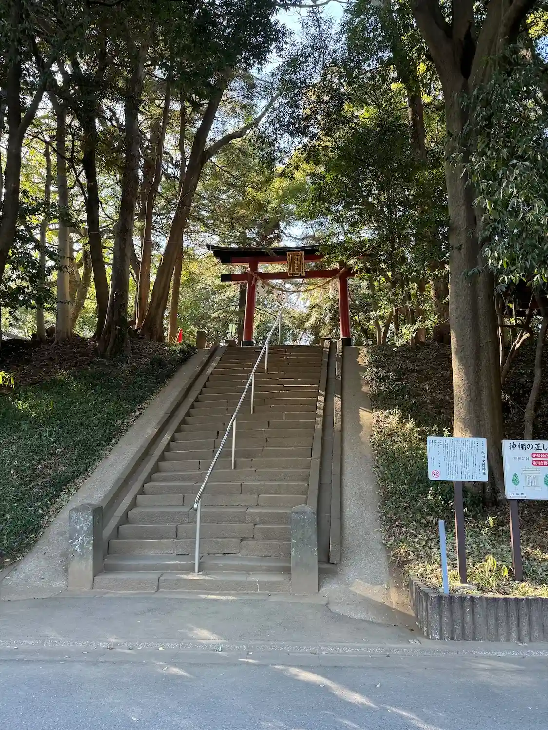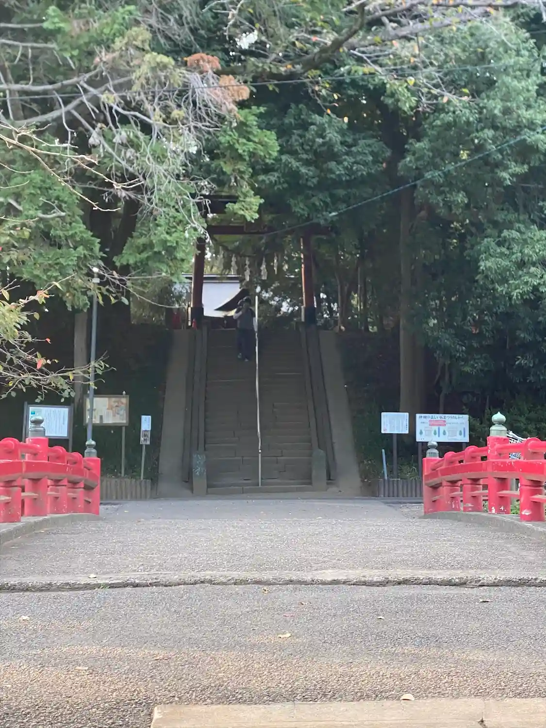 境内に続く階段と鳥居。後ろは見沼氷川公園。