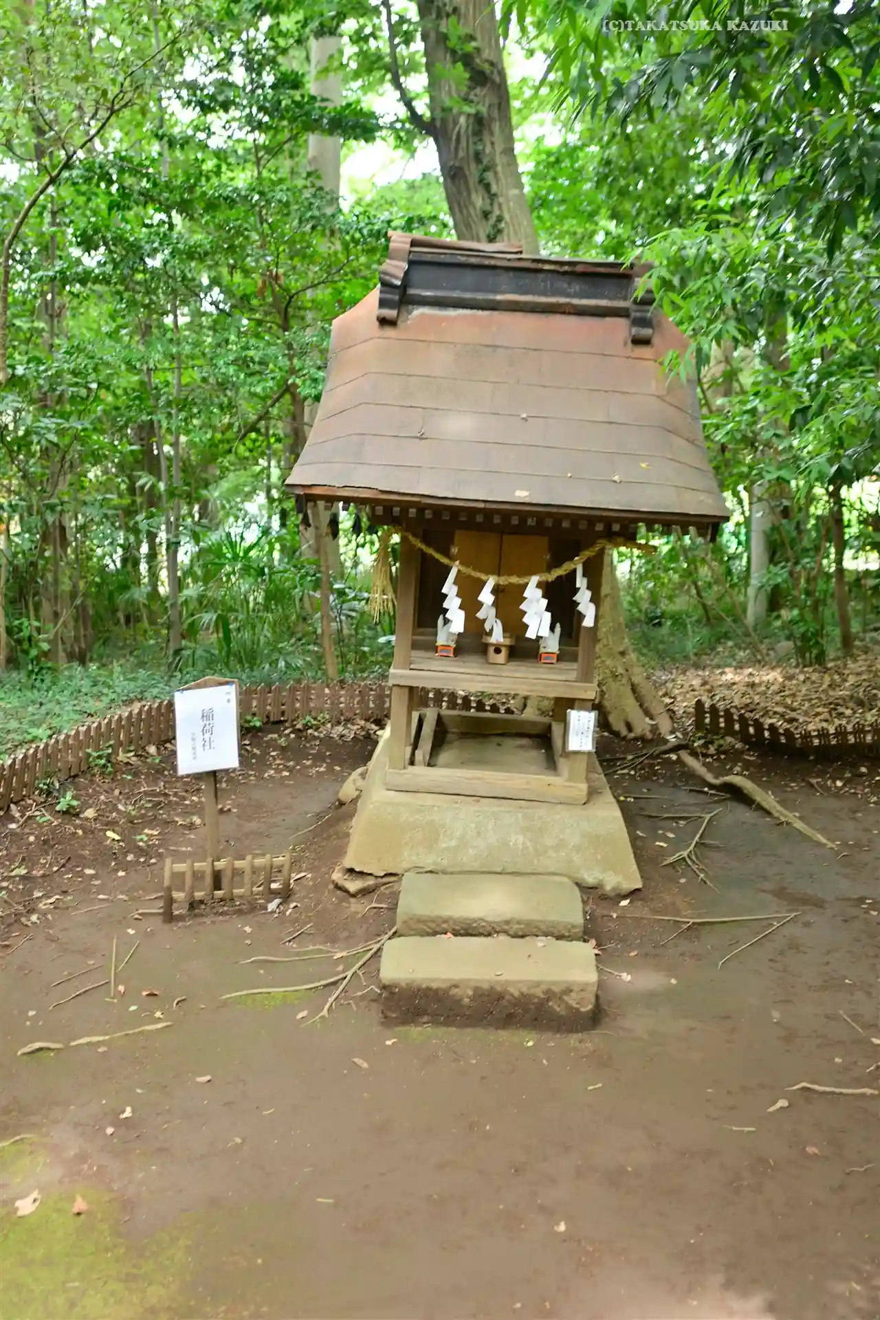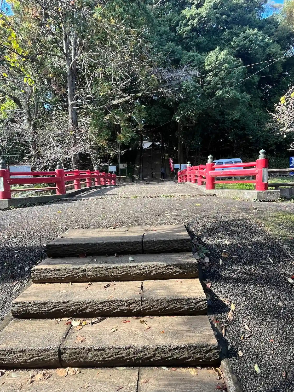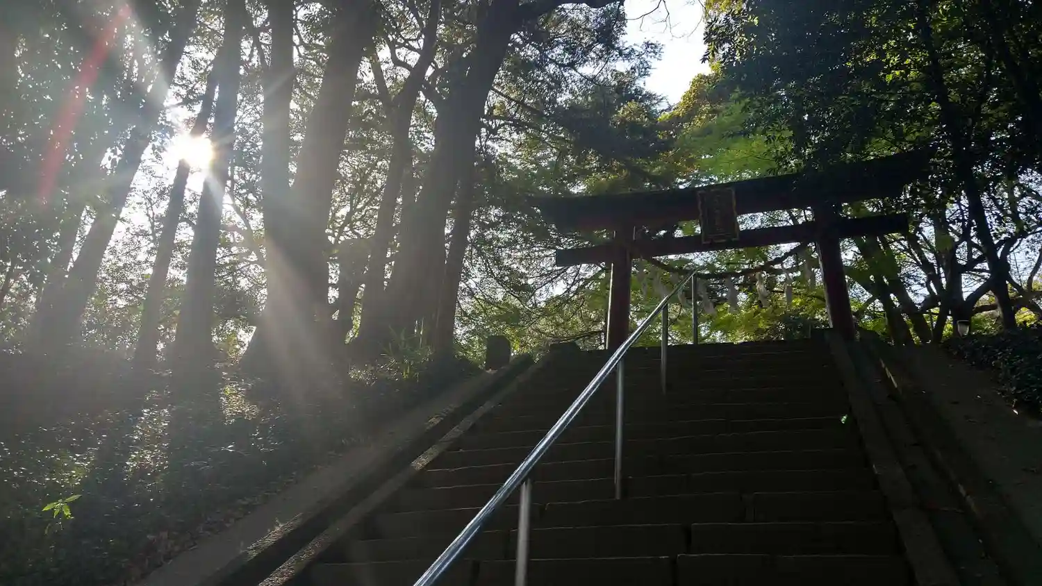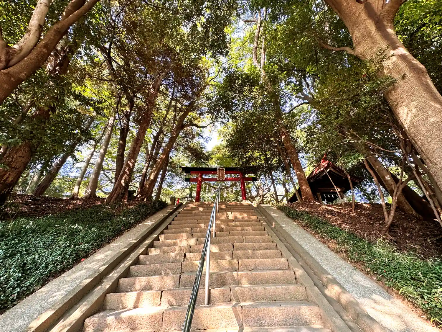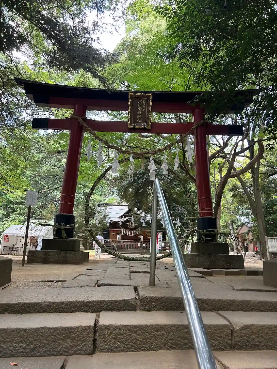 境内に続く階段と鳥居。後ろは見沼氷川公園。
