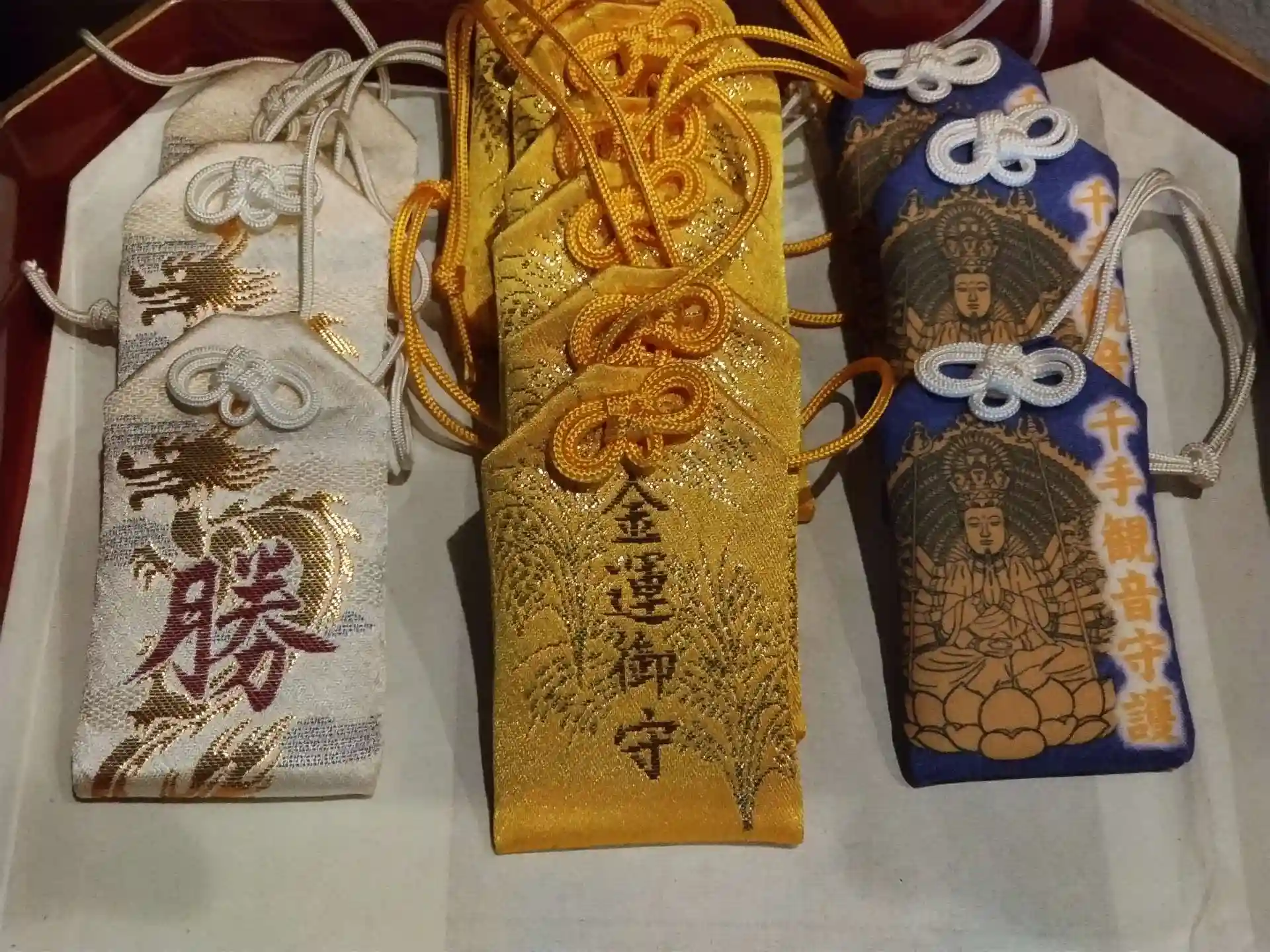 千手観音御守(人間関係円満)と弁天様の金運御守。五大明王の「勝負や試験に勝つ」御守です。