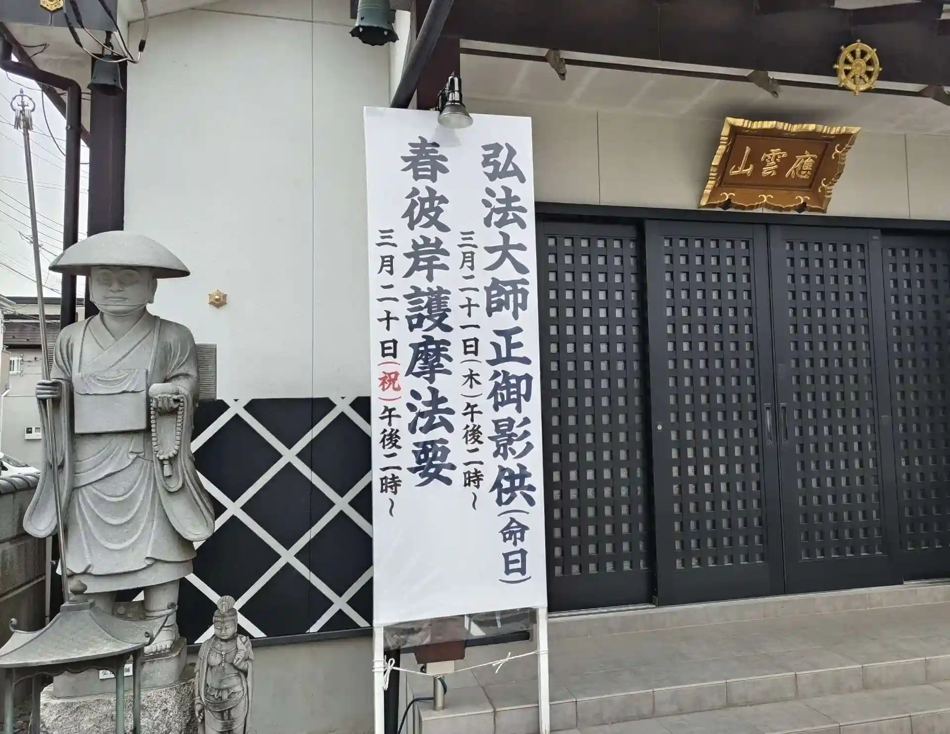 今も生きて私達を救って下さっている、とされる弘法大師空海様。感謝の気持ちを持って読経します。ご命日に皆で「南無大師遍照金剛」を108辺お唱えします。心にお大師様が現れると、されます。どなた様でも参列は自由ですので、堂内お気軽にお入り下さい。金字の3月21日限定御朱印はお声がけください。