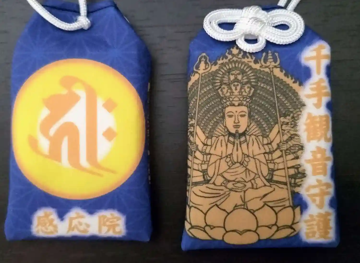 千手観音御守(人間関係円満)と弁天様の金運御守。五大明王の「勝負や試験に勝つ」御守です。