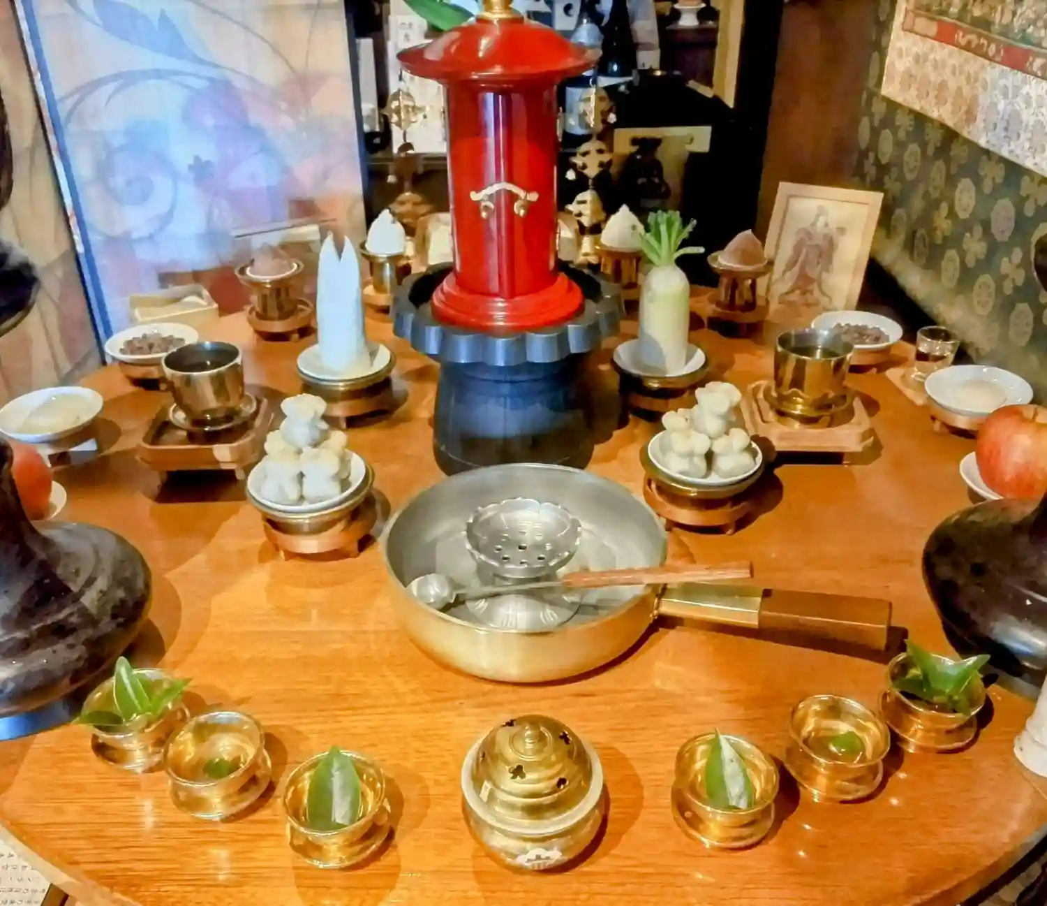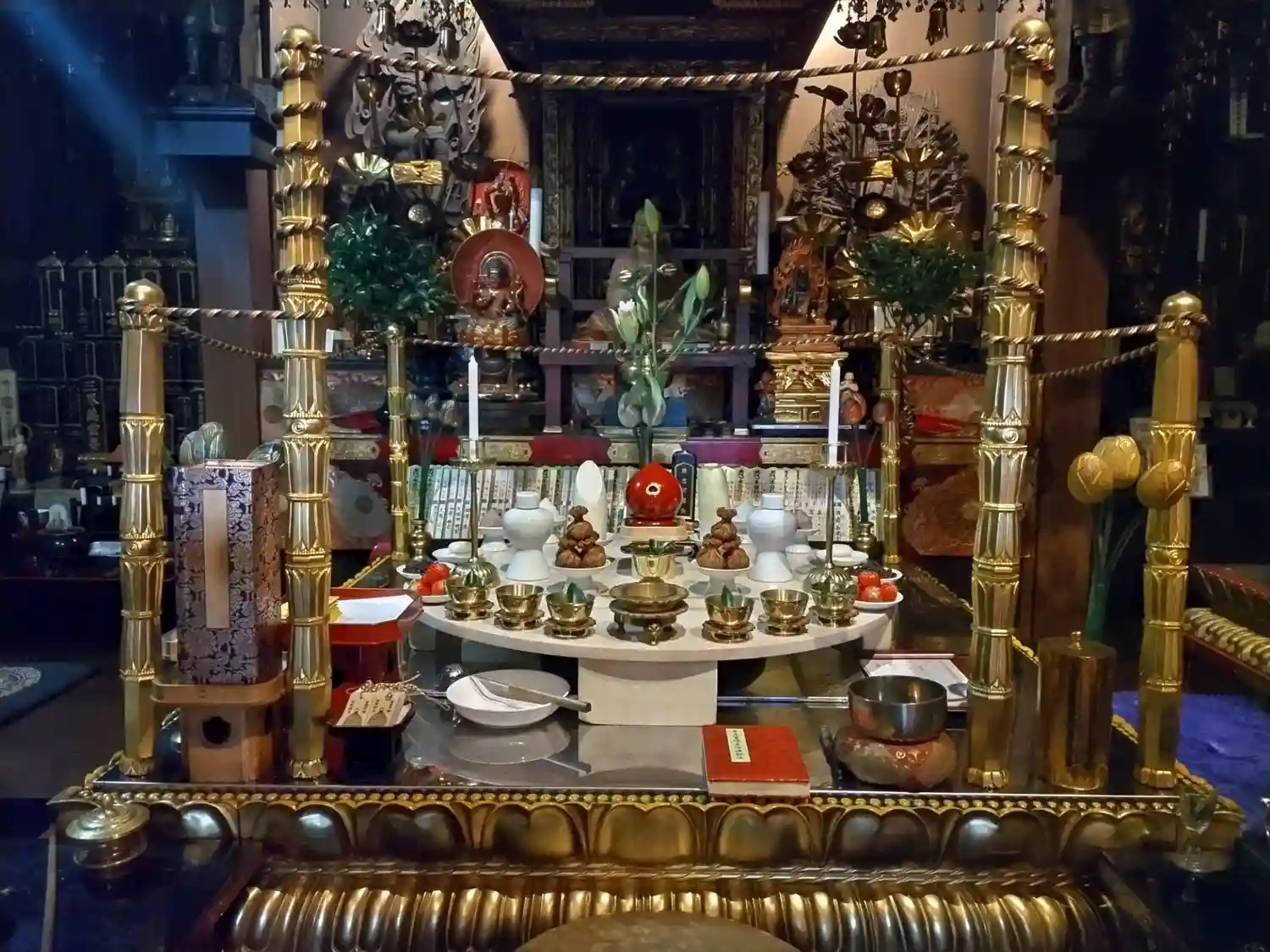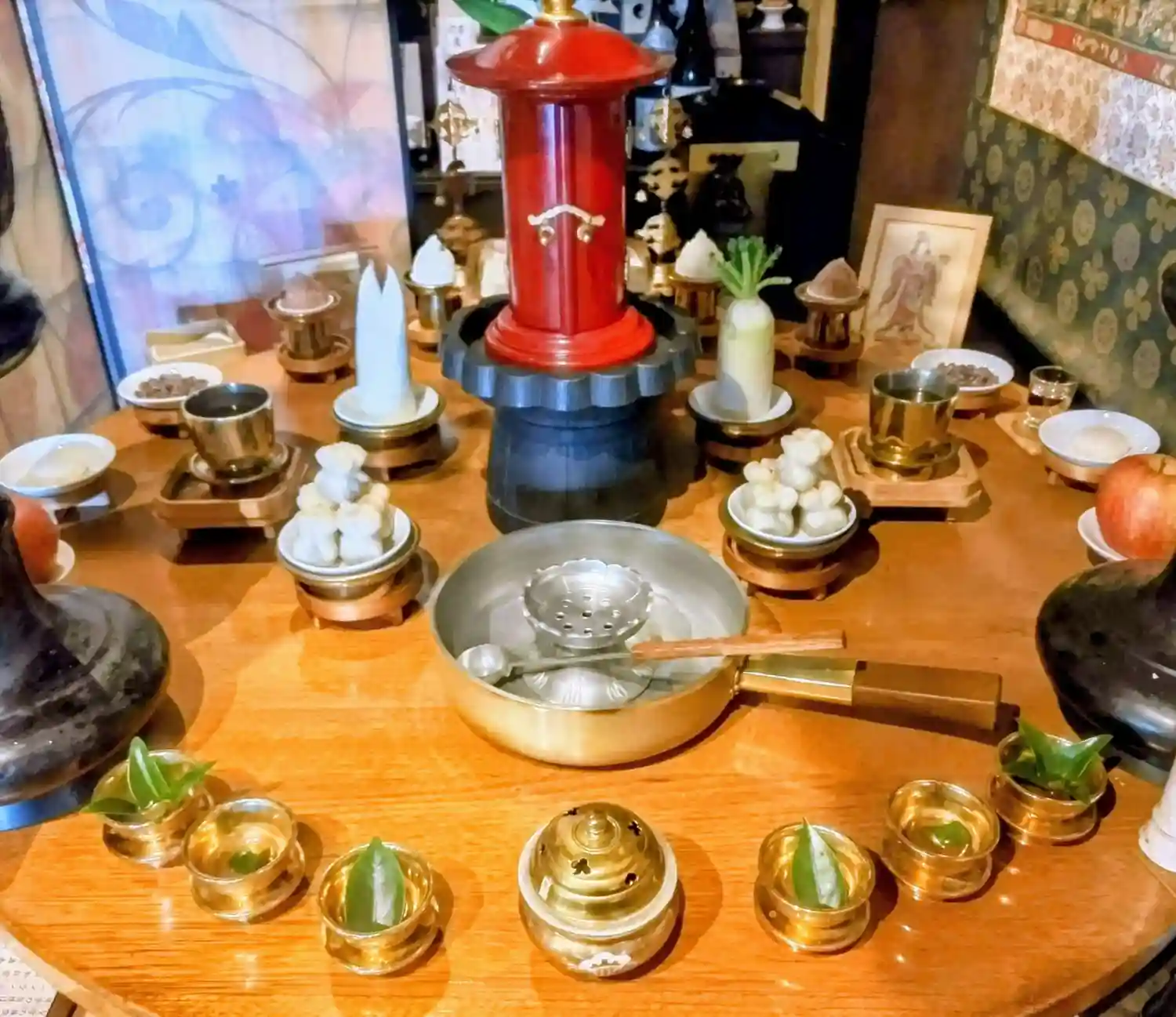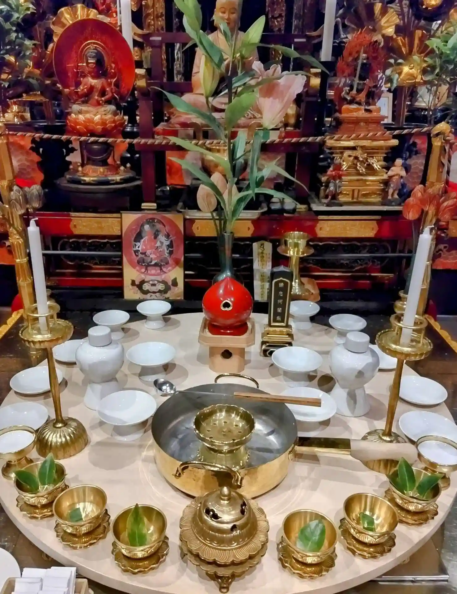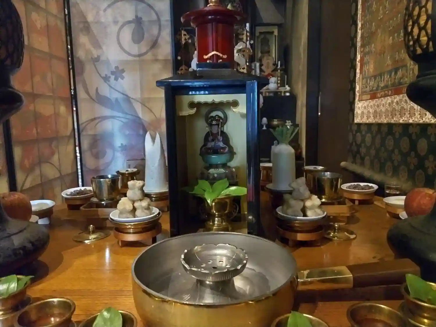 聖天壇。中央にタライを置き、秘仏聖天様の御尊体をお移しし、温めた油をお掛けして祈ります。