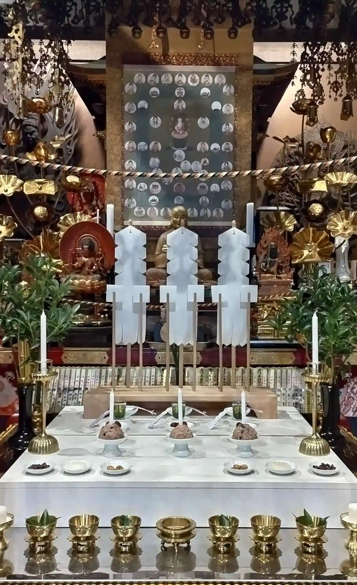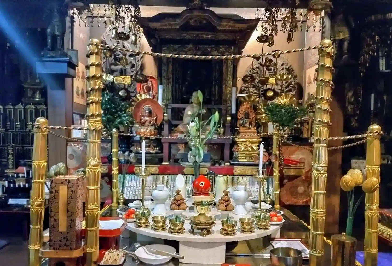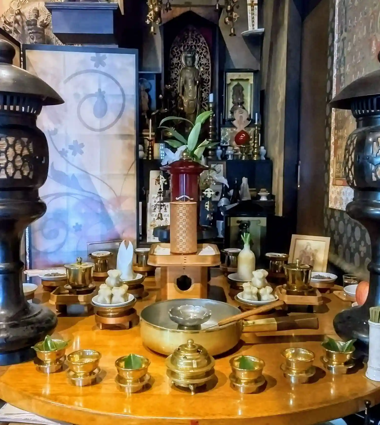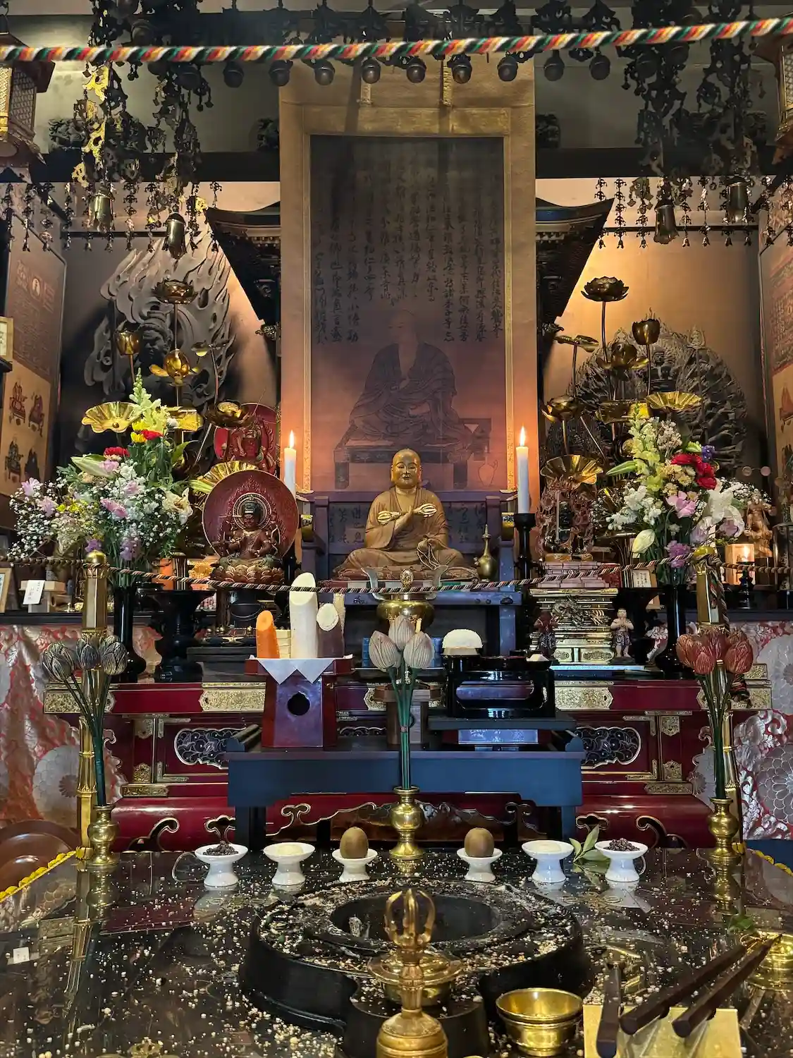 聖天壇。中央にタライを置き、秘仏聖天様の御尊体をお移しし、温めた油をお掛けして祈ります。
