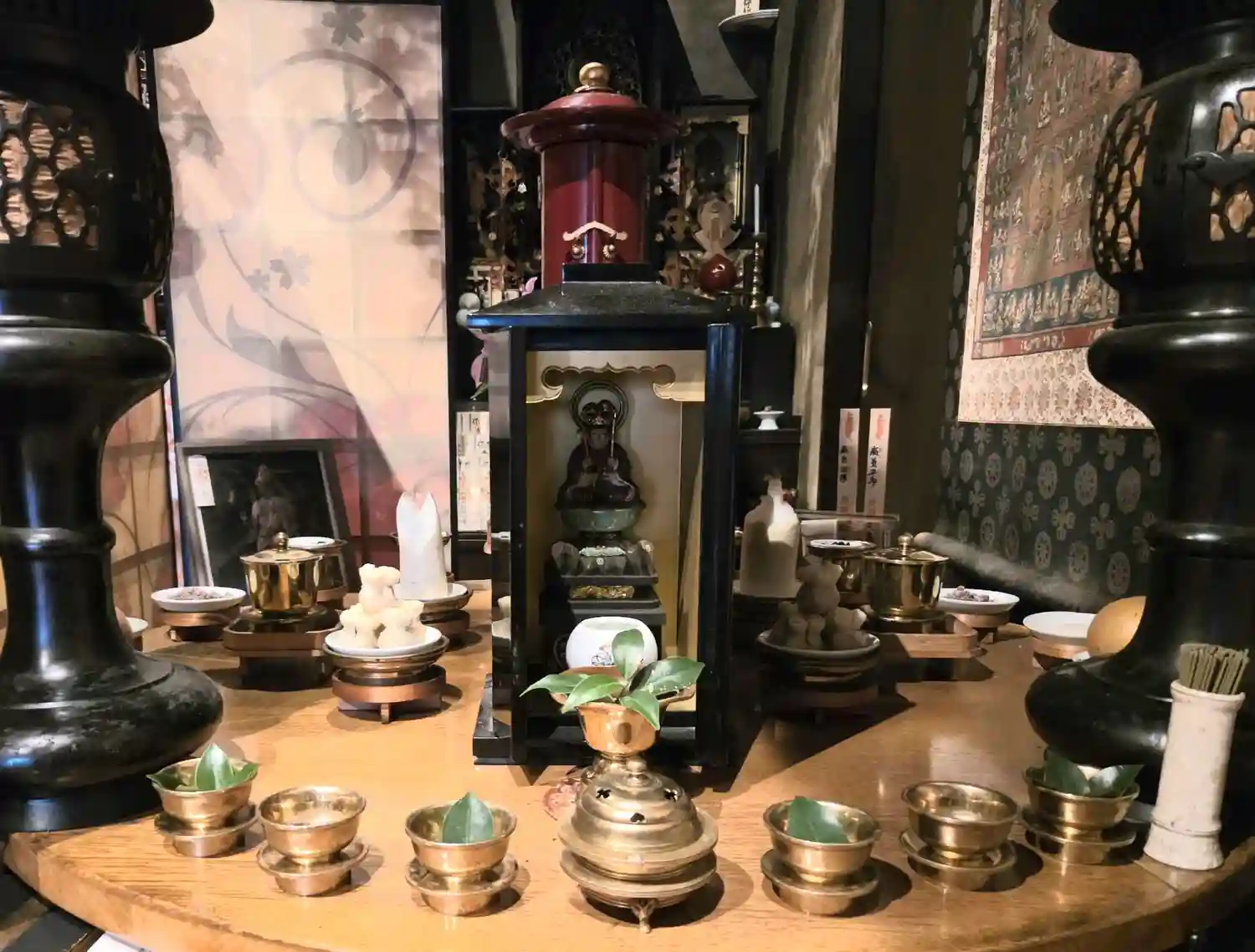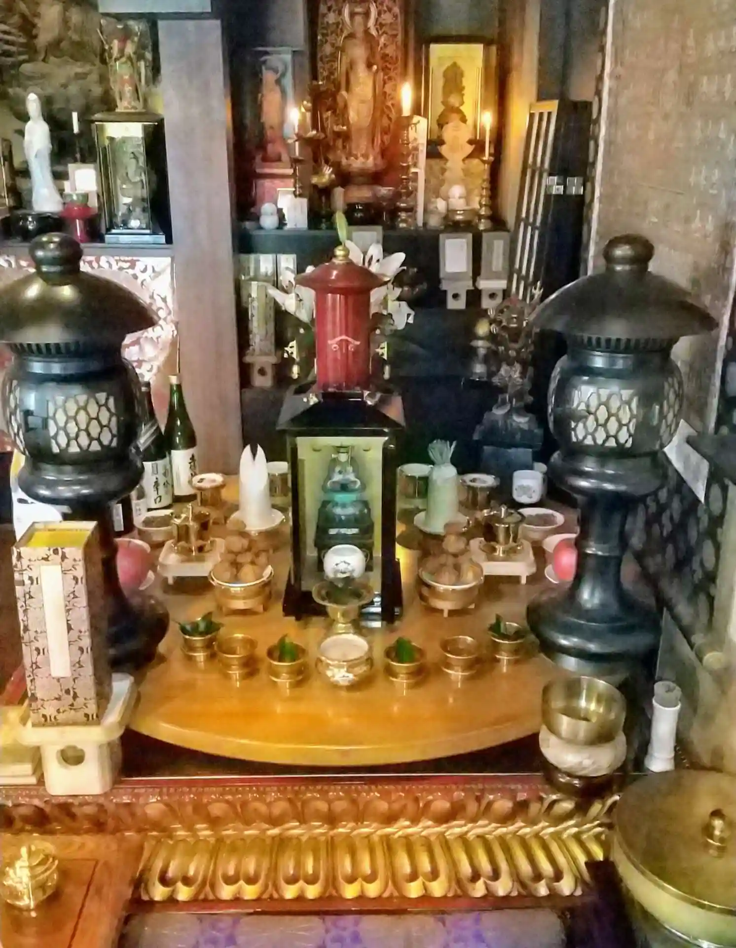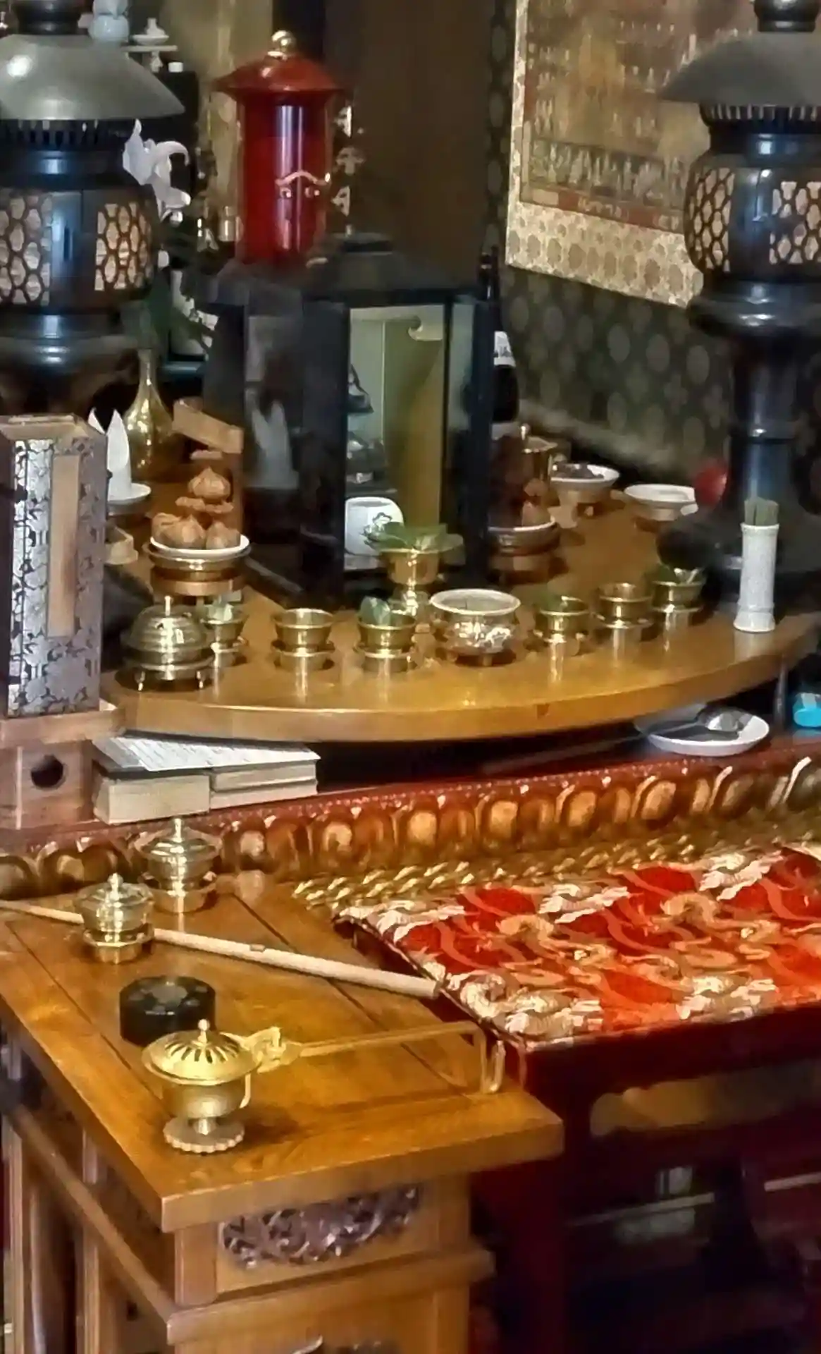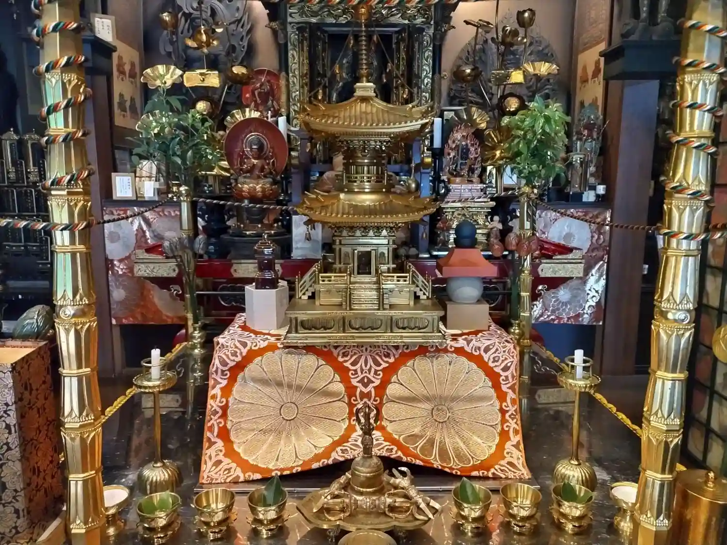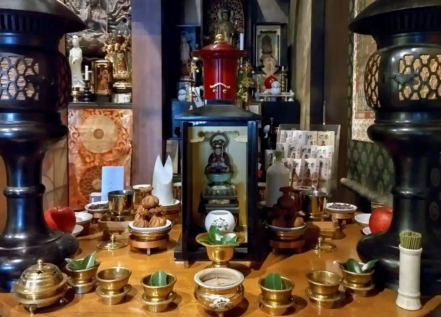 聖天壇。中央にタライを置き、秘仏聖天様の御尊体をお移しし、温めた油をお掛けして祈ります。