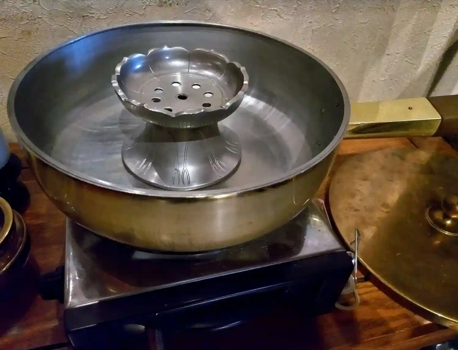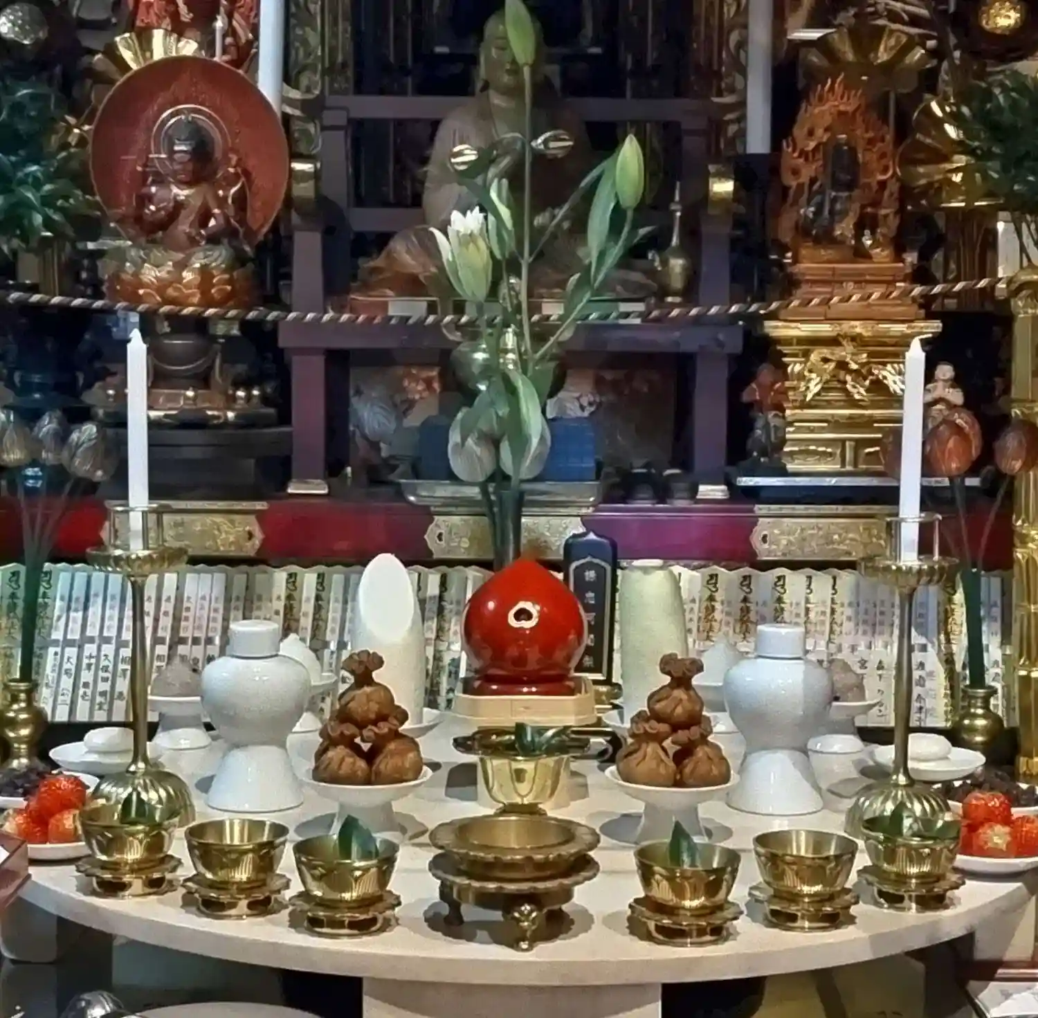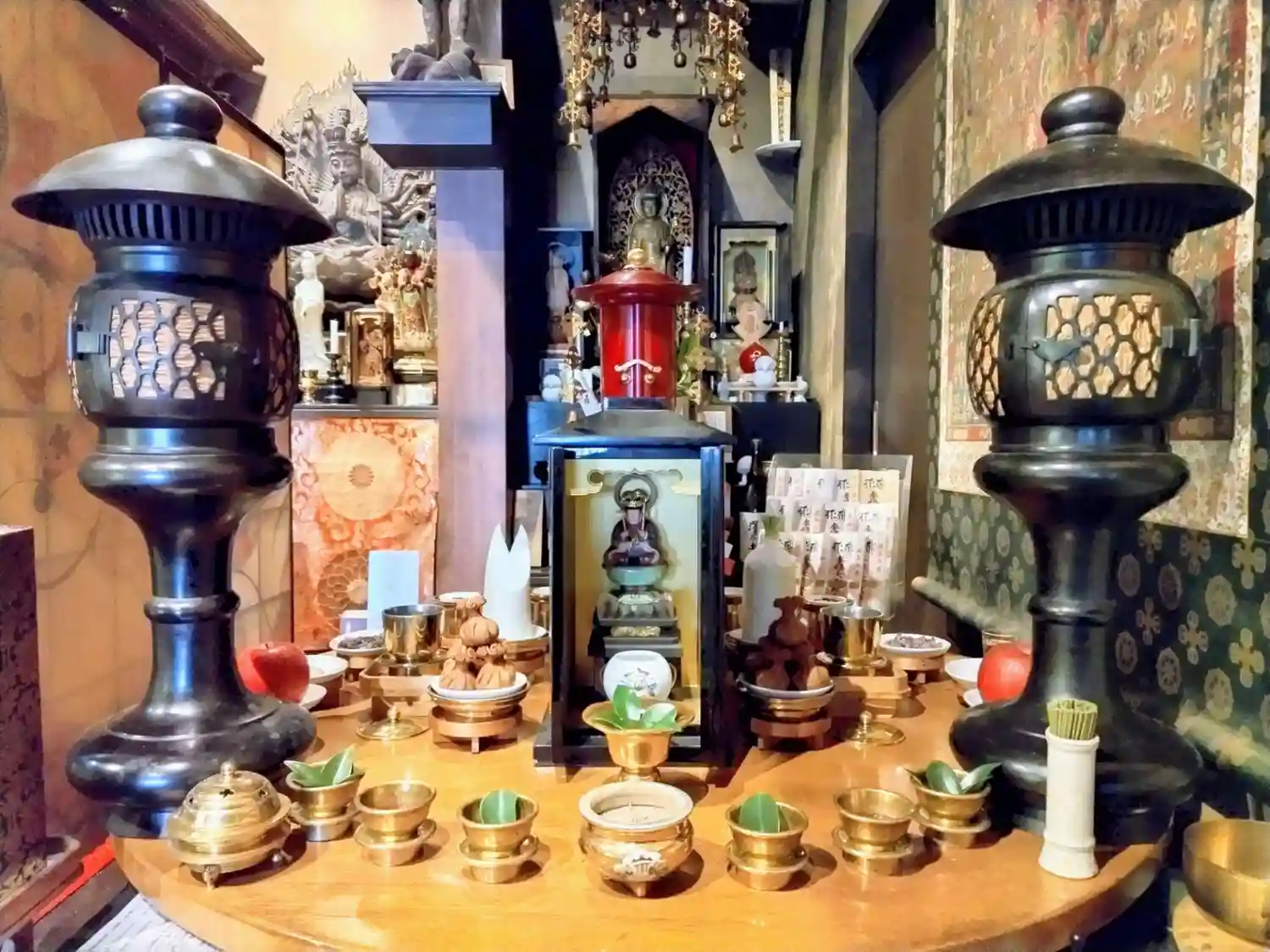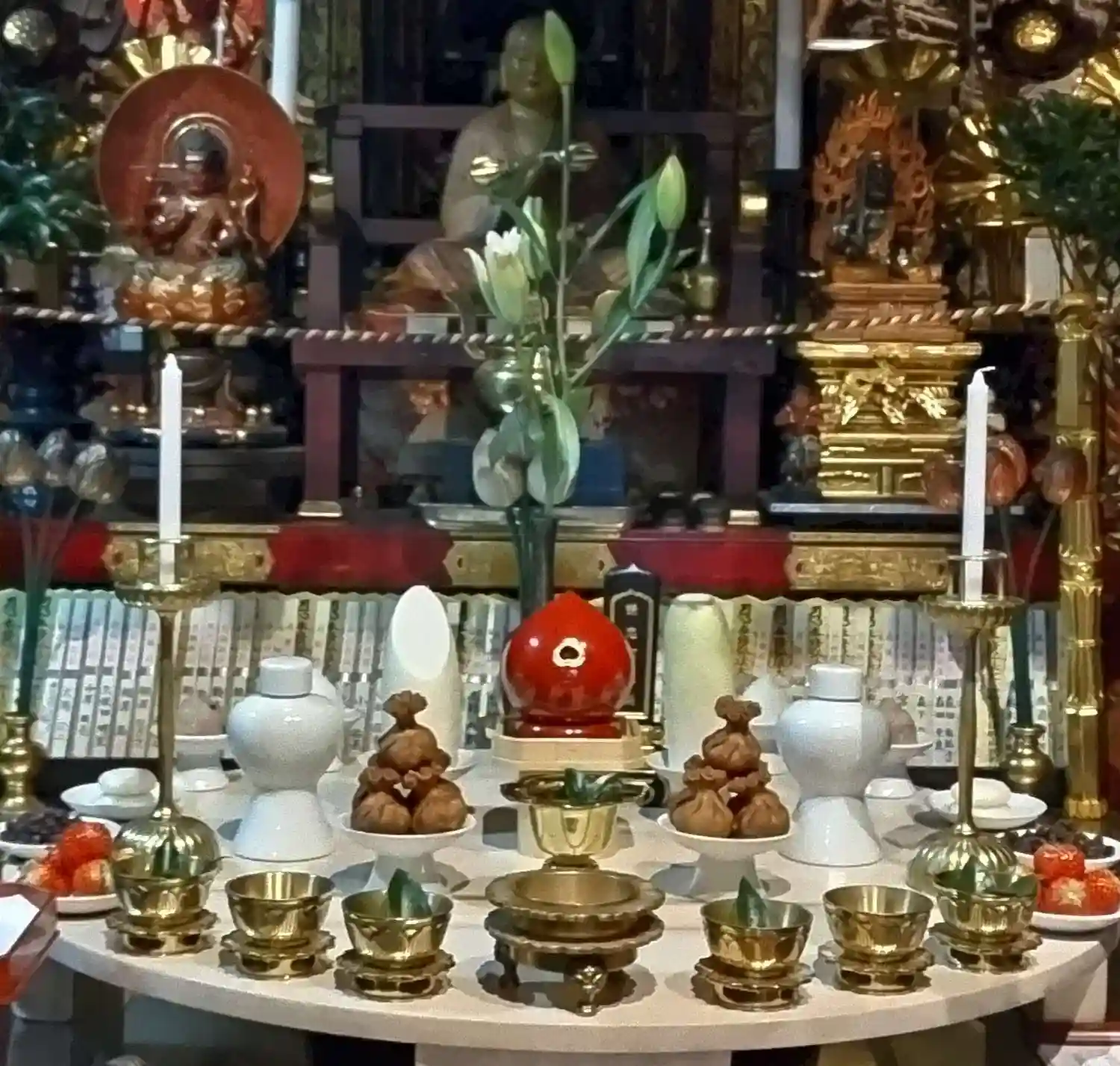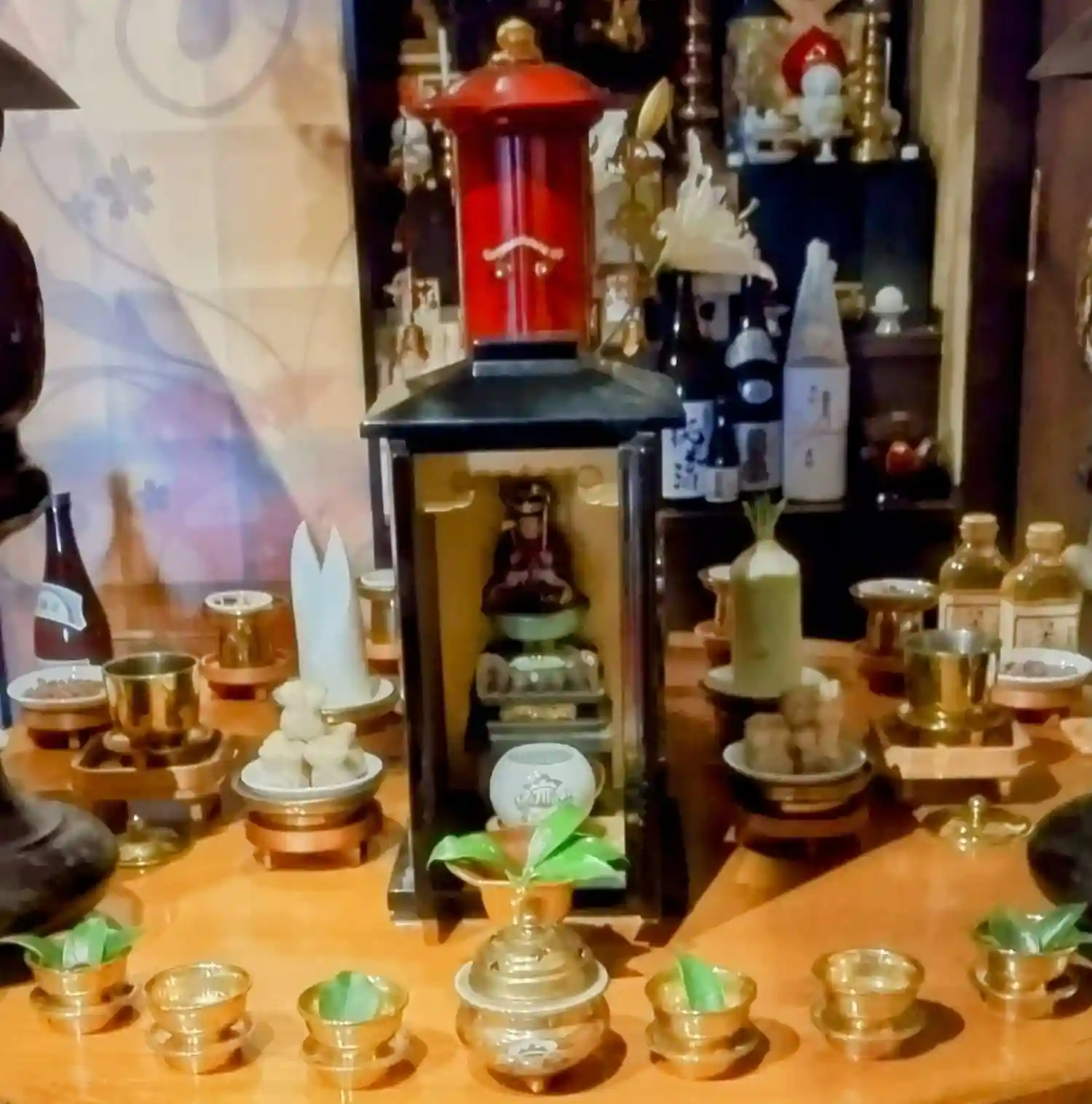 聖天壇。中央にタライを置き、秘仏聖天様の御尊体をお移しし、温めた油をお掛けして祈ります。