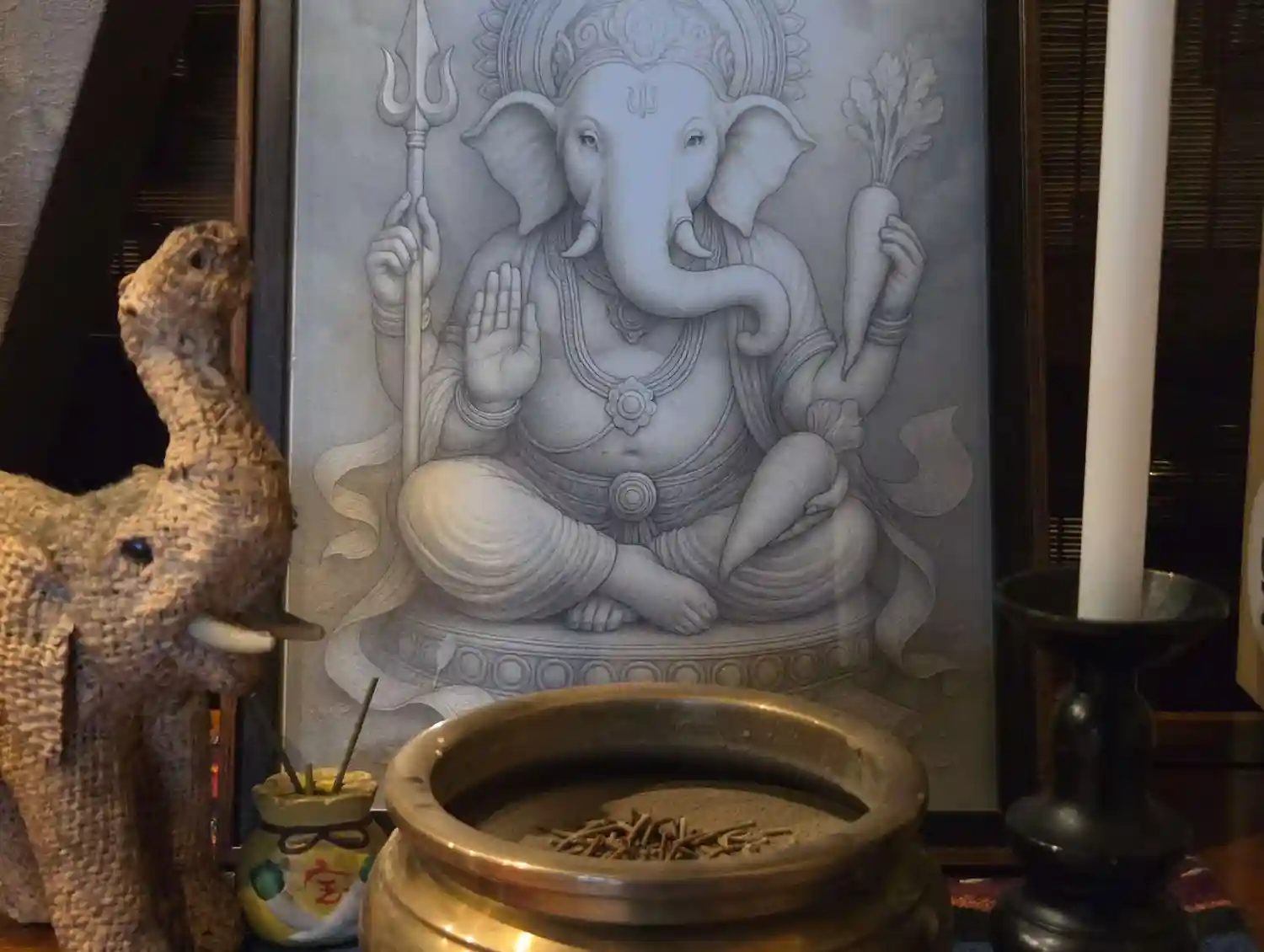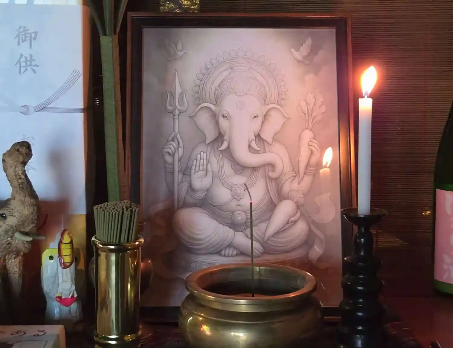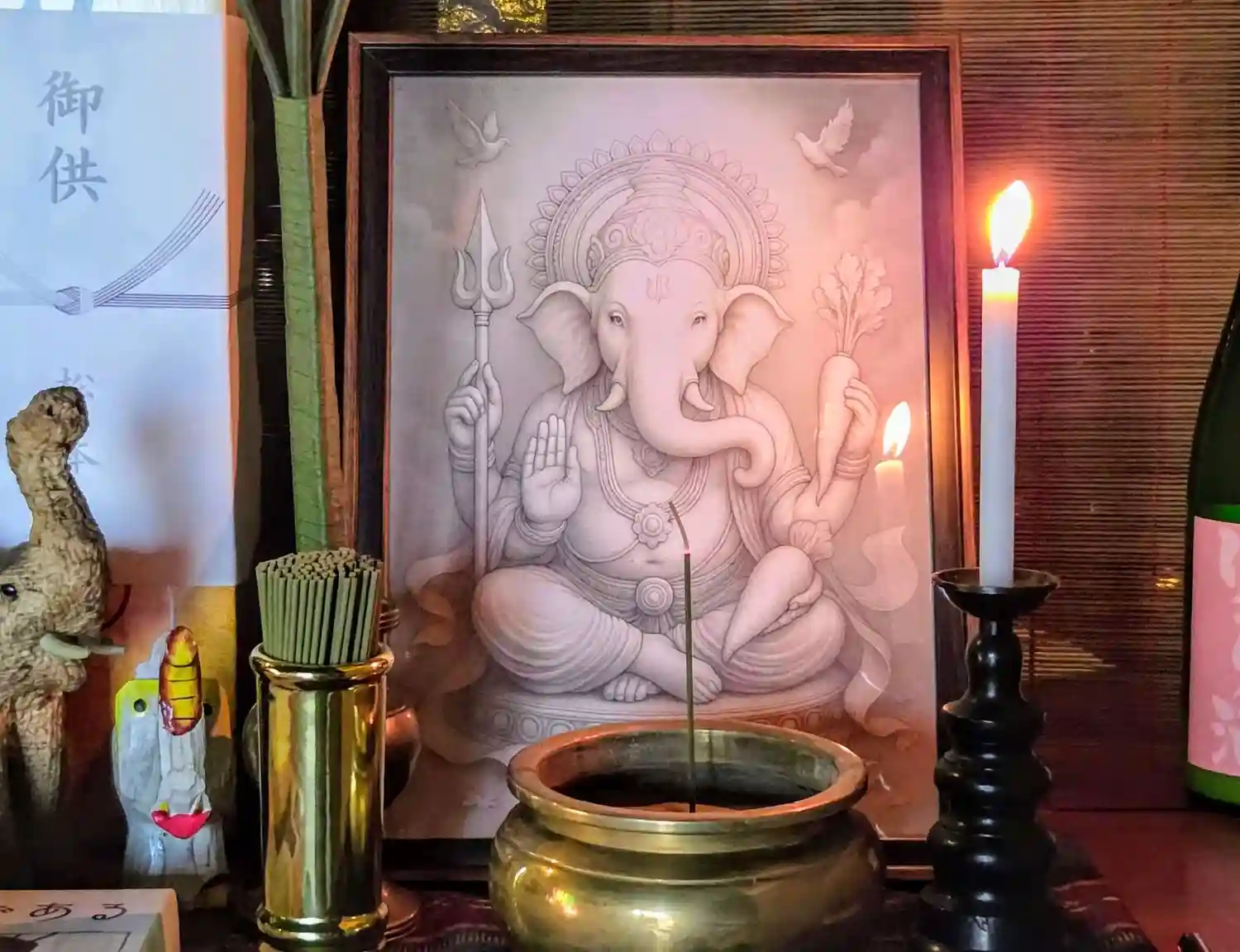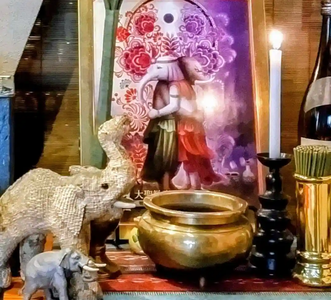 聖天様は観音様とガネーシャ(夢をかなえるゾウ)の合体(ごうたい)像です。