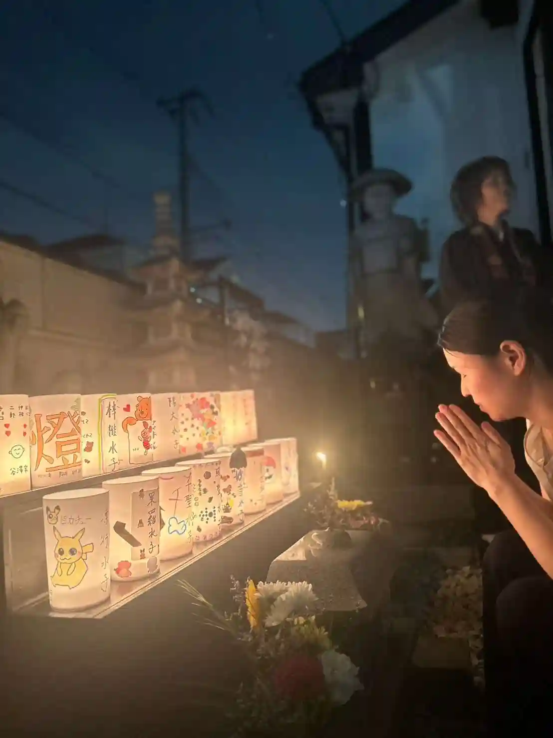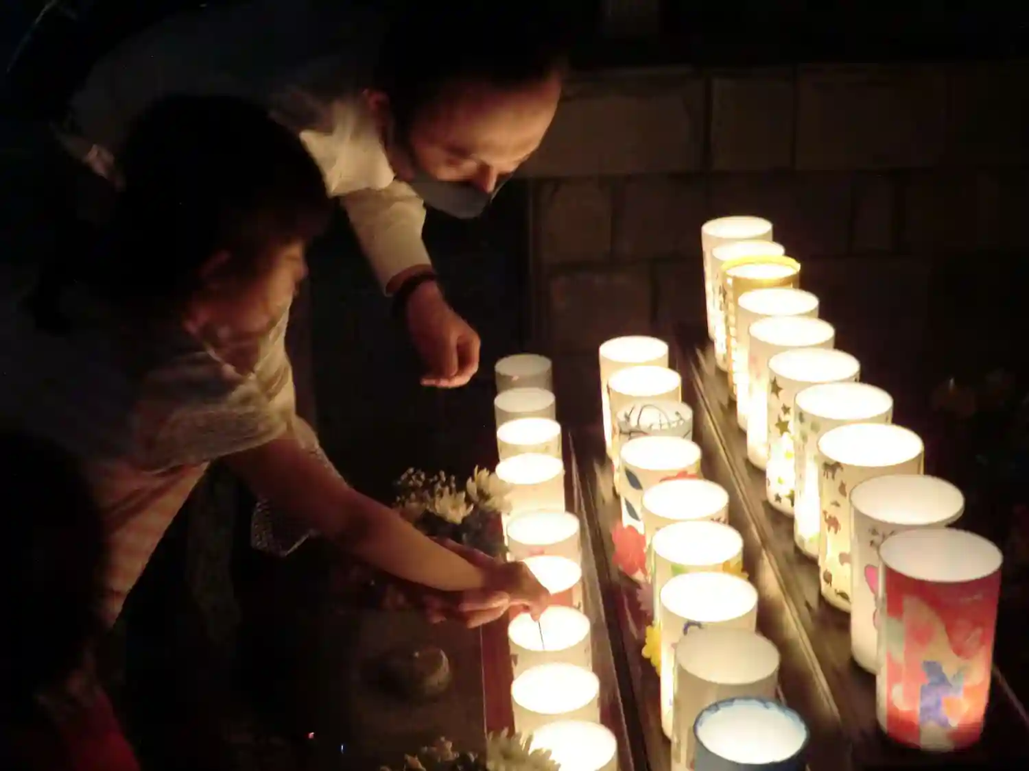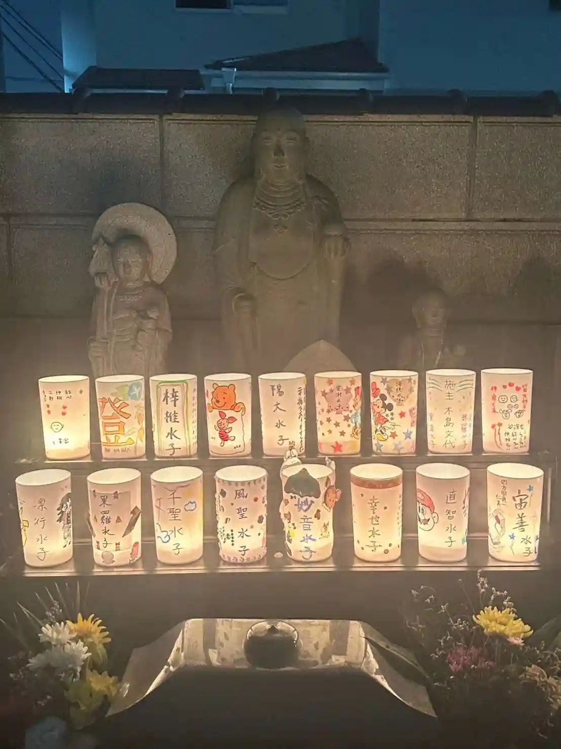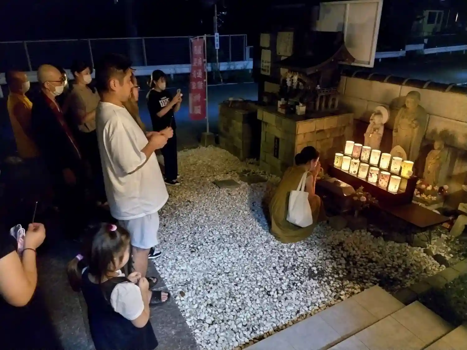 本堂にて供養後、ロウソクに灯りを灯します(外のお地蔵さまの前にて)。とても幻想的です。