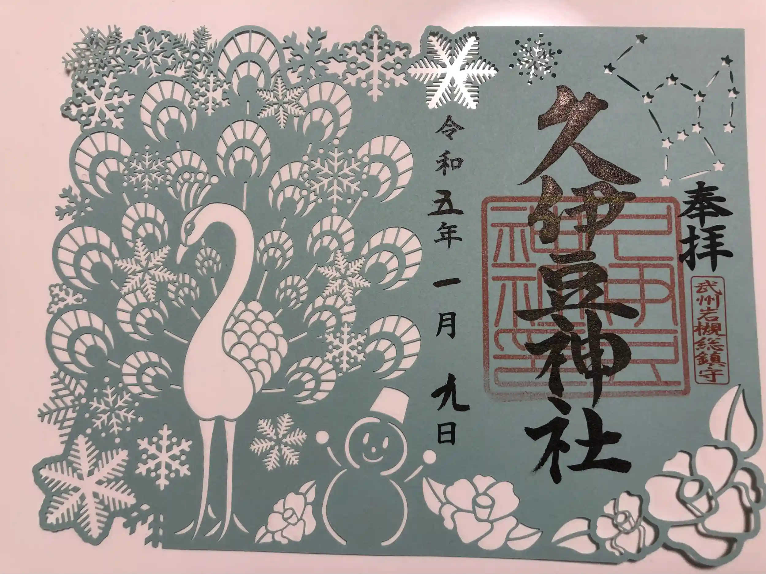 毎月九日の切り絵御朱印(孔雀と雪だるま)