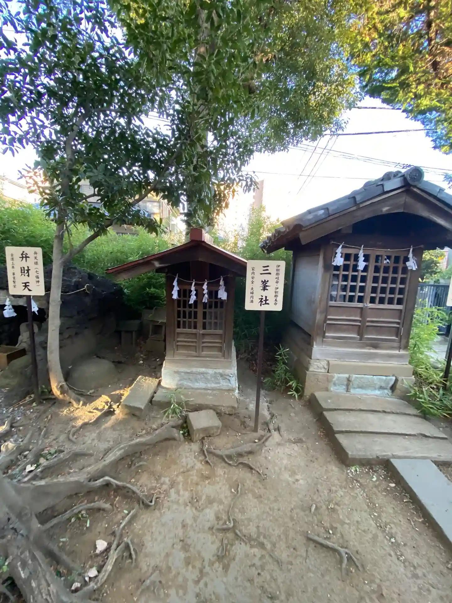 根元が繋がっている二本の楠の木(夫婦楠)や江戸時代、力比べに使われたとされる力石💪