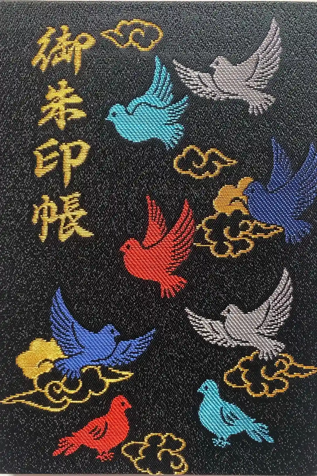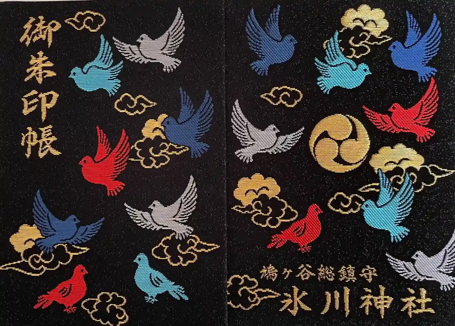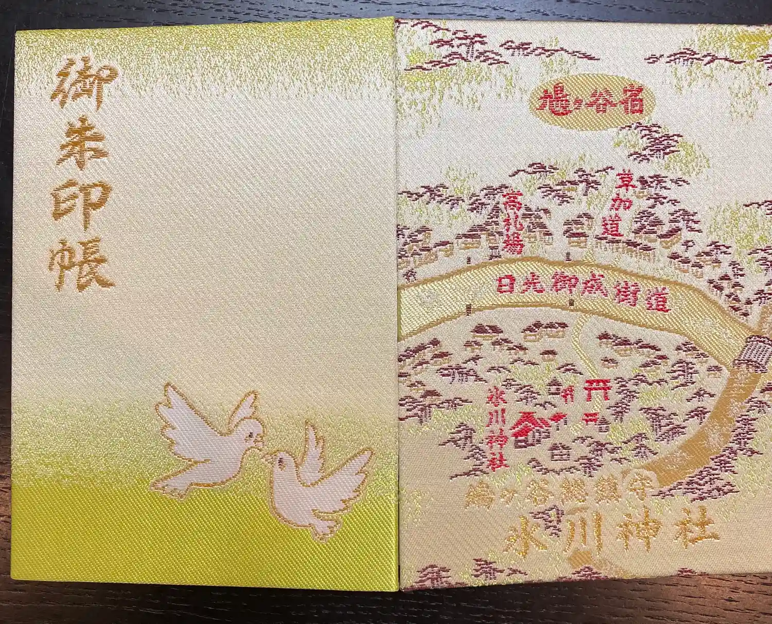 色味がかわいい鳩の御朱印帳。裏に書いてある古地図風の刺繍もお気に入りです。