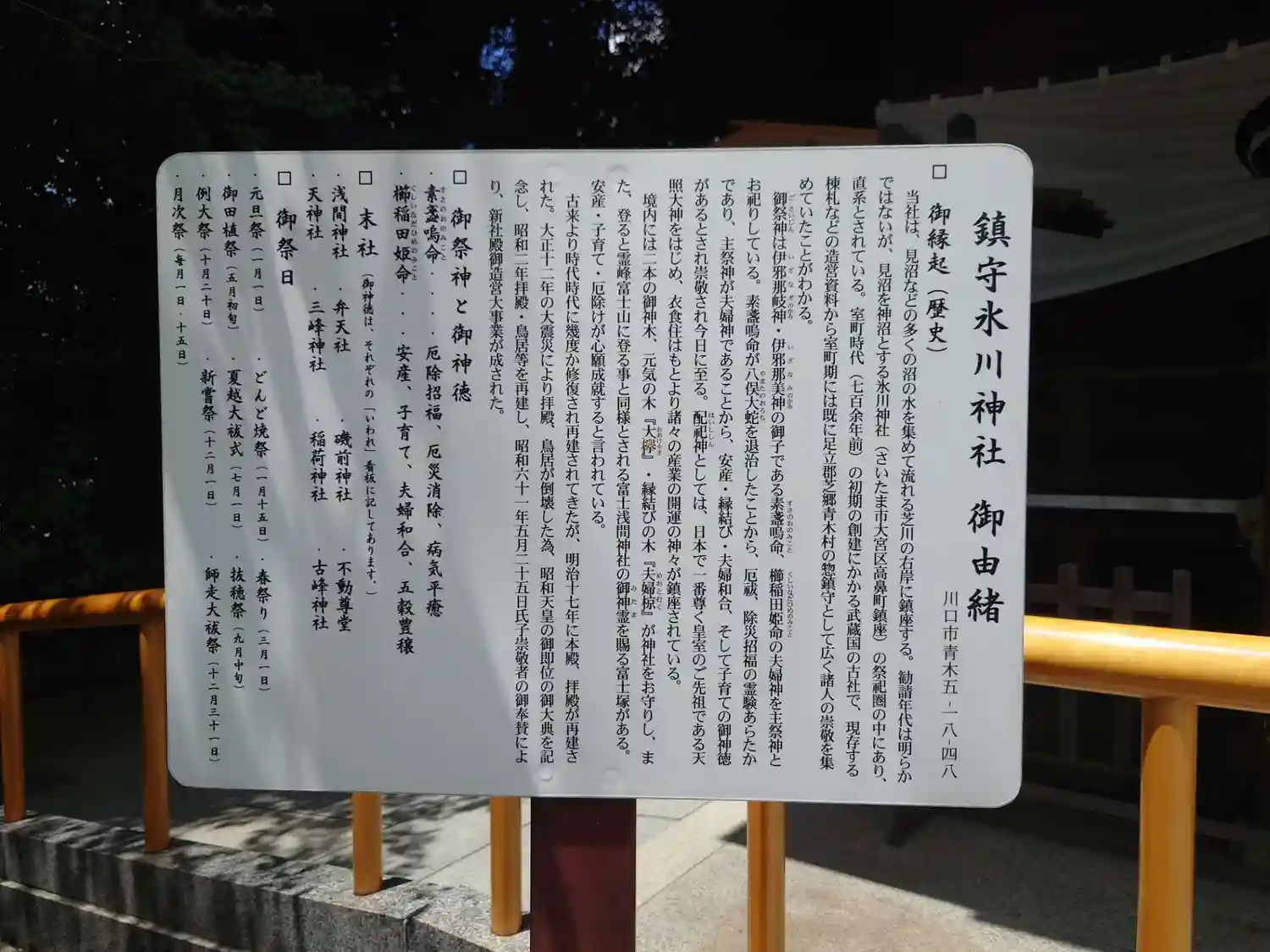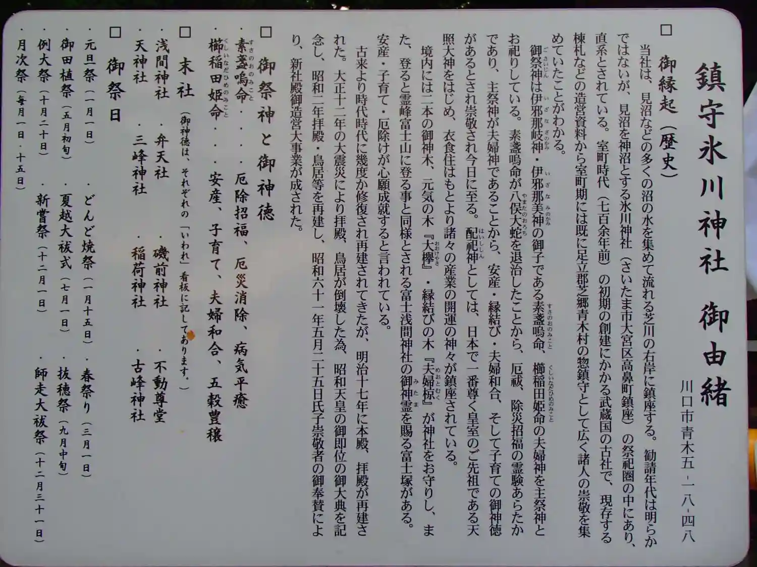 | ご祭神 | 《主》素盞嗚命,櫛稲田姫命,《配》天照皇大神,倉稲魂命,手力雄命,面足命,惶根命,菅原道真,建御名方命,保食命 | |