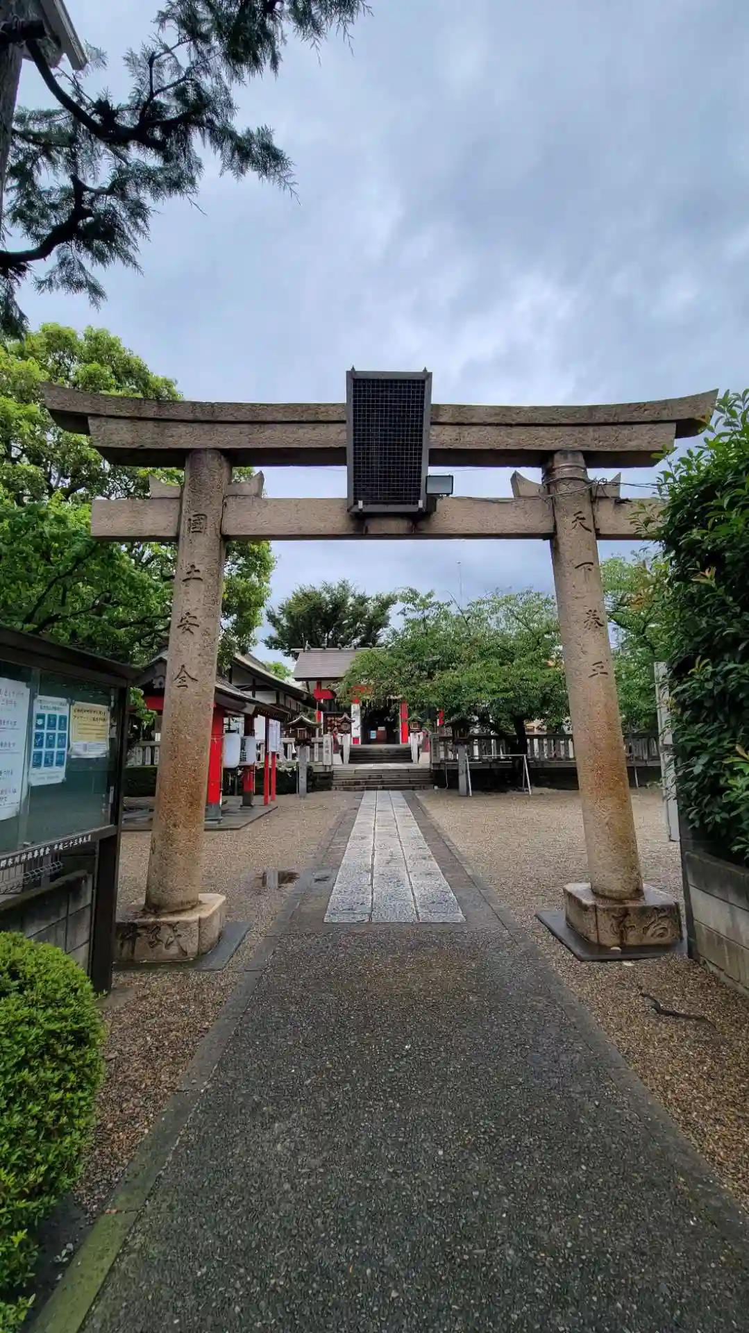 参道を進むと<鳥居>。扁額は木製なのか、保護用の金属枠が嵌っていて、字は読めない。