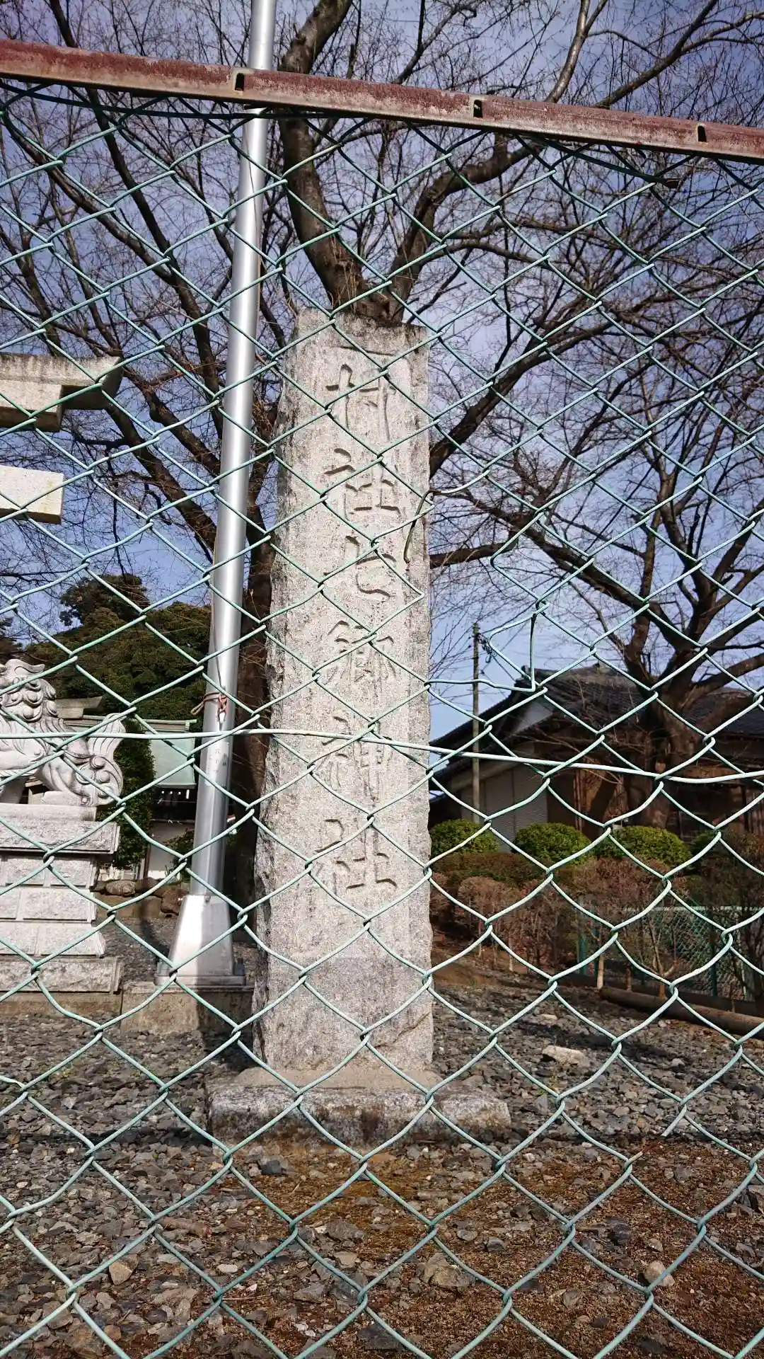 境内入口に<一の鳥居>。社号標はなく、石製扁額で識別。両サイドの狛犬は割と新しそう。