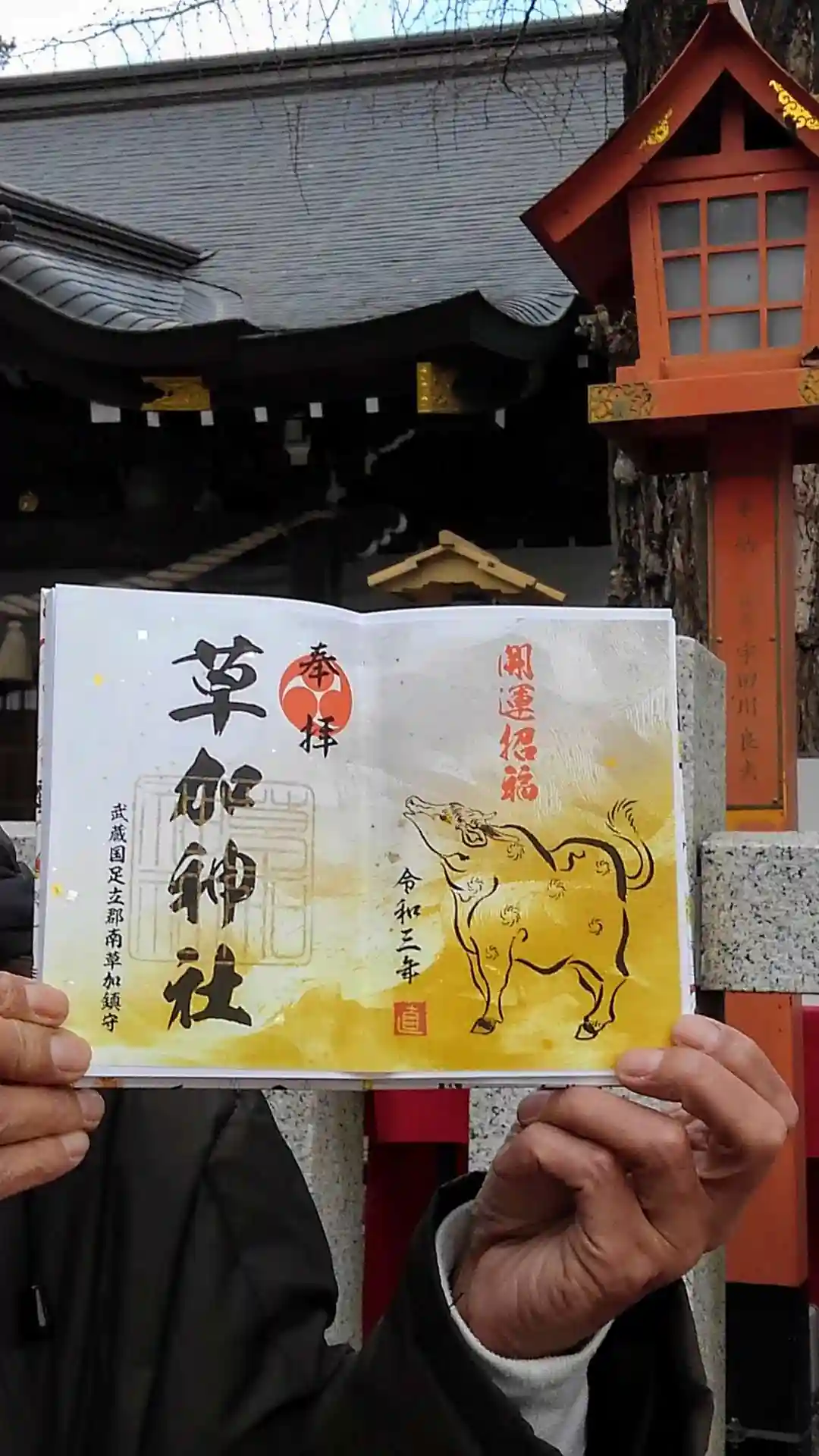 草加駅からほど近い町中の静かな神社です。今日はまだ混雑緩和のためいつもの駐車スペースは使用出来ません。近くのパーキングに車を停めました。御朱印は新年に相応しい素敵なデザインでした。