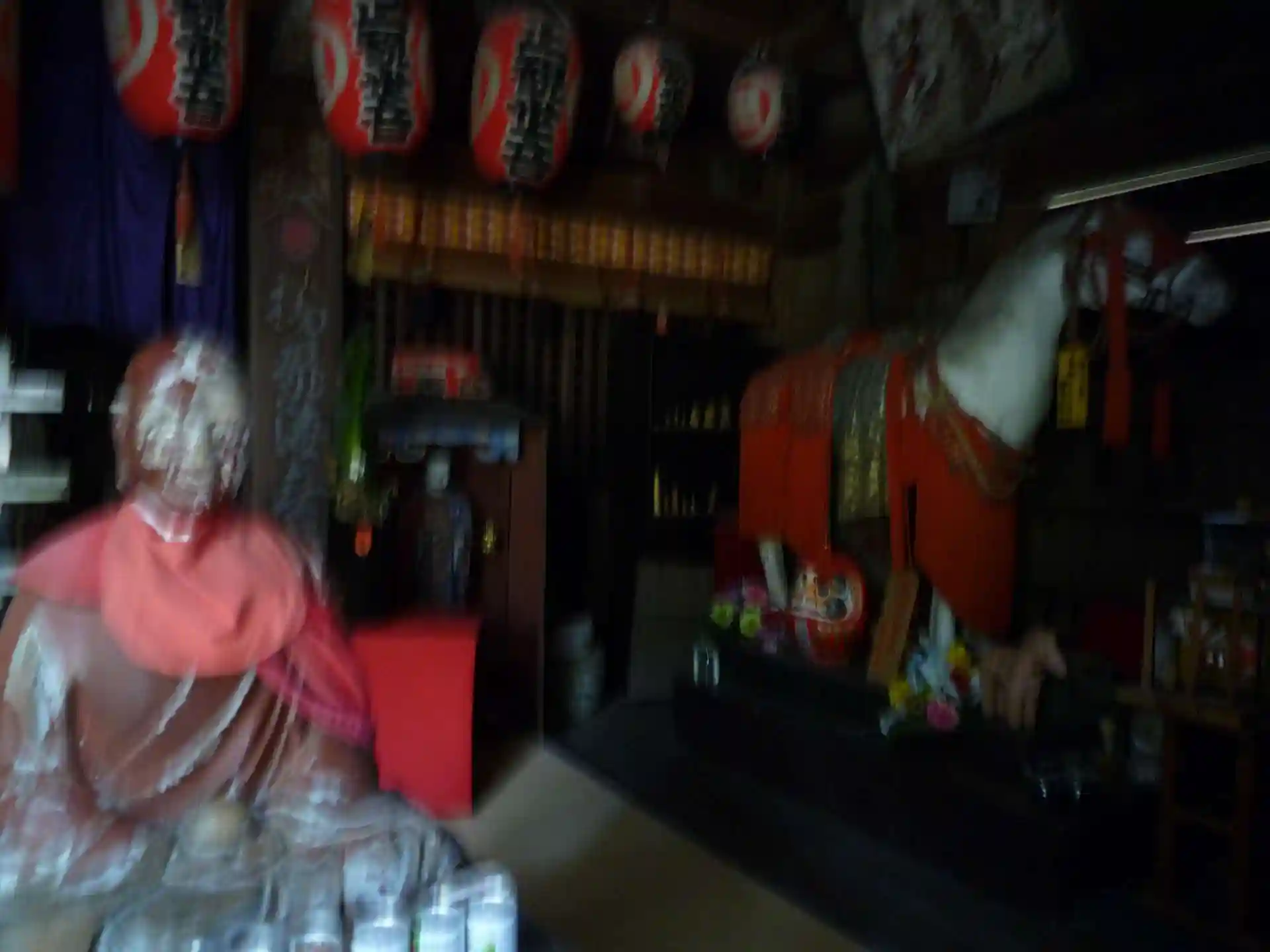堂内のへん額、格子天井、ご神馬像、びんずるさん?、お不動様、等々たいへん賑やか