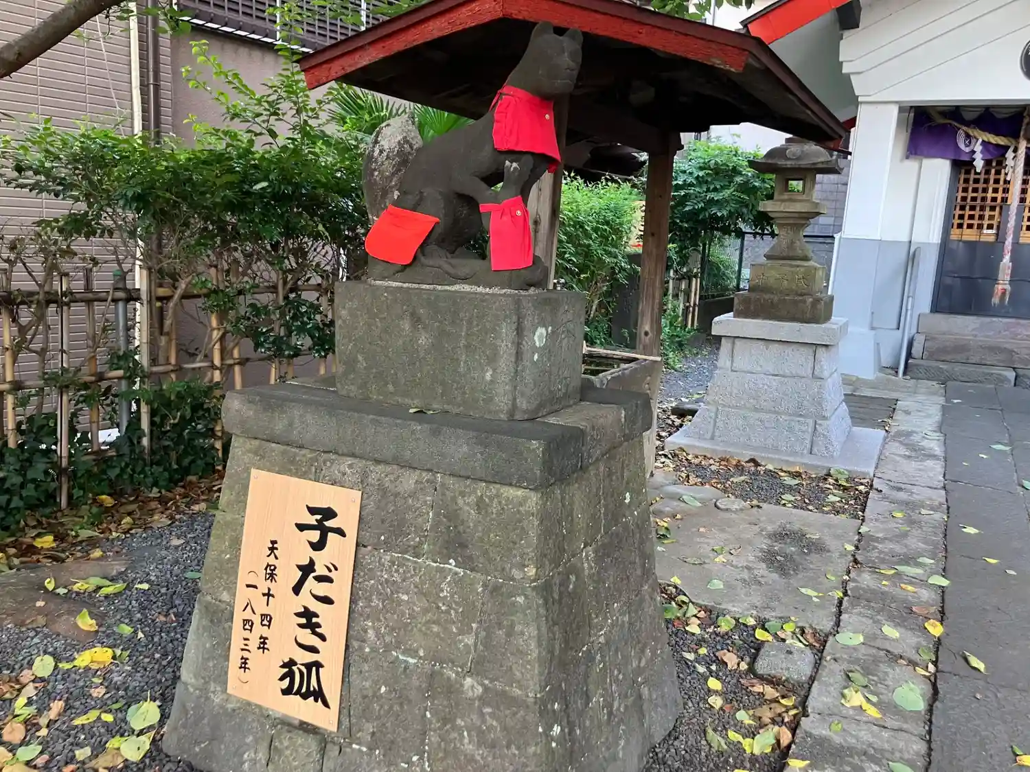 お狐さんの表情がとても優しいです。神社前は交通量の多い道路なのですが…鳥居を一歩入ると子抱きのお狐…