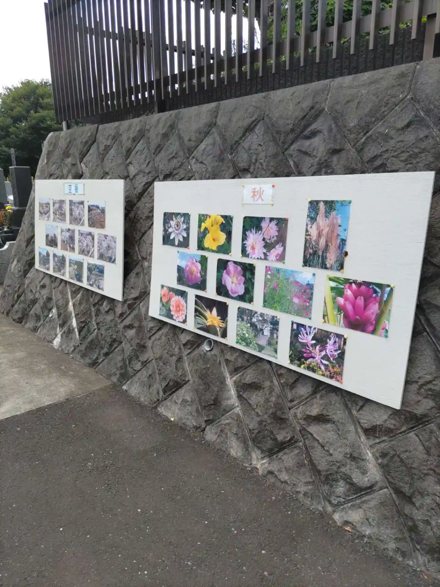 境内、お墓入口に春夏秋冬の季節写真展。