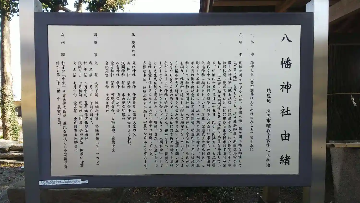 | 創建時代 | 八幡宮 江戸初期の創建 境内社の愛宕神社は白鳳年間の勧請 | |