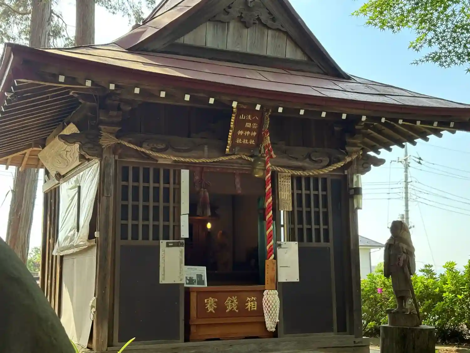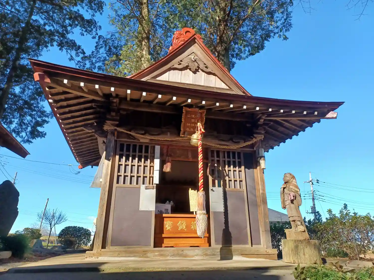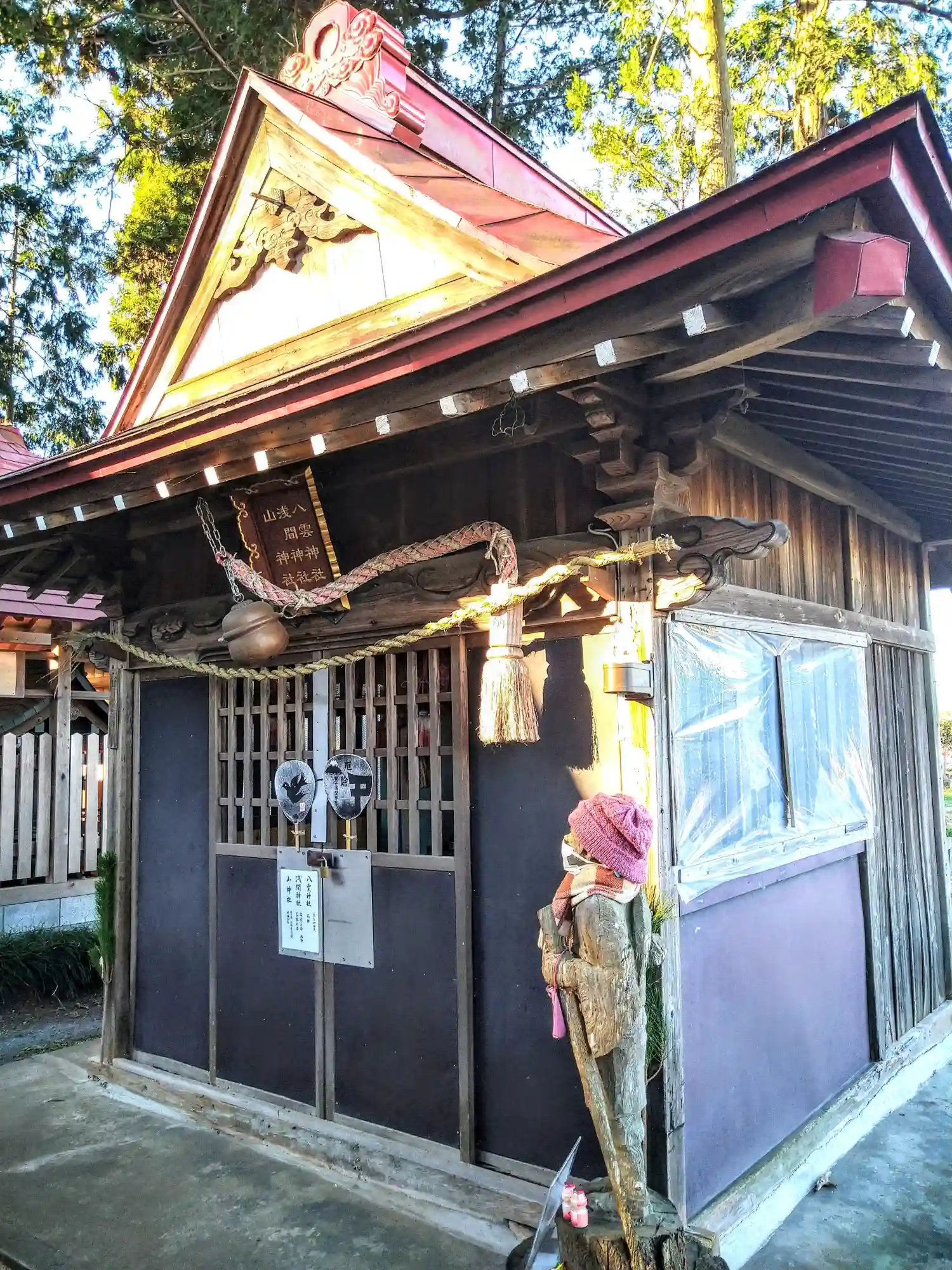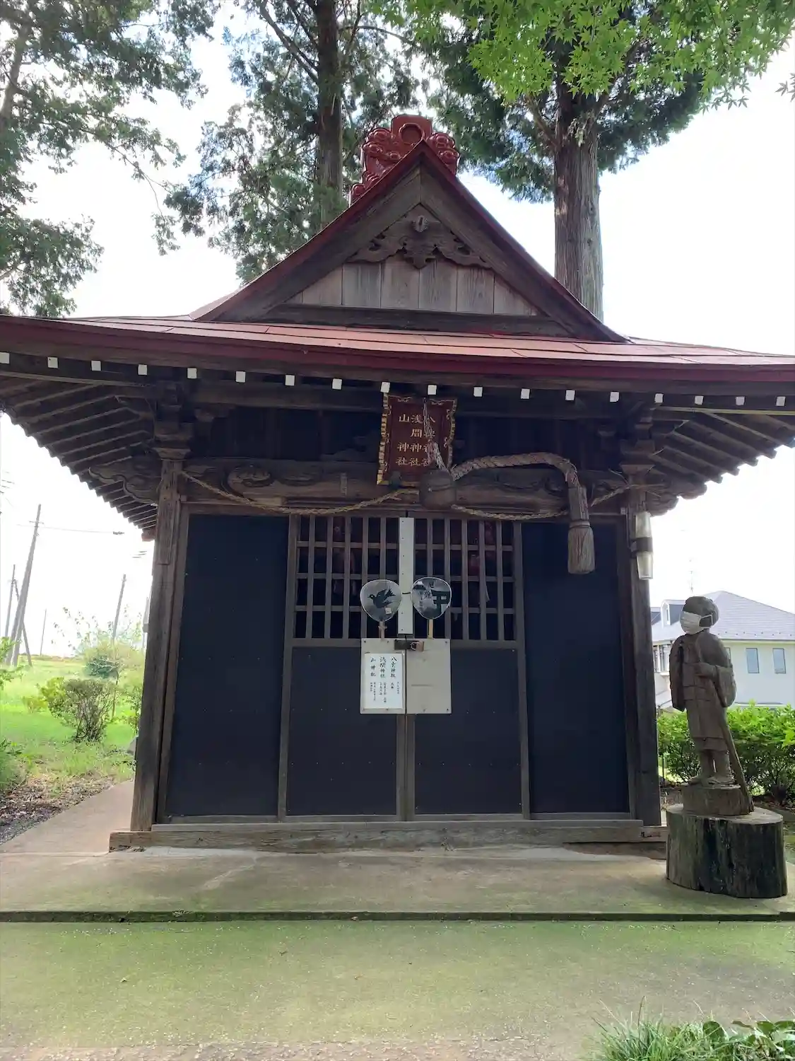 左脇の女の子は、境内社「浅間神社」の前にあり、いつも参拝者を見守ってくださっている女の子の彫り物(チェーンソーの作品)です。