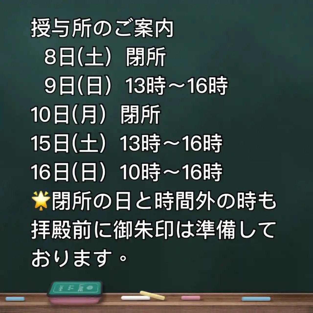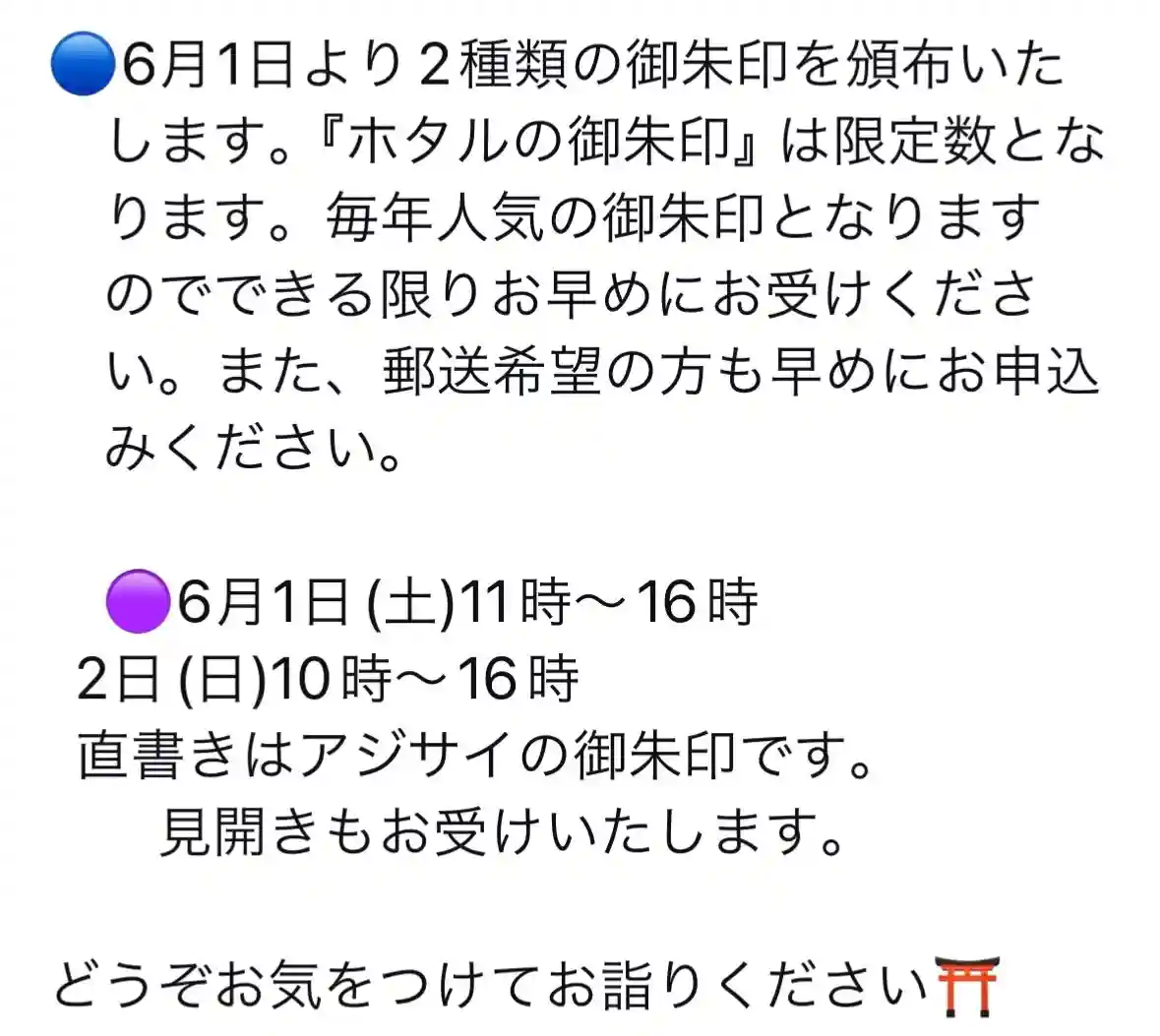 御朱印は授与所の開閉に関わらず、拝殿前に用意してありますので、宜しい日にご参拝ください。ホタルの御朱印帳ご希望の方は開所の日にお越しください。